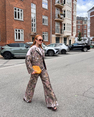 Denne jakke har et elegant blomsterprint, der tones ud ved skuldrene. Jakken har en løs pasform med lommer og en dobbeltradet knaplukning. Fås i farven sand.