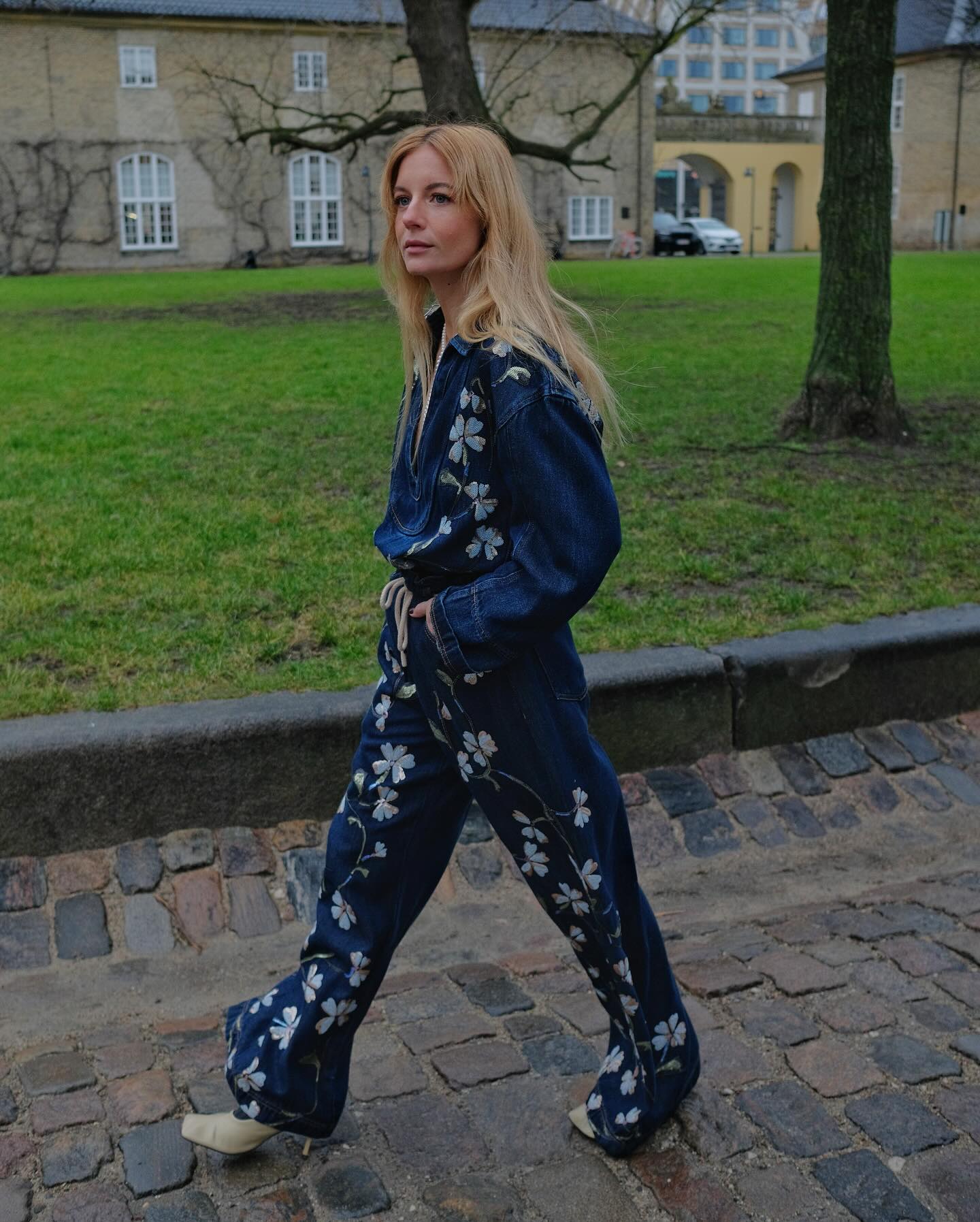 En elegant denim kjole med et smukt blomster mønster. Denne kjole har en dyb v-udskæring, og er designet med store sidelommer og små slidser på hver side af kjolen.