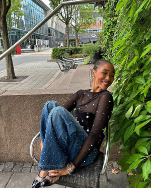 Jeans med smukke perle detaljer og brede ben. Bukserne er designet med for- og baglommer og lukkes med en lynlås, og en enkelt knap. Fås i farven indigo.