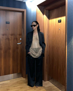 Mellemlang elegant net kjole med smukke små glitrende sten. Kjolen har rund hals og rå kanter forneden. Fås i farven natur.