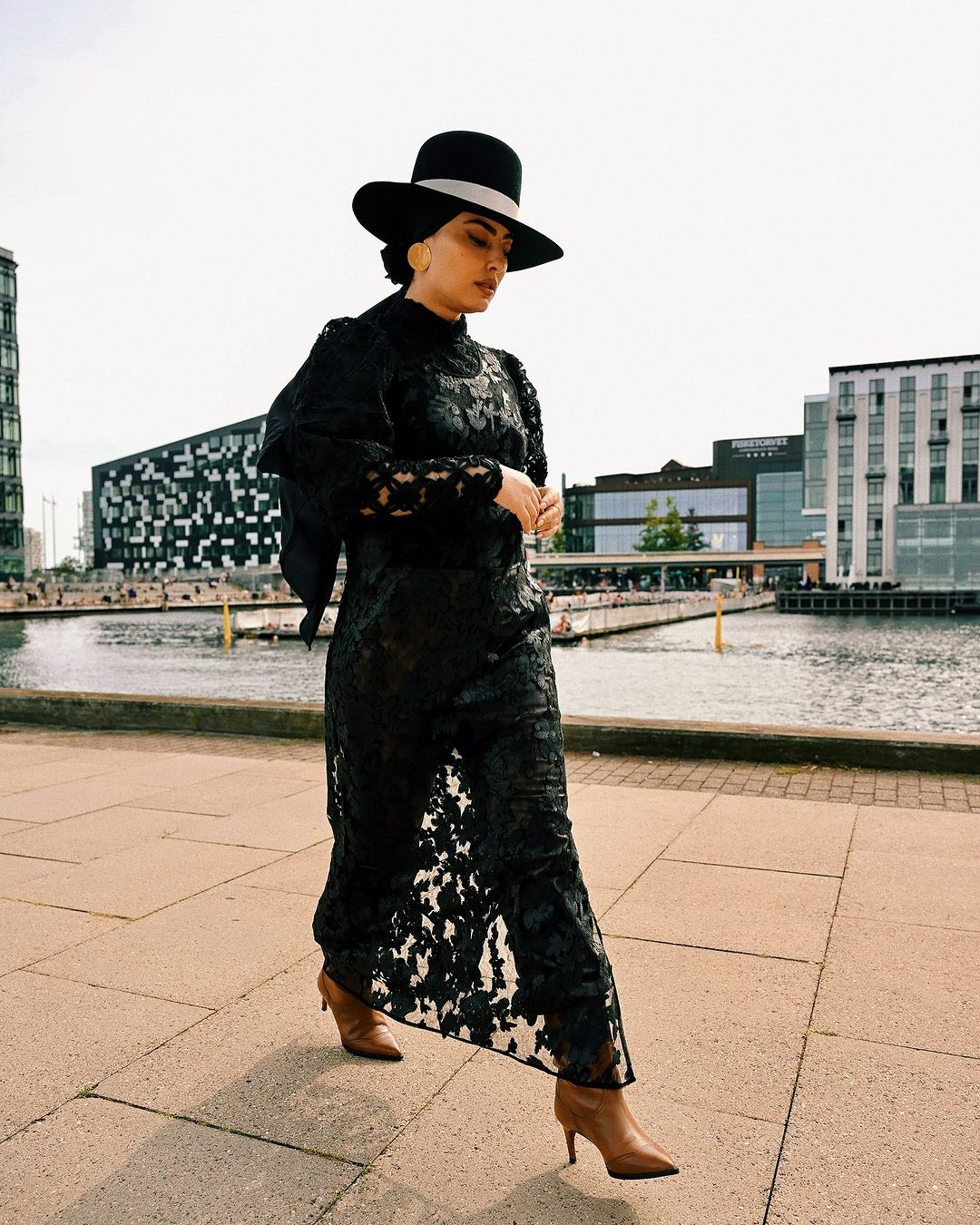 En lang gennemsigtig kjole med et smukt paillet mønster og en elegant kort underkjole. Underkjolen kan fjernes ved hjælp af knapper, for alsidige styling muligheder. Kjolen er designet med en rund halsudskæring og en normal pasform. Fås i farven sort.