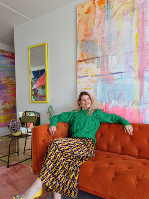 Jeg er materiale freak. Jeg elsker lækre tekstiler, og er altid frisk på en god genbrugsbutik. Her finder jeg de smukkeste kvaliteter, en silkeskjorte fra 80’erne bliver til et silkemaleri...
