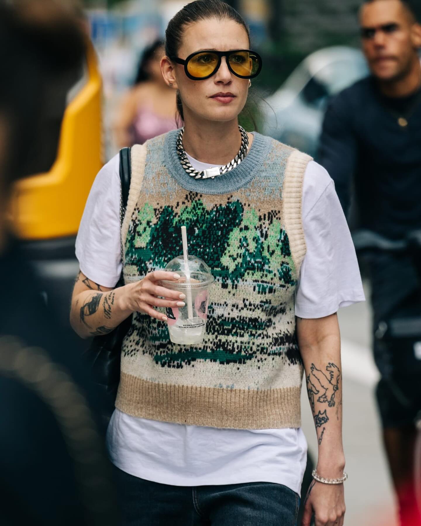 En smuk strikket vest med et elegant landskabsmønster. Vesten har en rund hals og en rib-afslutning langs kanterne.