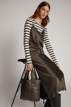 Smukt mellemlang kjole med stropper. Kjolen er lavet i en elegant og blød viskose blanding. Fås i farverne sort, camel eller army.