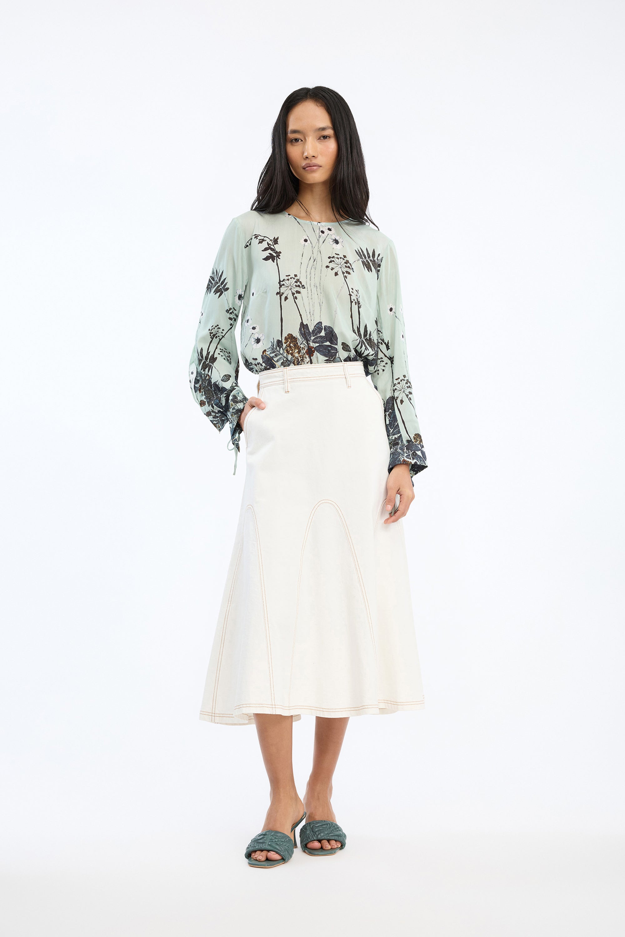 Top med et flerfarvet, botanisk print, lange ærmer med små bindedetaljer ved håndleddene. Modellen har en rund udskæring med bindedetalje i nakken og en lige silhuet.