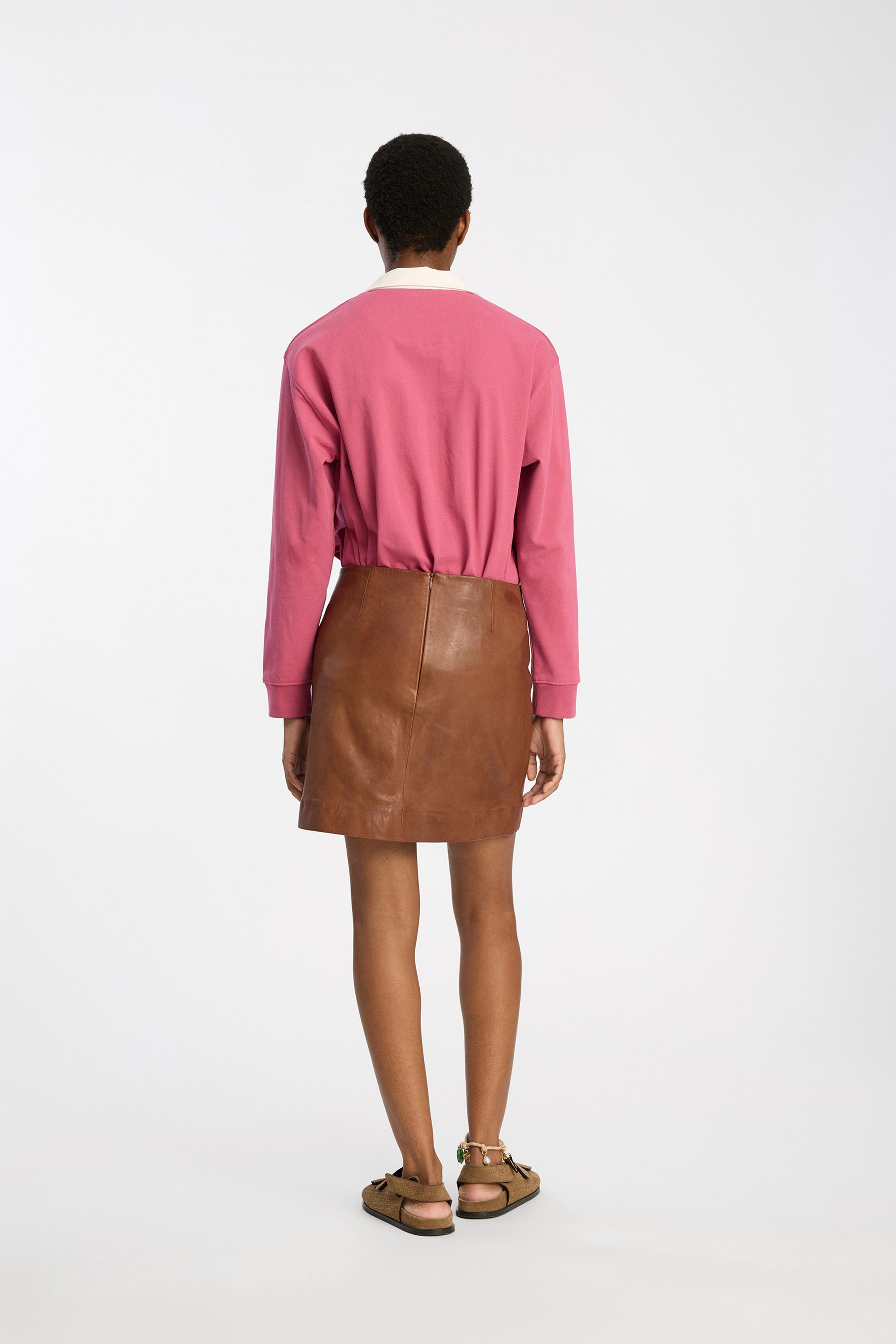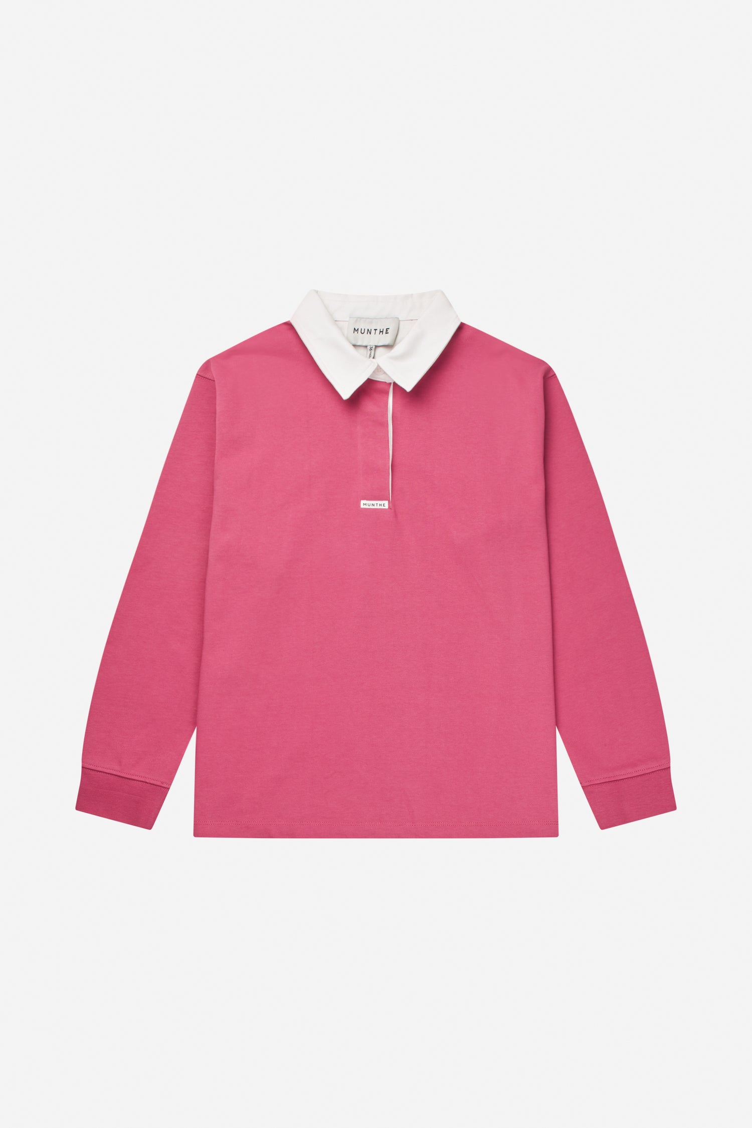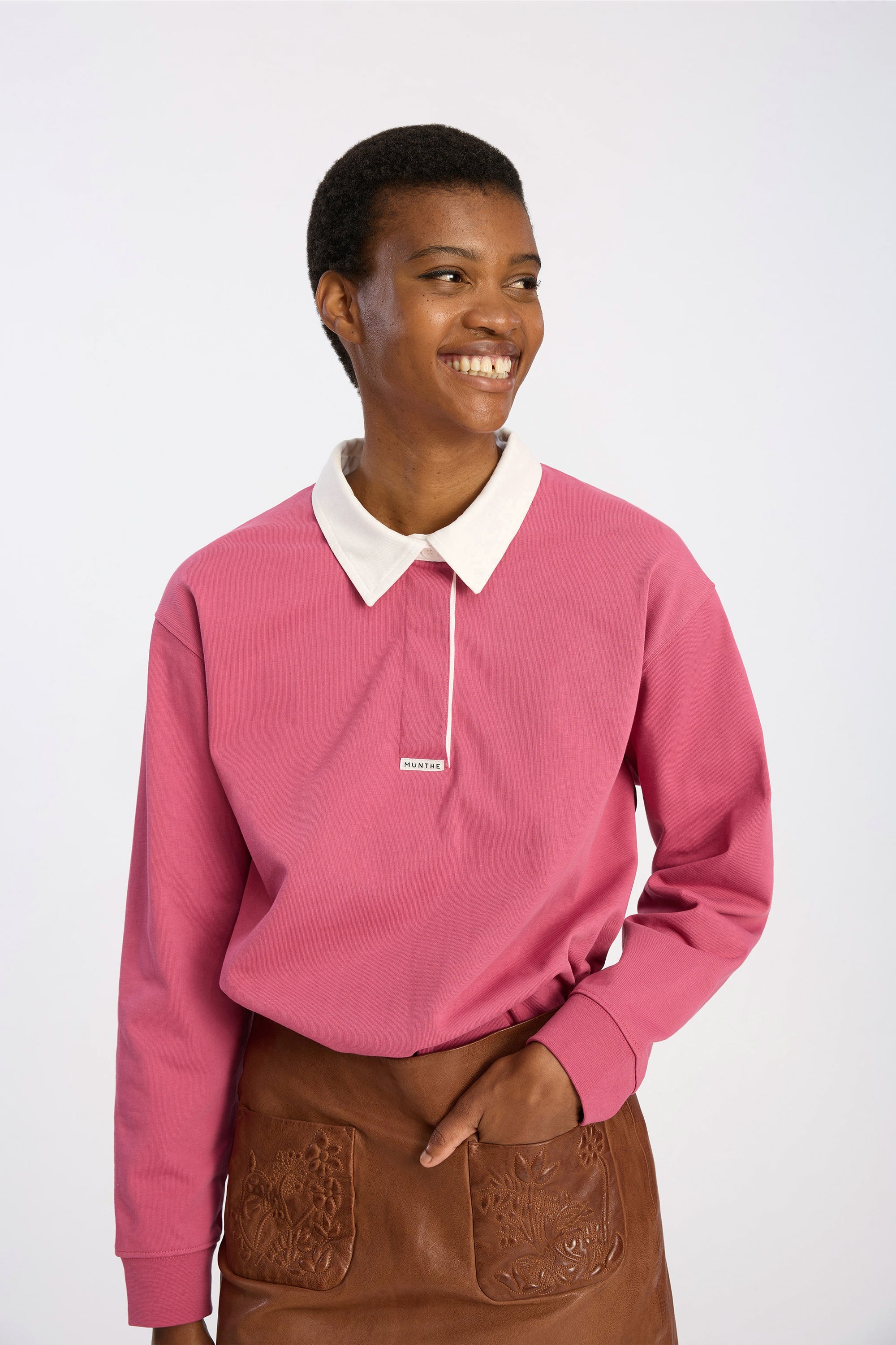 Denne polo-top har en smuk bærfarve, lange ærmer og en kontrastkrave i hvid. Et smukt og farverigt indslag til hverdagsgarderoben.