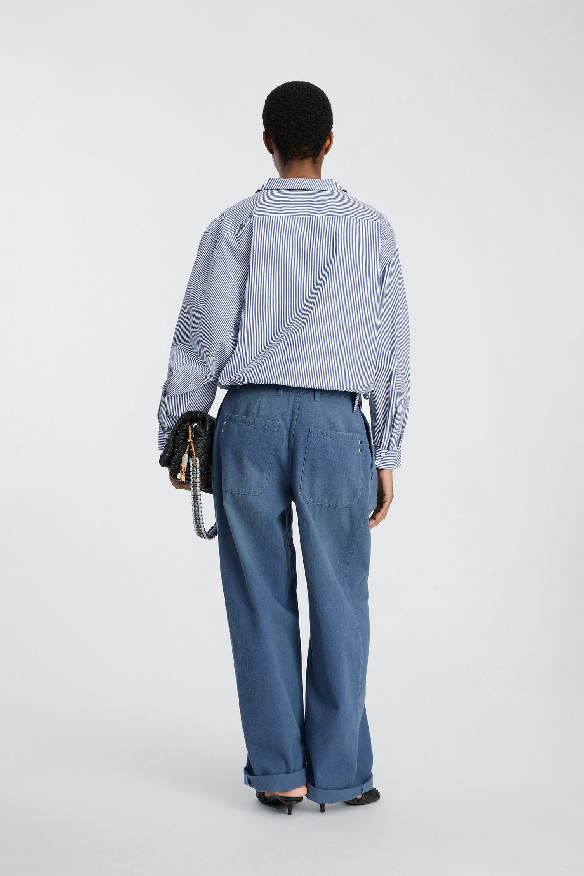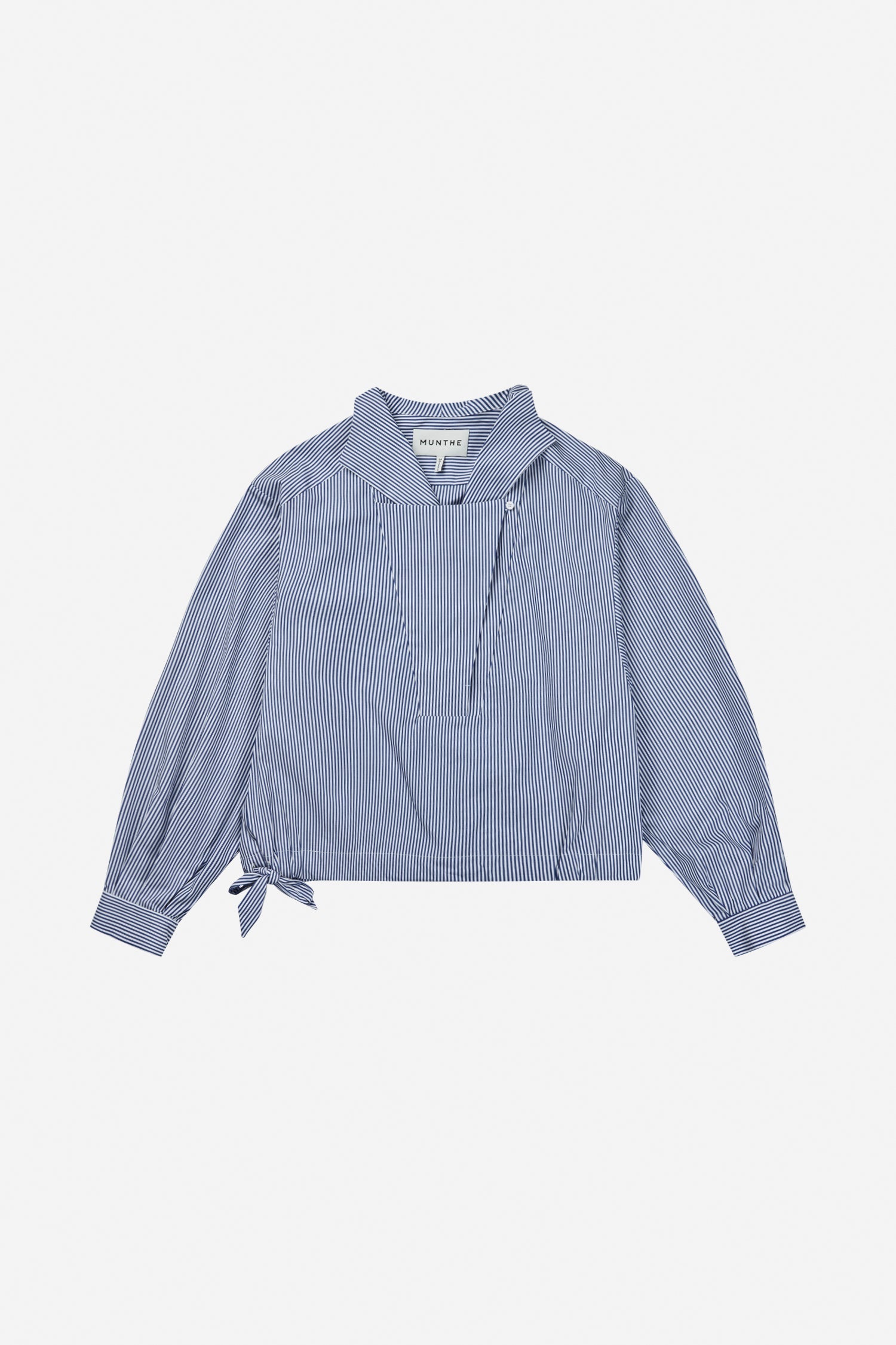 Bluse med striber, en bred, draperet hals og krave. Modellen har lange ærmer med og en lille sløjfedetalje i siden, der giver en let afslappet silhuet.