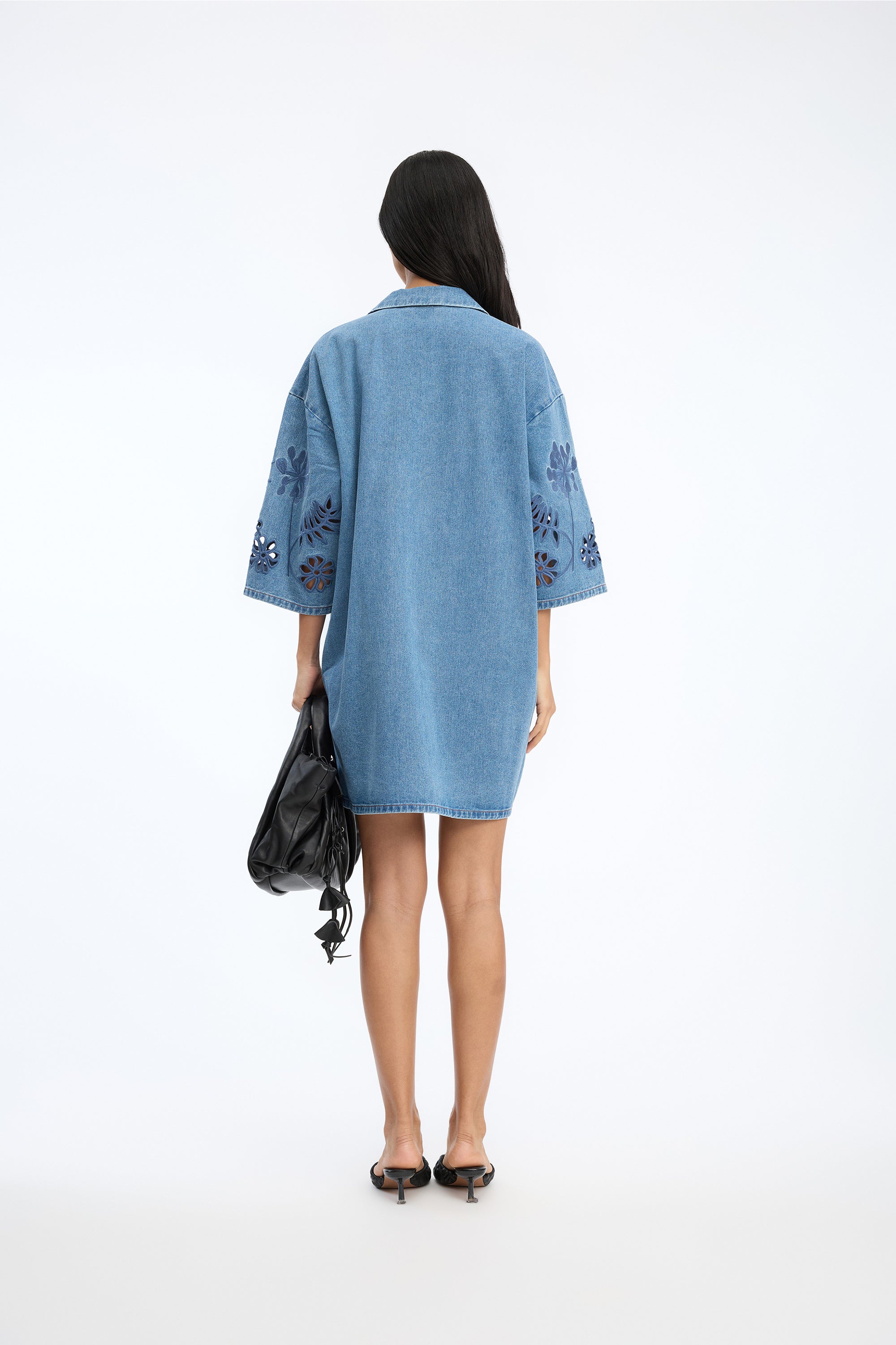 Denne kjole er fremstillet i denim med tone-i-tone broderede blomsterdetaljer. Modellen har en afslappet, lige pasform, V-udskæring med lille krave samt korte, rummelige ærmer.