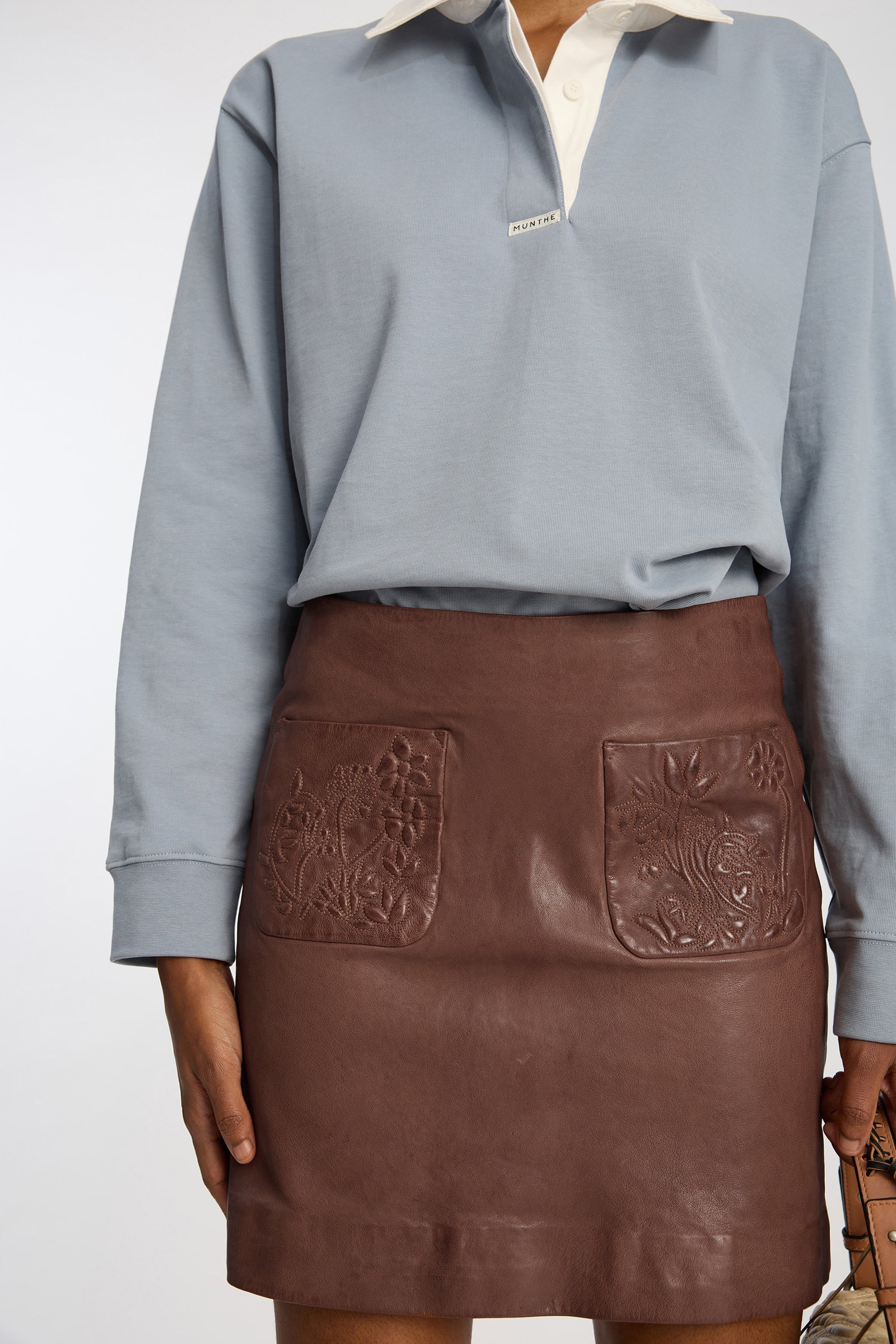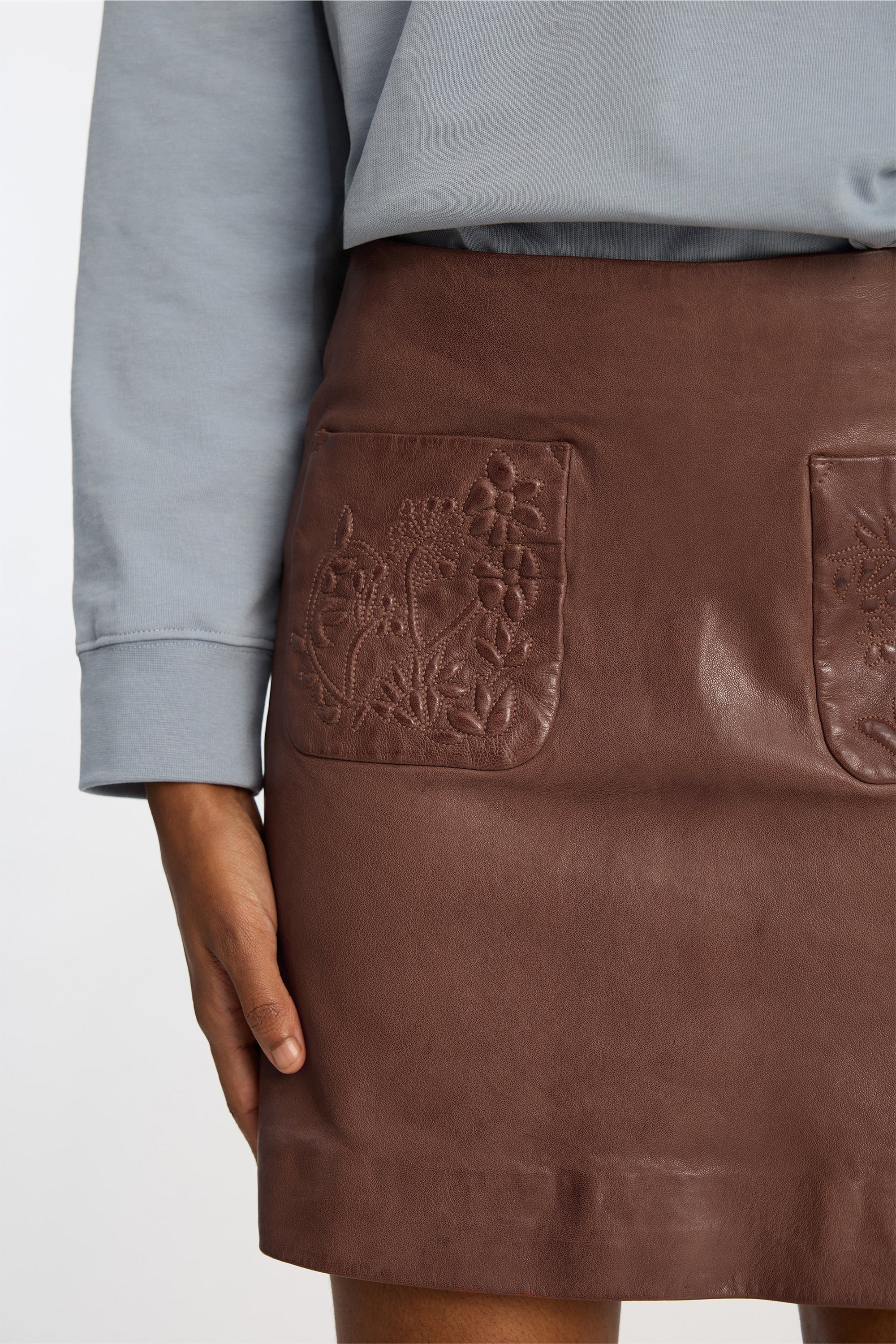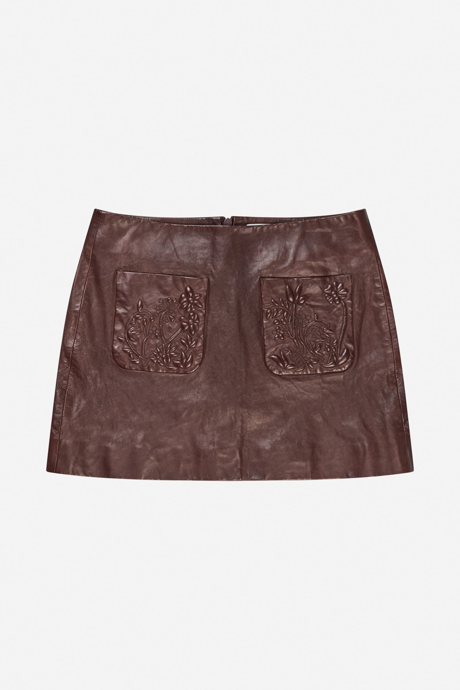 Nederdel fremstillet i 100% lammeskind med to frontlommer med prægede blomsterdetaljer. Den har en kort, regulær pasform og en lynlås bagpå.