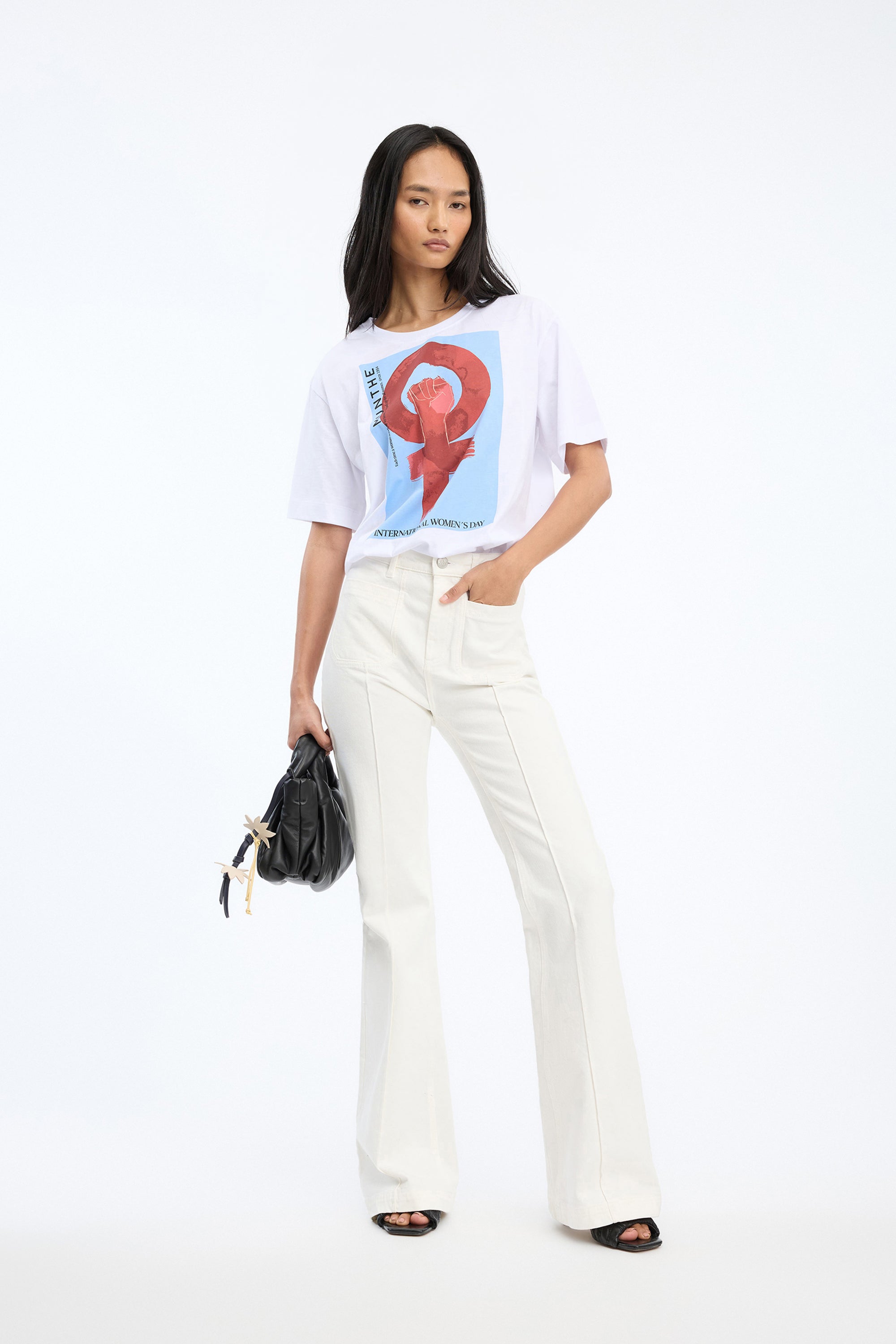 T-shirt med Women's Day motiv og tekst. Den har en løs pasform, rund halsåbning og korte ærmer.