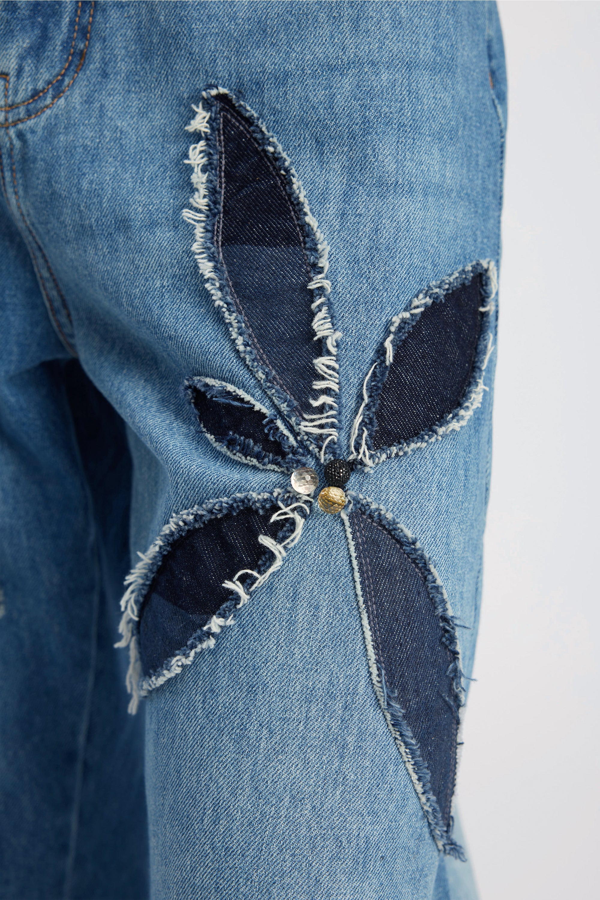 Jeans med store, applikerede blomstermotiver på benene, skåret i kontrastdenim. Modellen er lavet i en klassisk denimkvalitet med lige ben, fem lommer og lynlåslukning.