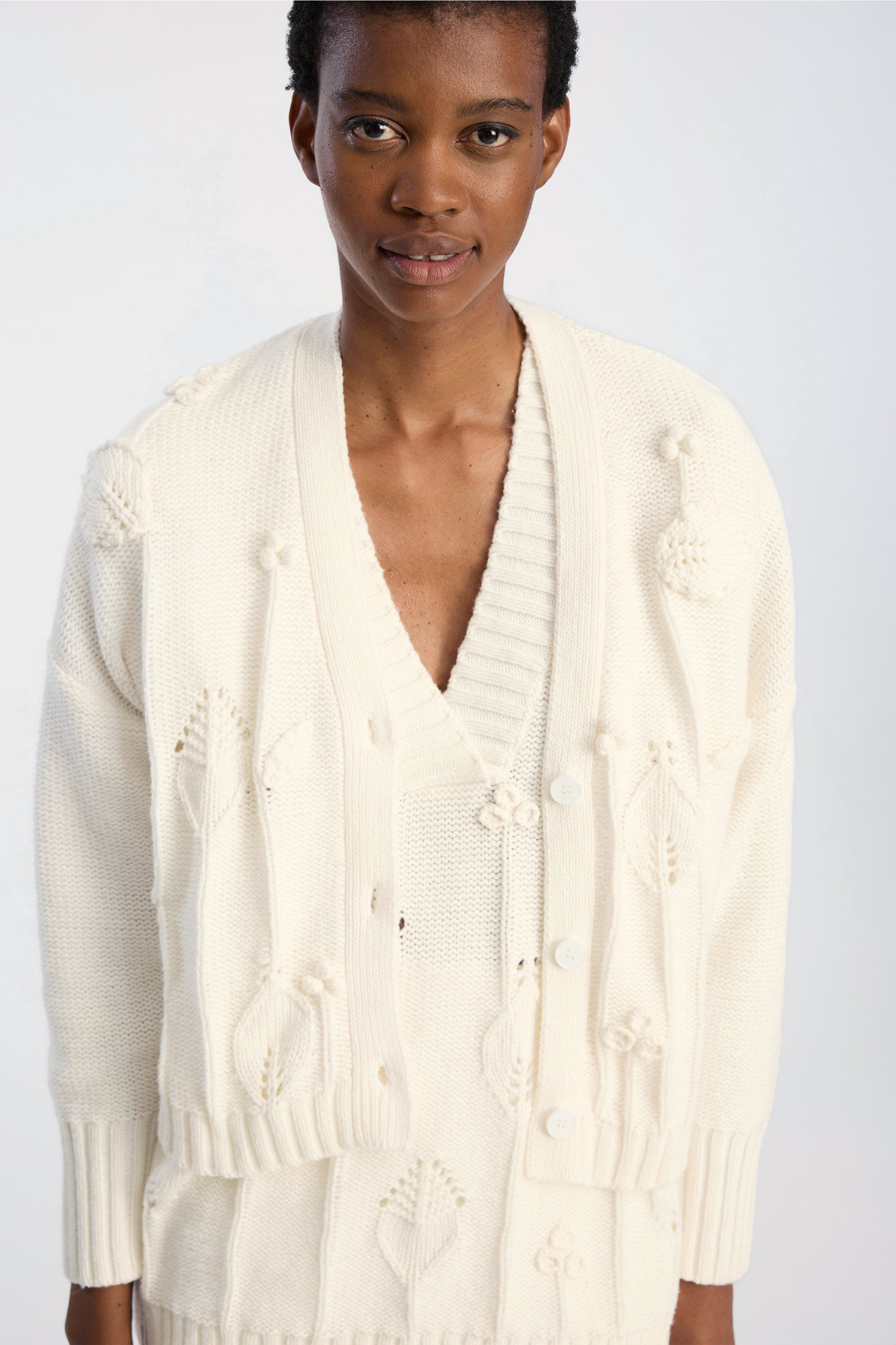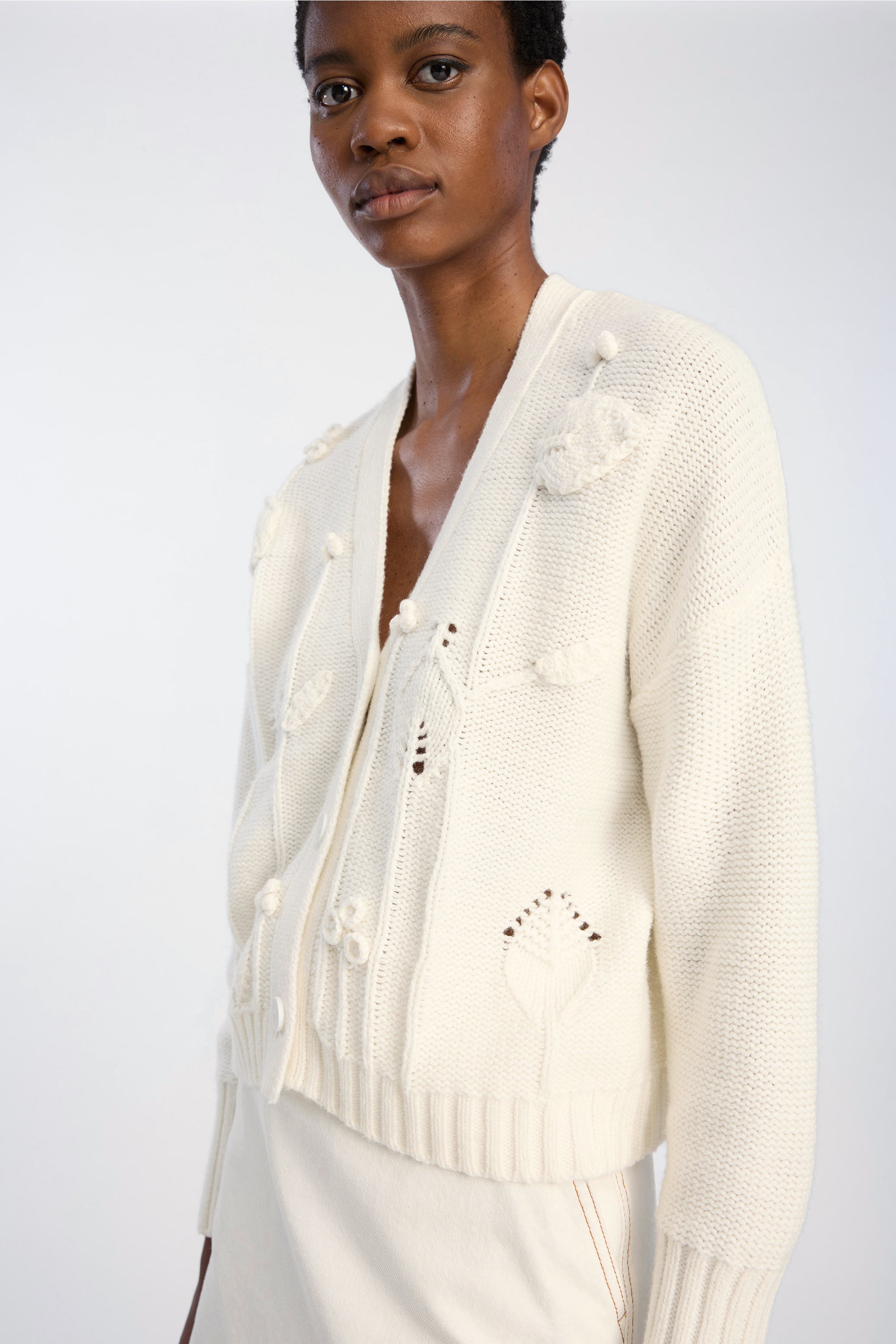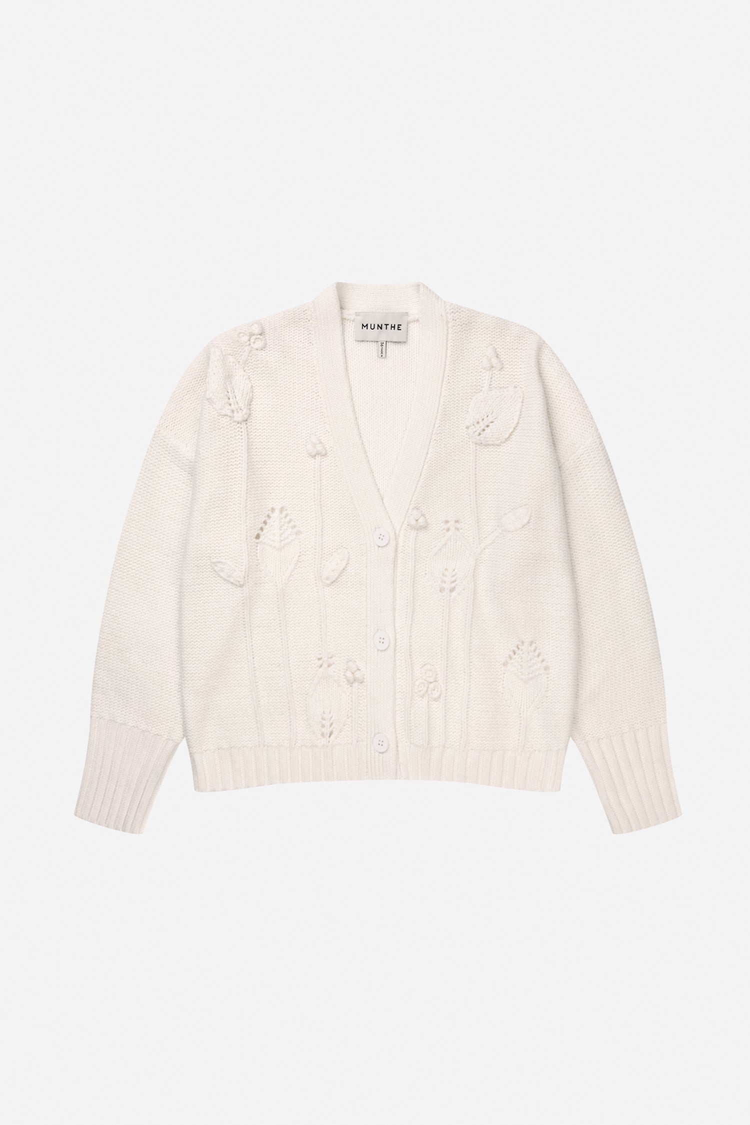 Cardigan med V-udskæring, knaplukning foran og et løftet blomsterstrikmønster. Designet med lange ærmer og ribkanter ved ærmer og bund.