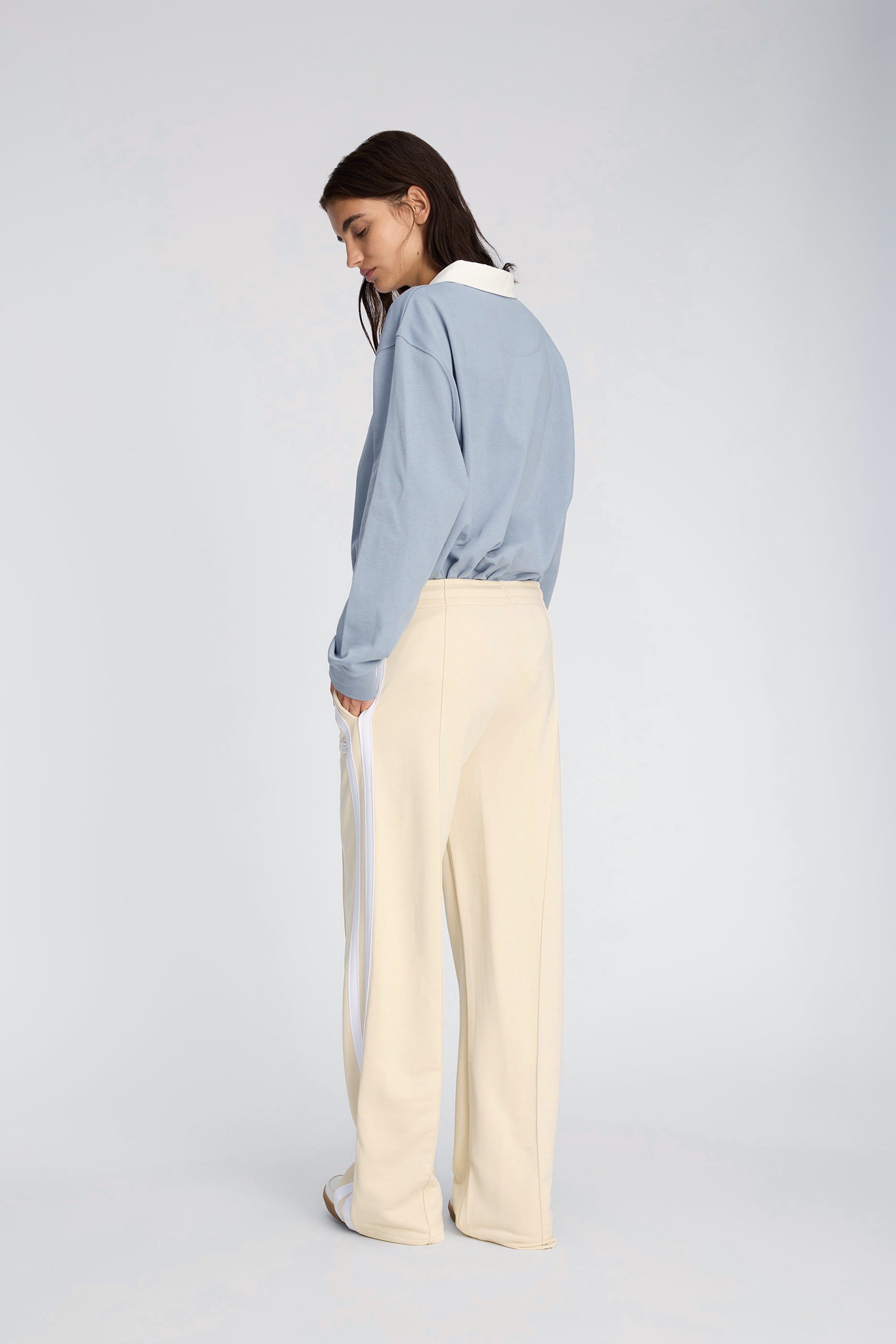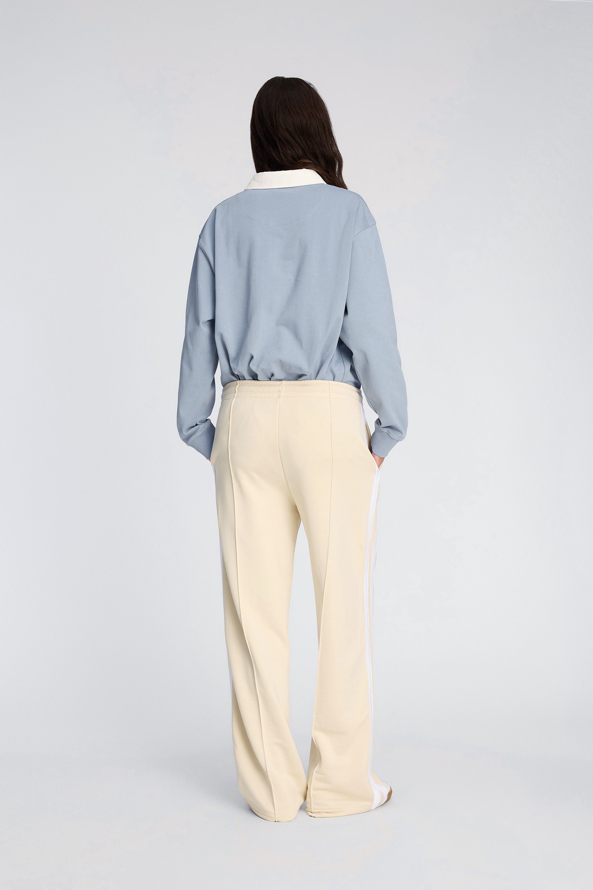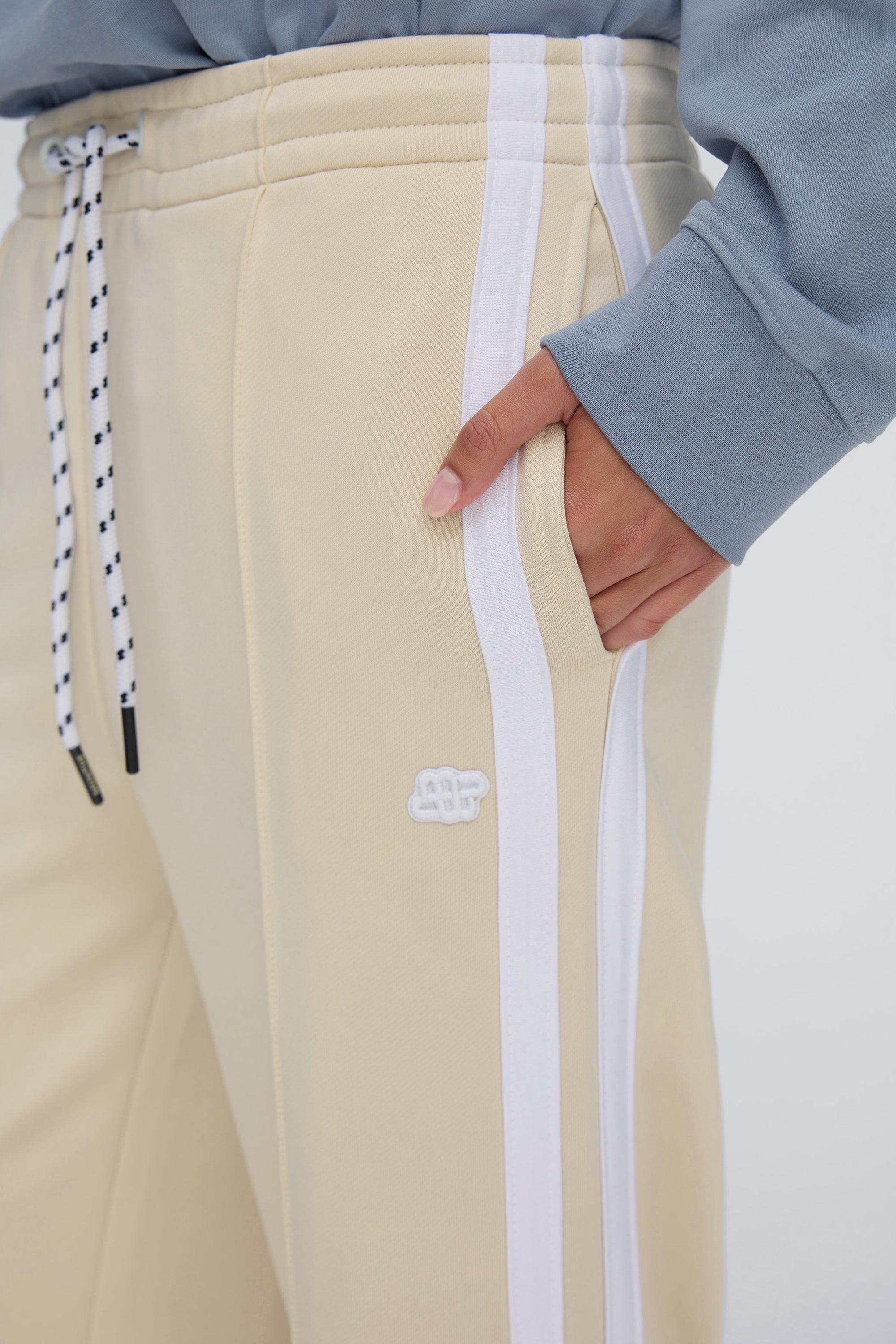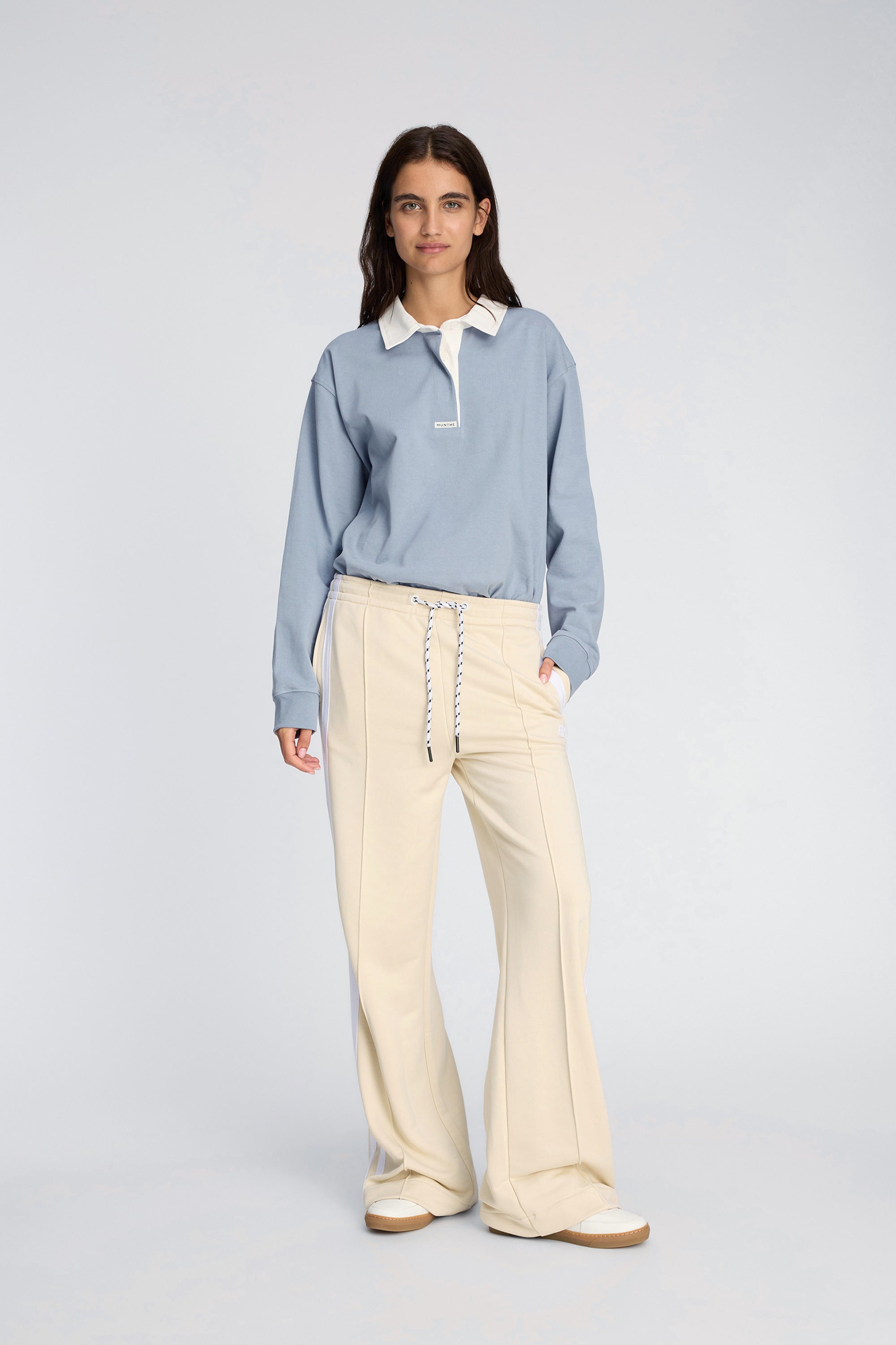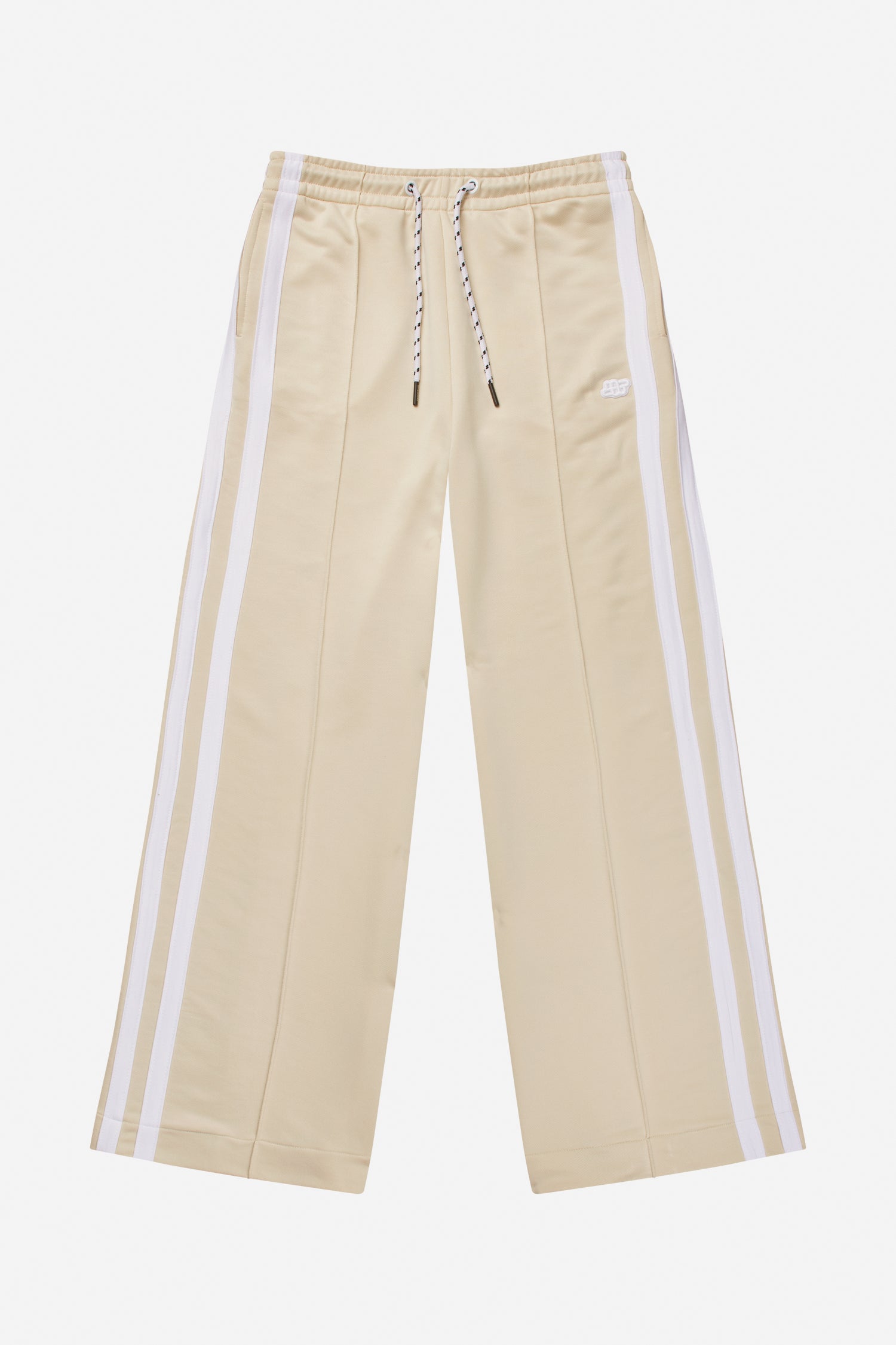 Disse bukser har en lige, afslappet pasform med elastisk talje og justerbar snøre. Modellen har markante sidestriber, pressefolder og et lille broderet logo foran. Et sporty design, der både er komfortabelt og elegant.