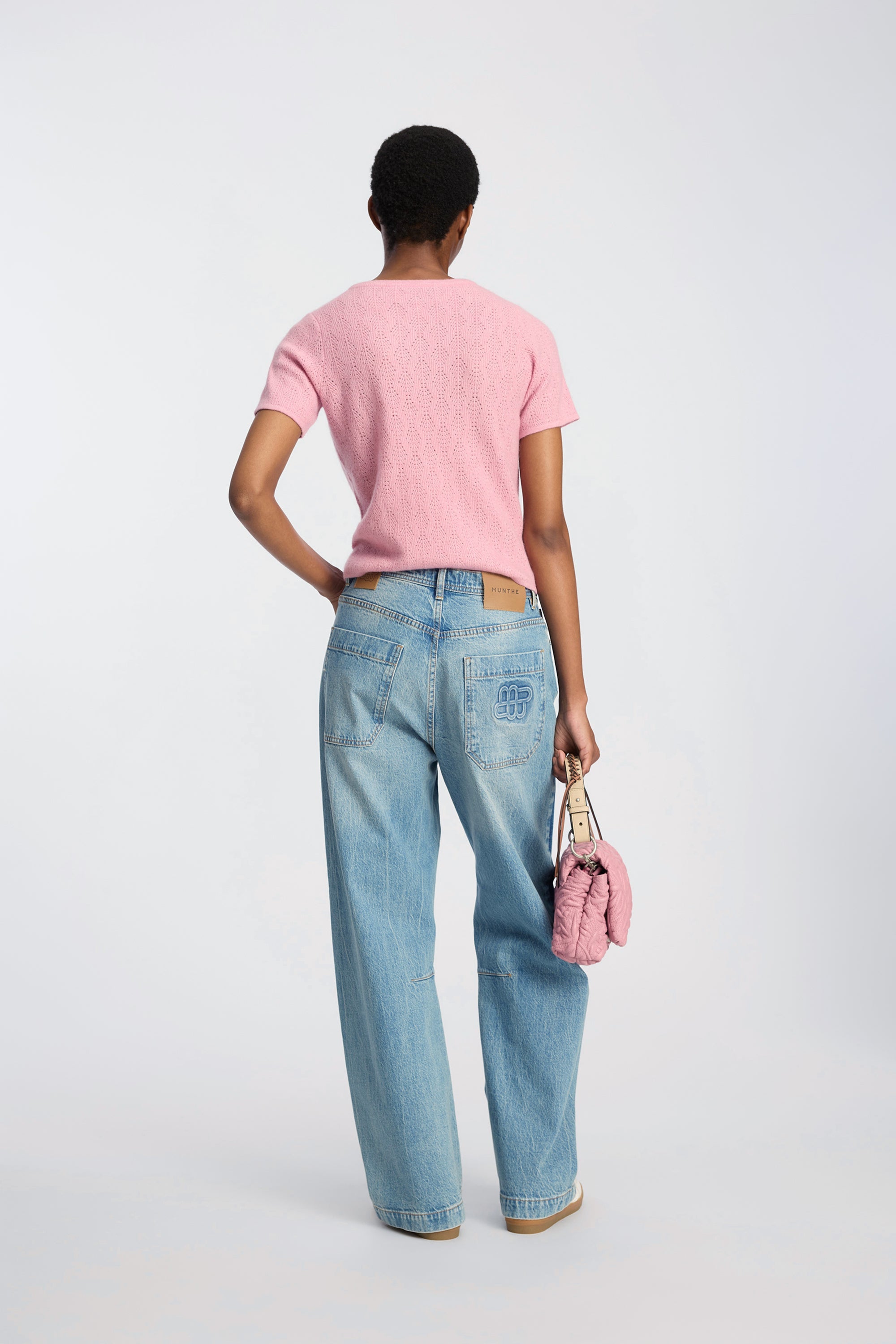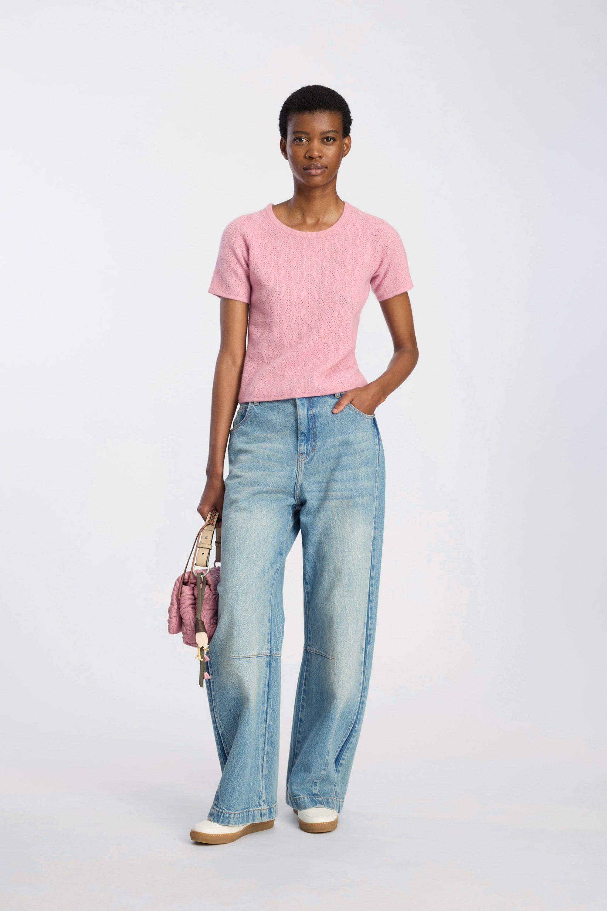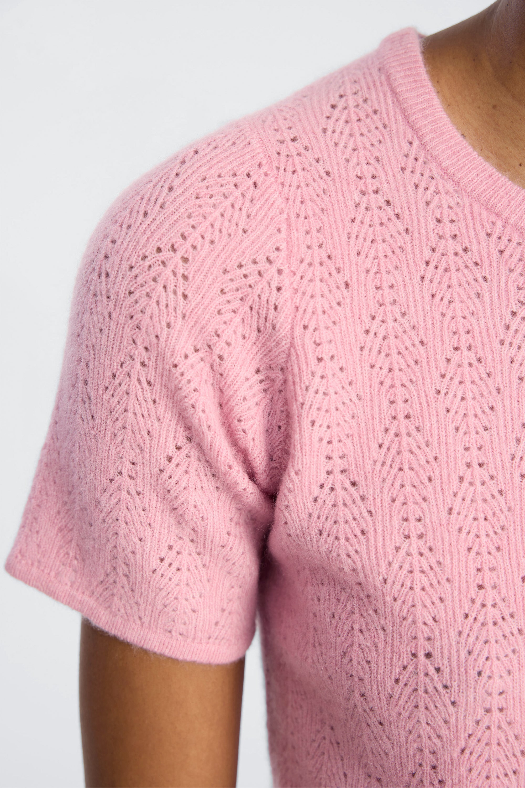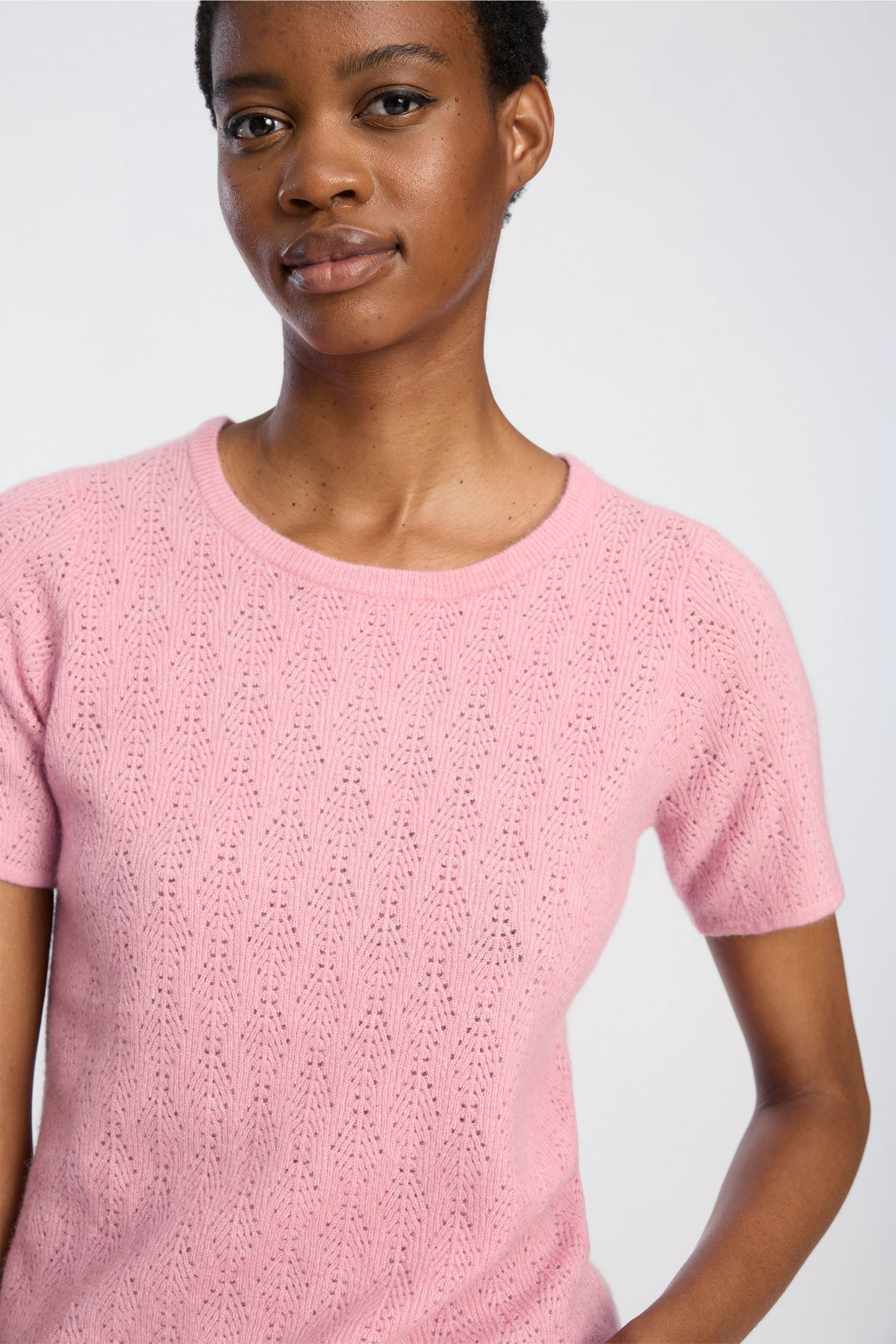 Top i blød pointelle strik, med korte ærmer, rund hals og i 19% cashmere.
