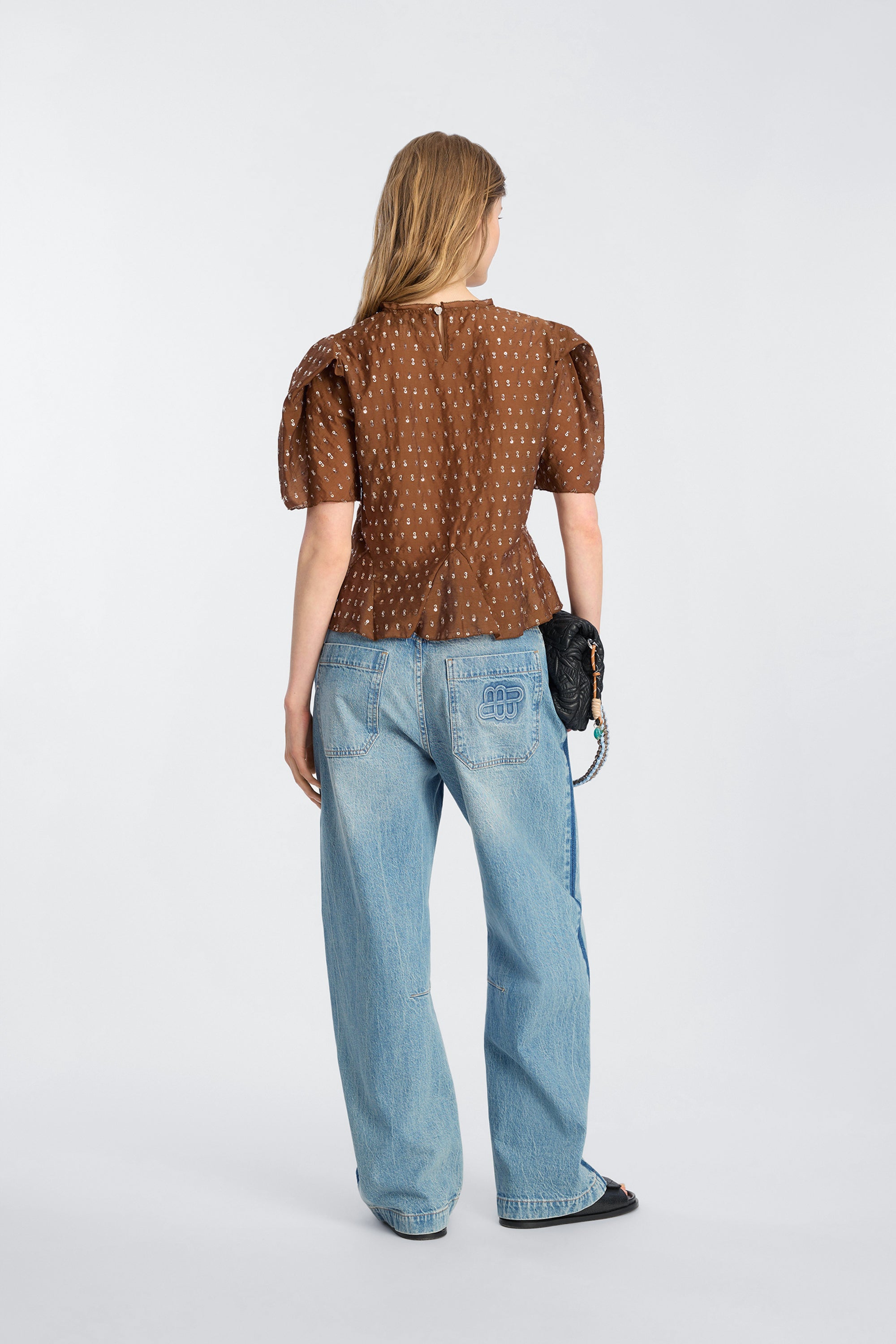 Top med pailletdetaljer, let puffede, korte ærmer, rund hals og Top med pailletdetaljer, let puffede, korte ærmer, rund hals og peplum-detalje ved bunden-detalje ved bunden.