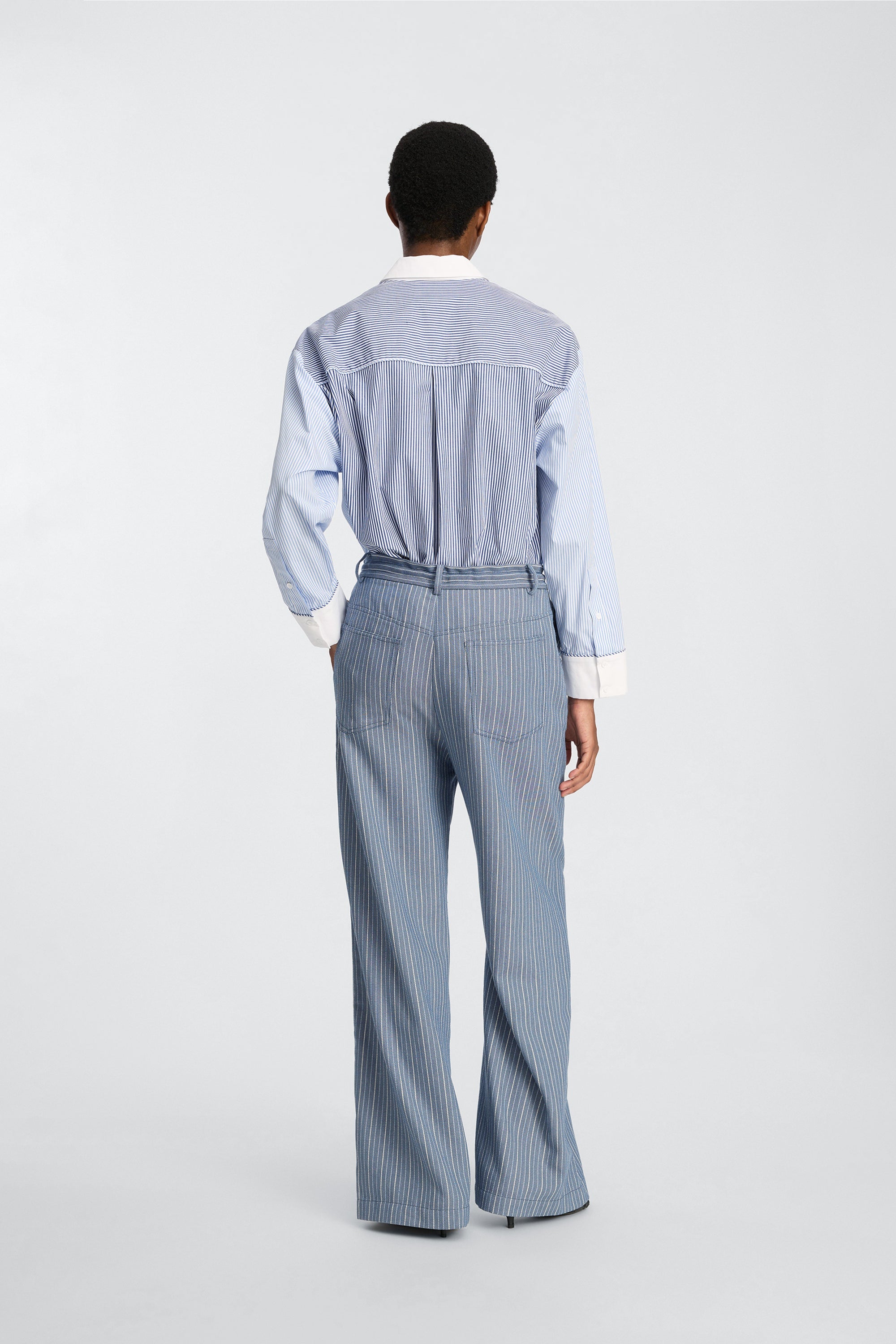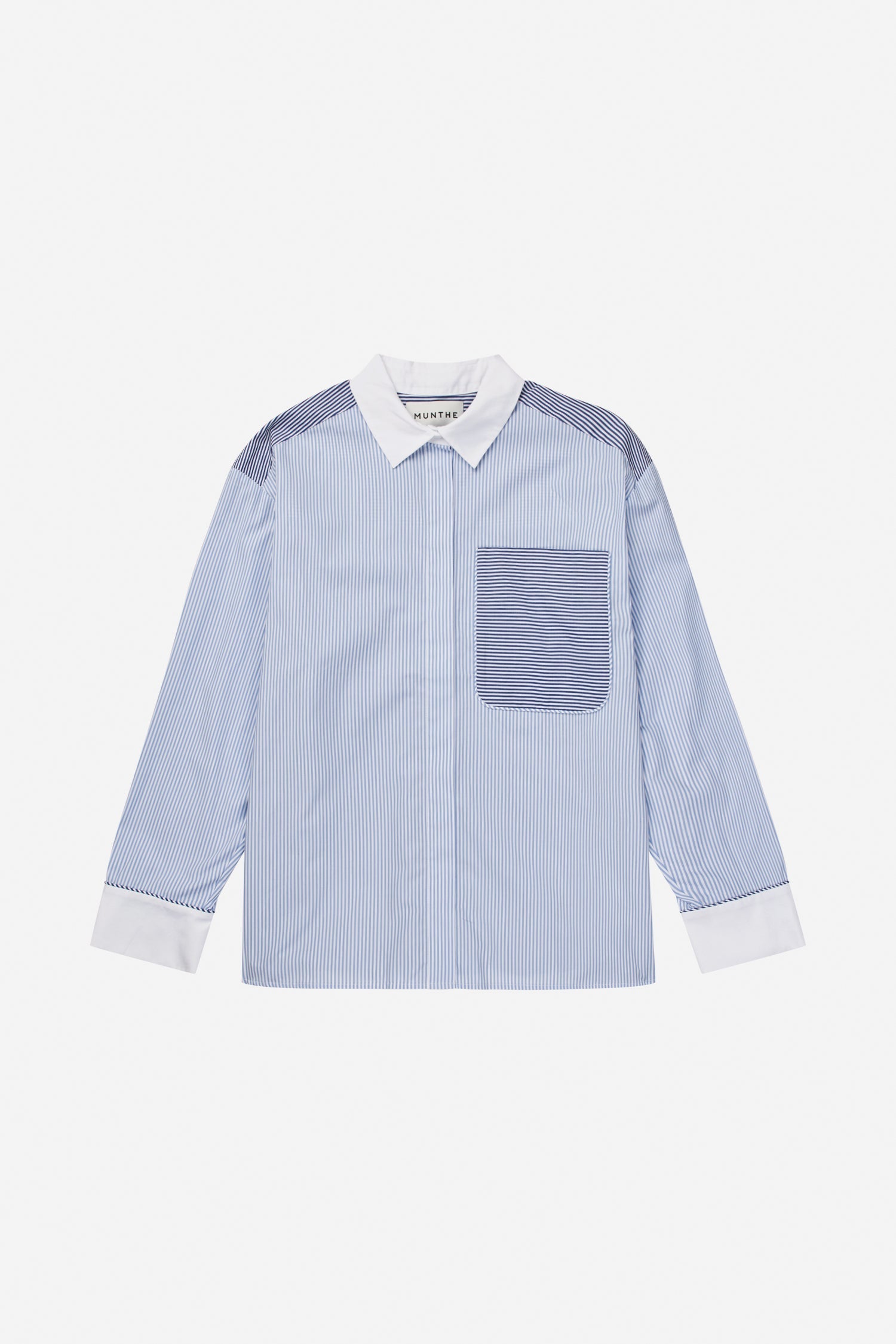 Skjorten med fine striber og en kontrastkrave i hvid. Modellen har lange ærmer med hvide manchetter, en skjult knaplukning og en påsyet brystlomme i et matchende stribemønster med skulderpanelet.