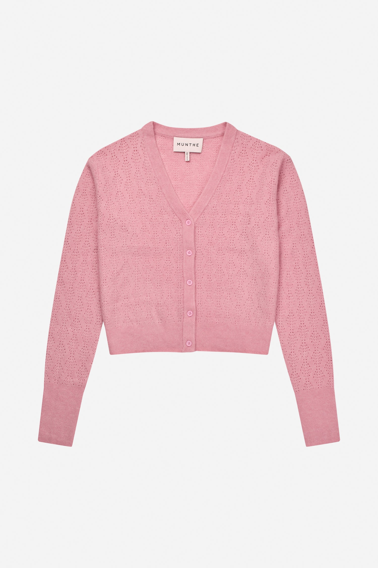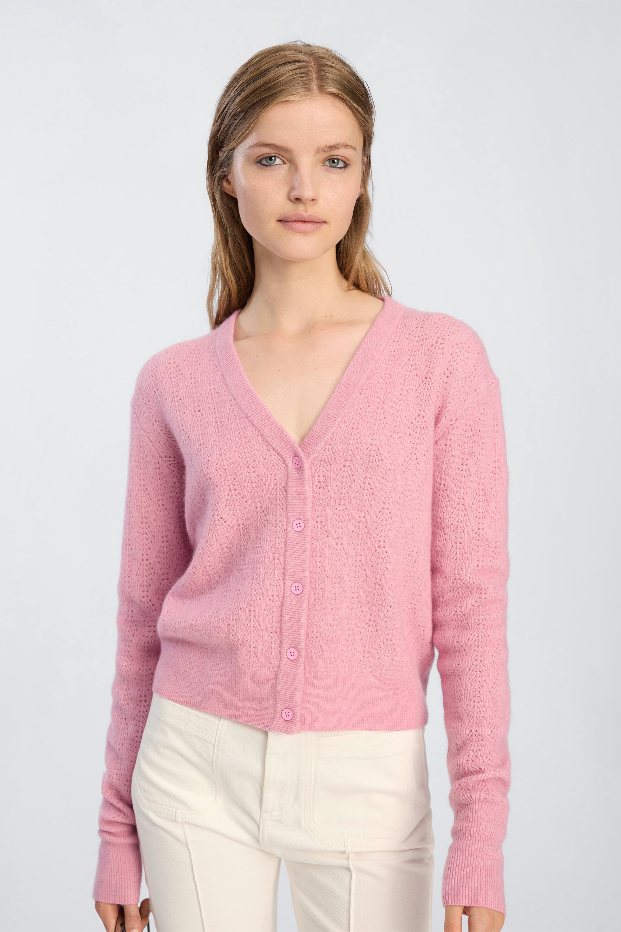Cardigan med V-udskæring, lange ærmer og knaplukning foran. Designet i pointelle strik, med en normal pasform og i 19% cashmere.