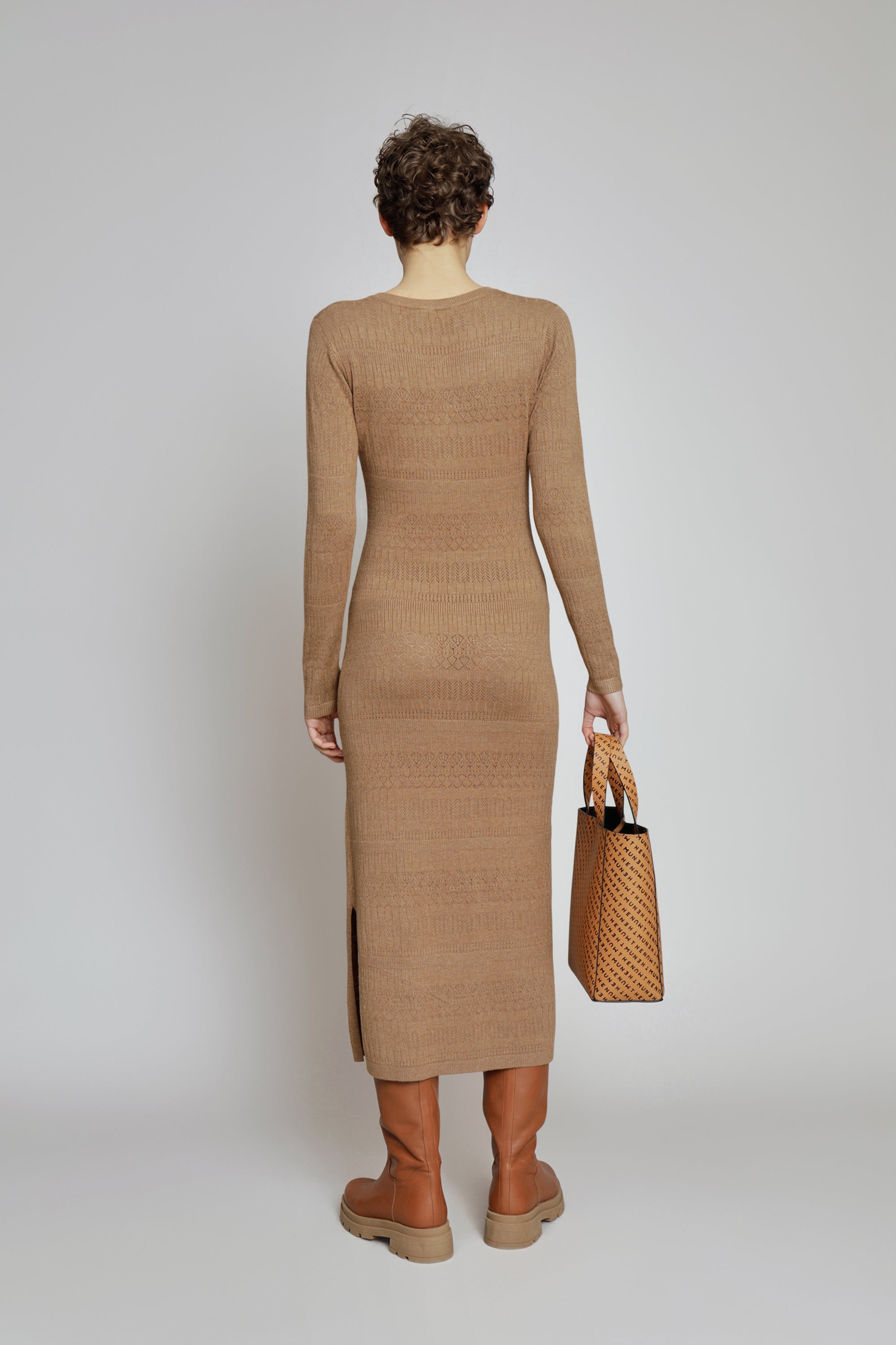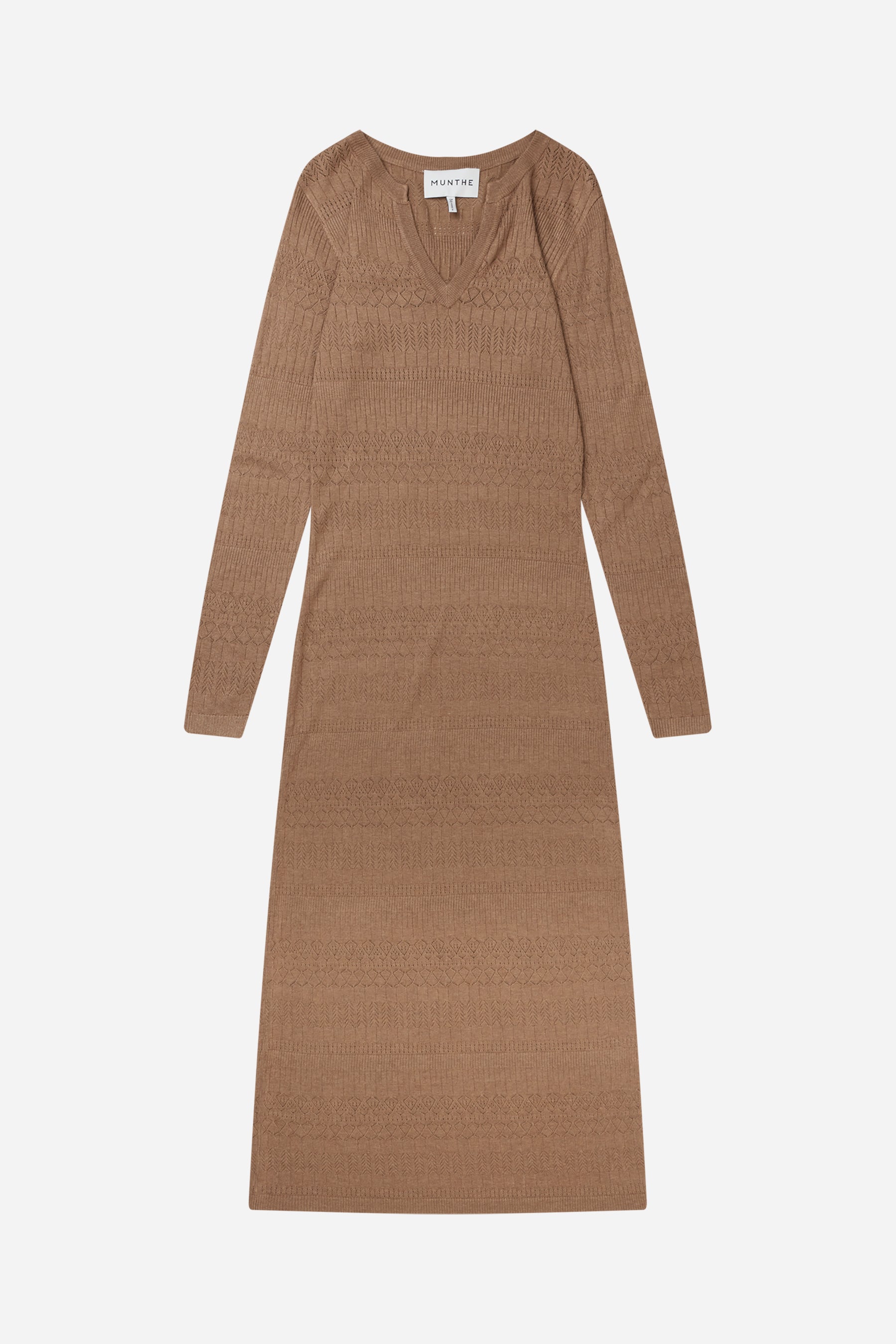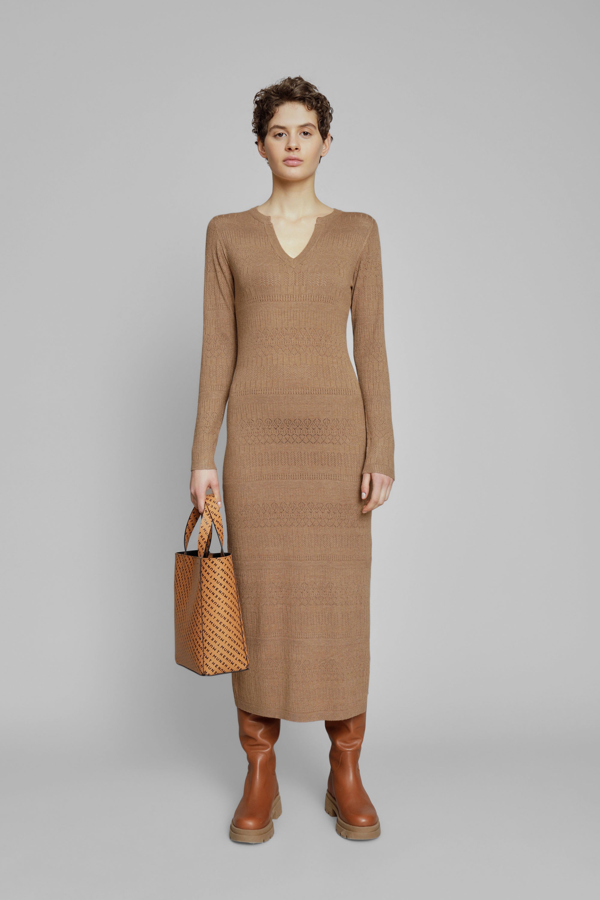Lang klassisk kjole lavet i en viskose blanding, med v-udskæring og lange ærmer. Fås i farven sort eller camel.