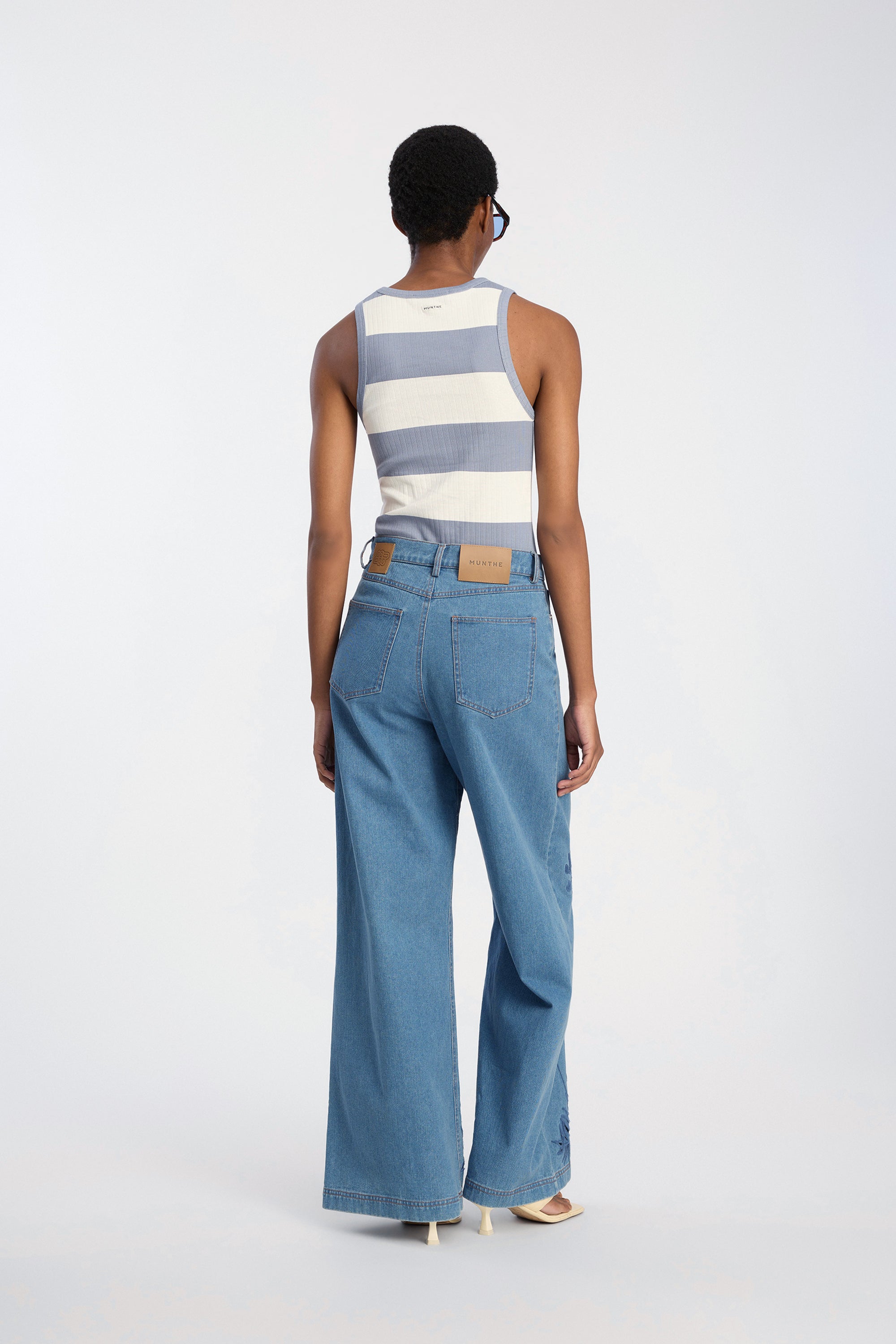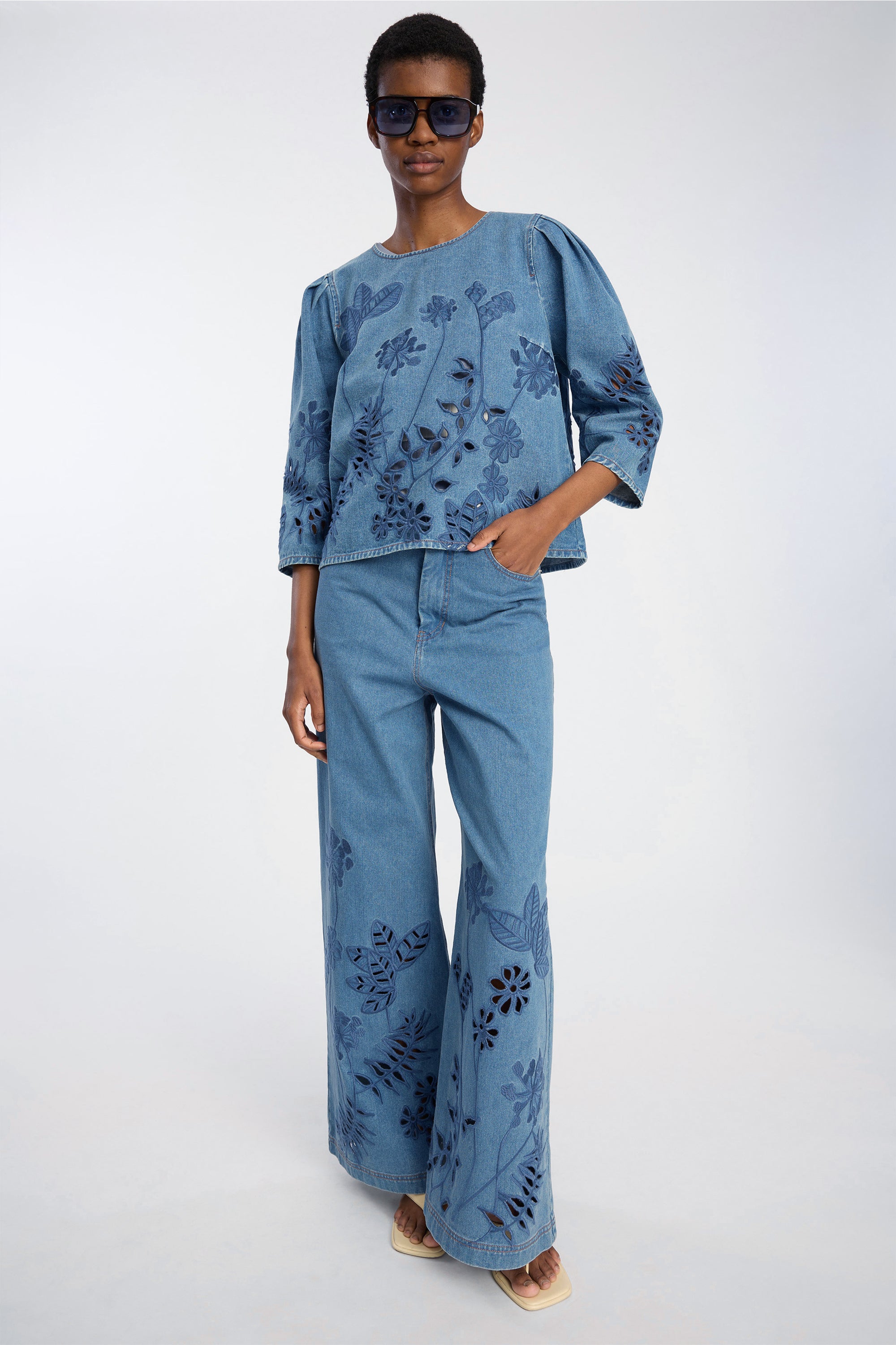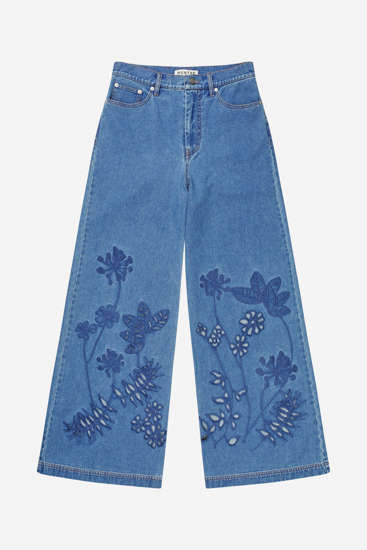 Disse jeans har en bred, lige pasform, fem lommer, bæltestropper og knaplukning. Modellen er dekoreret med broderede blomster, som tilføjer et kunstnerisk touch til den enkle silhuet.