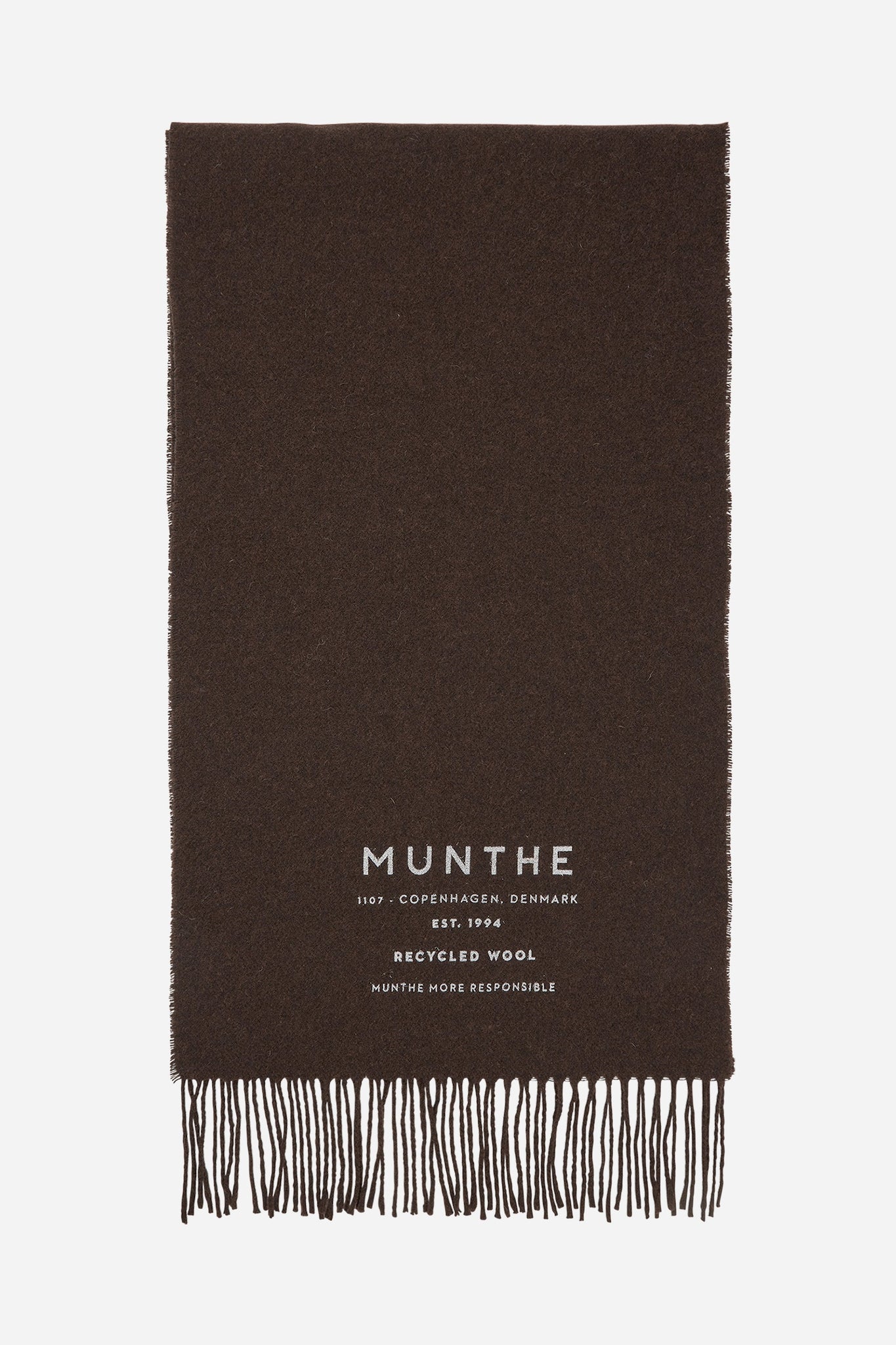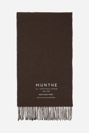 Et tørklæde lavet i en blød genanvendt uld blanding. Tørklædet har MUNTHE logo og tekst, og en klassisk frynsedetalje i hver ende af tørklædet. Fås i farverne brun eller beige.