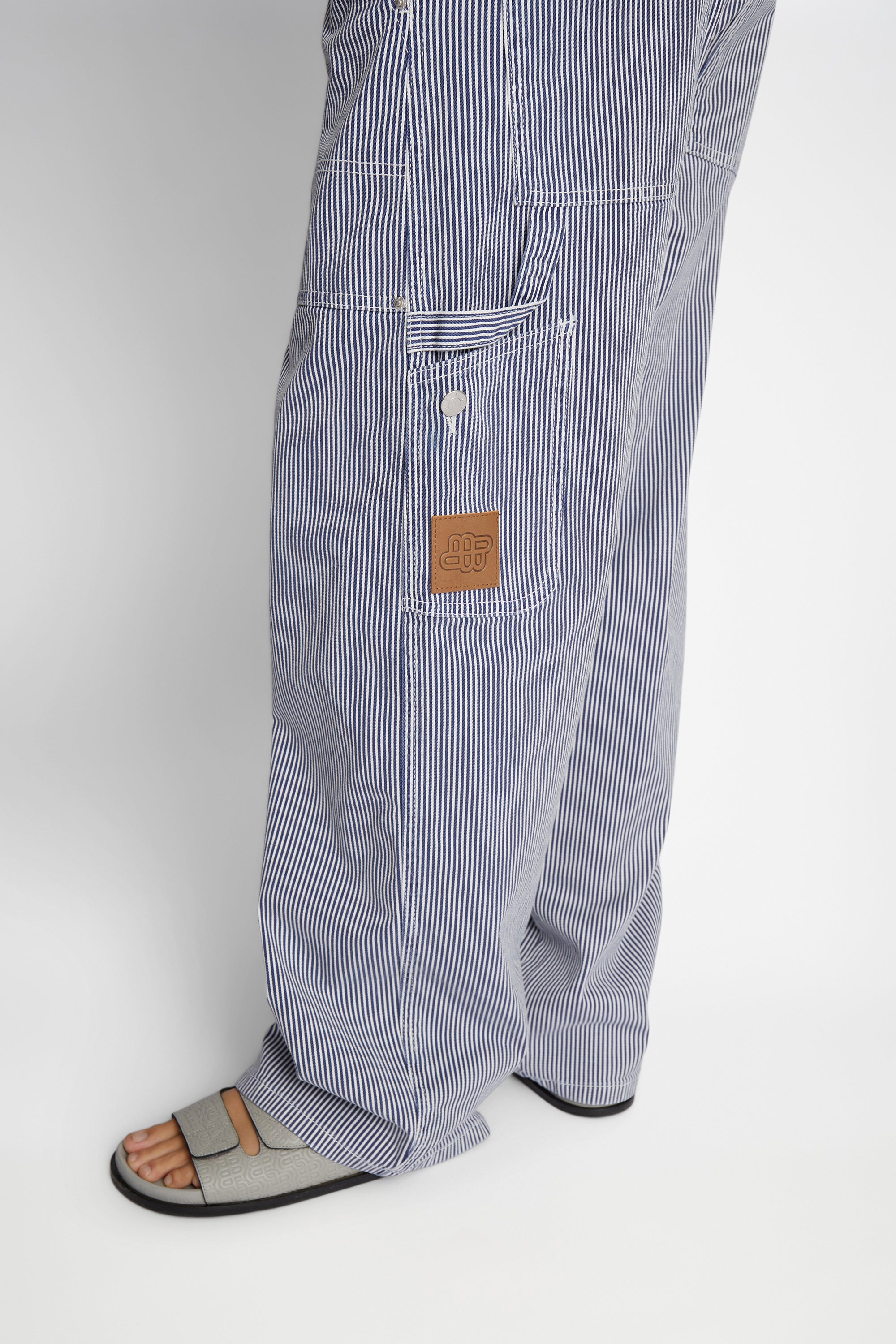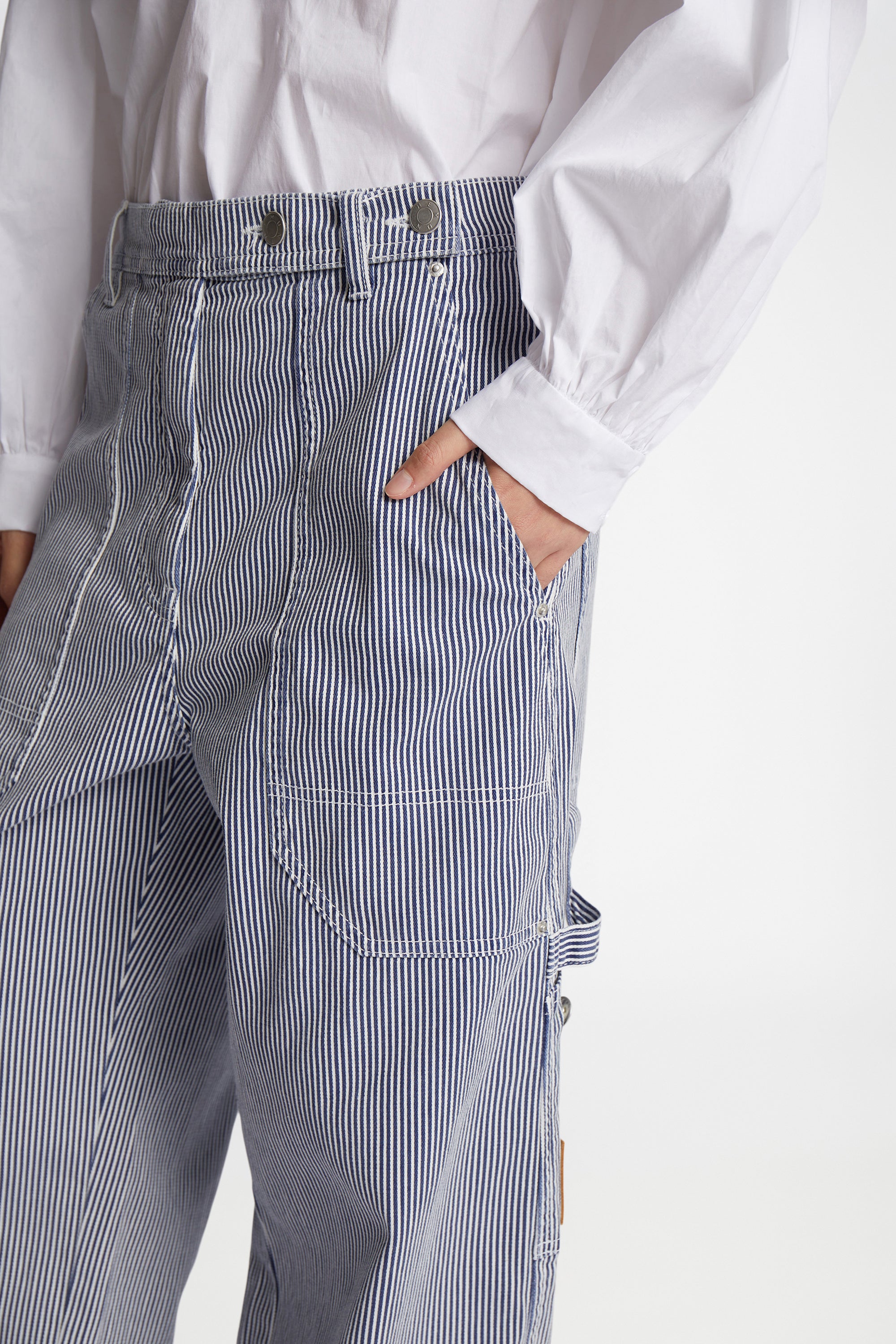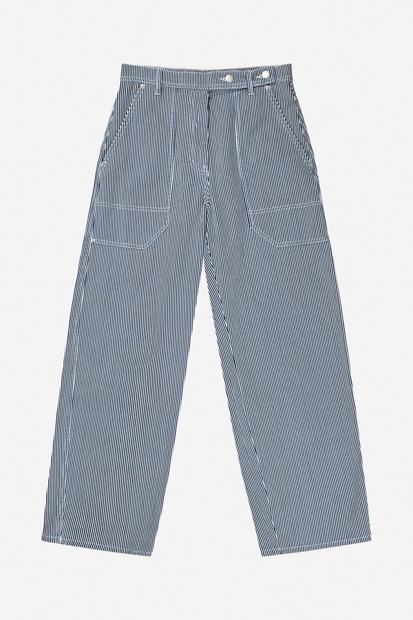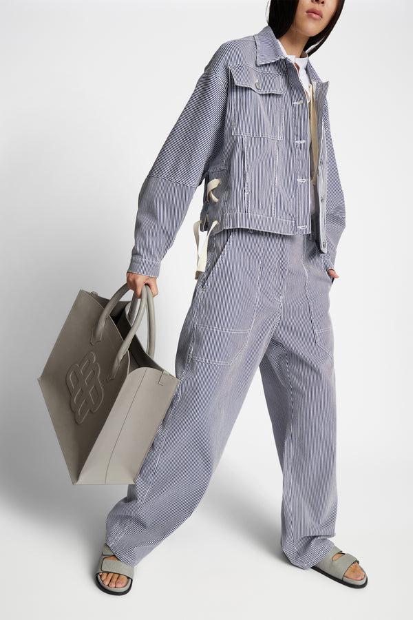 Denim bukser med elegante nålestriber, oversize lommer og cargo bukser inspirerede detaljer. Disse bukser er lavet af 100% økologisk bomuld.