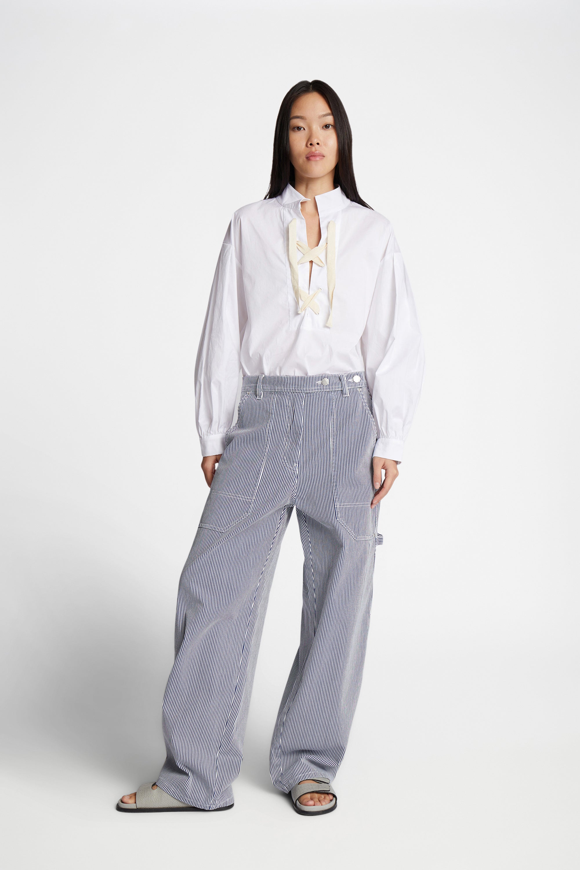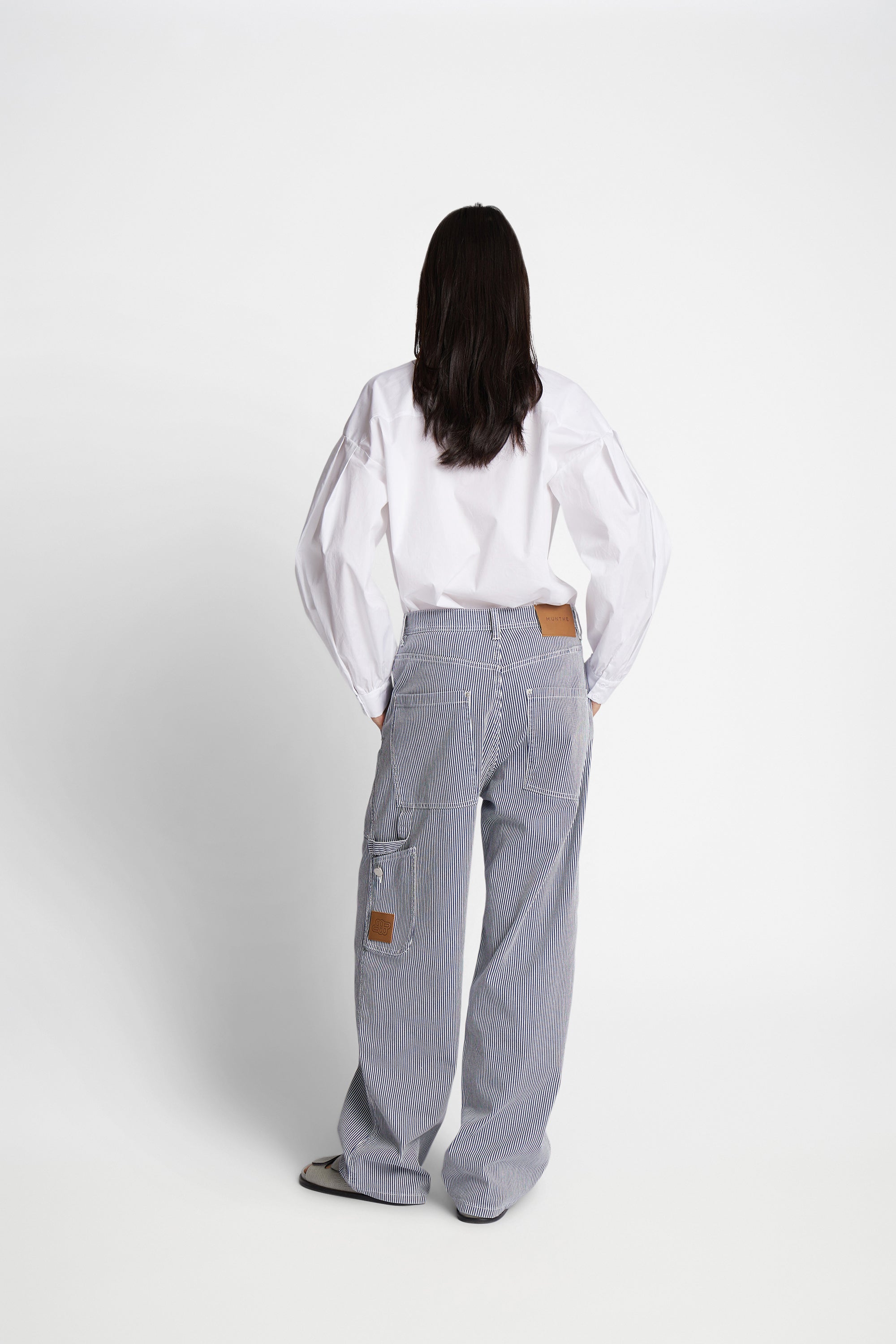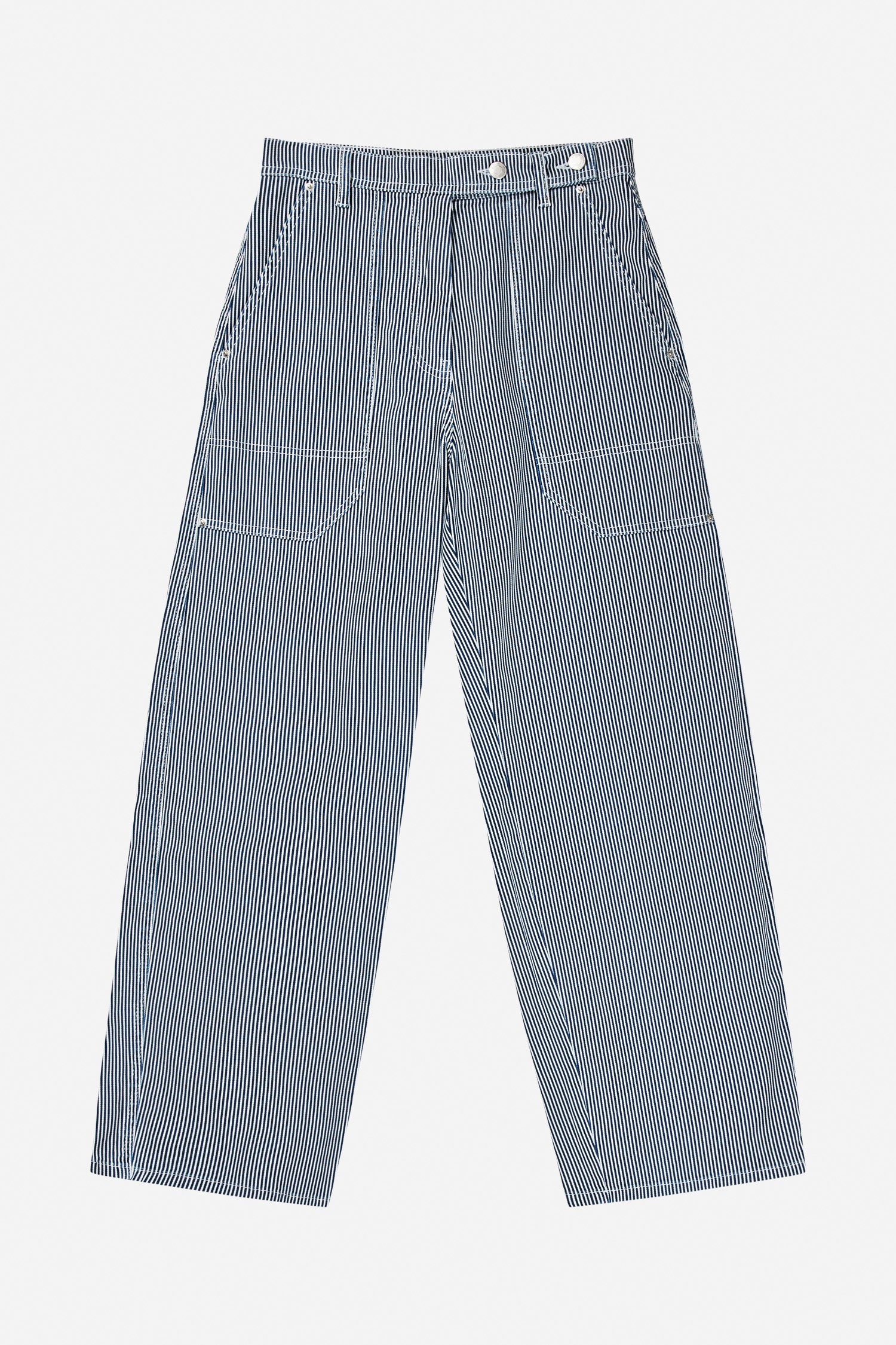 Denim bukser med elegante nålestriber, oversize lommer og cargo bukser inspirerede detaljer. Disse bukser er lavet af 100% økologisk bomuld.