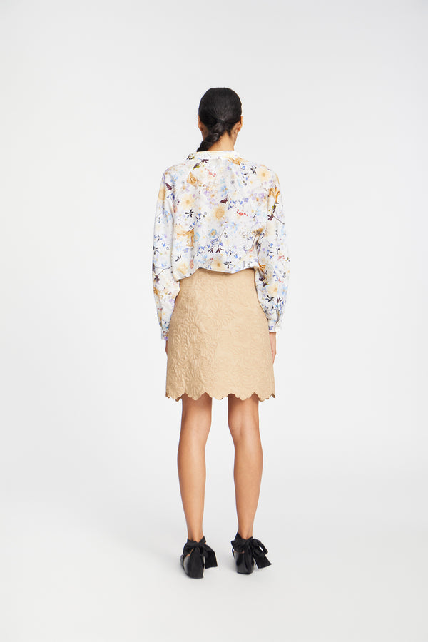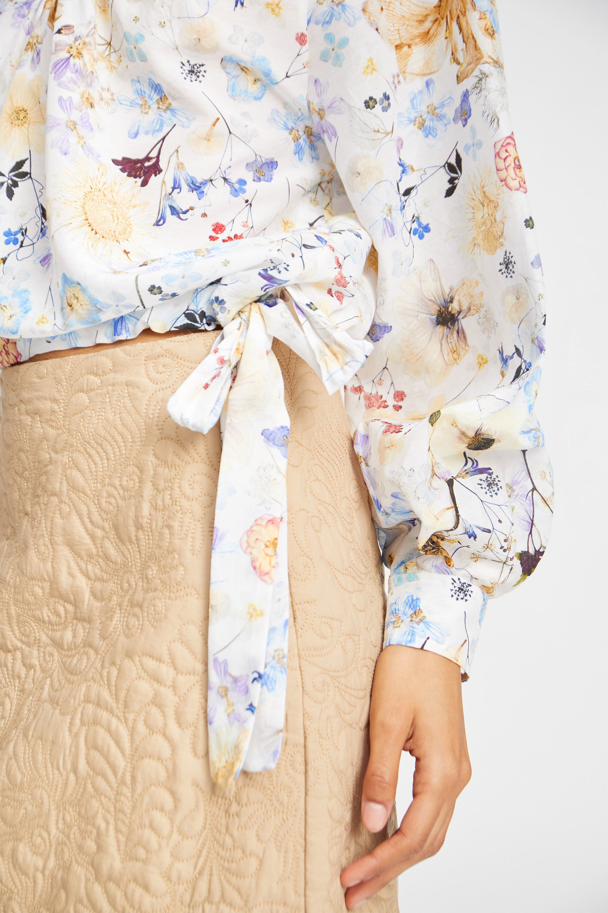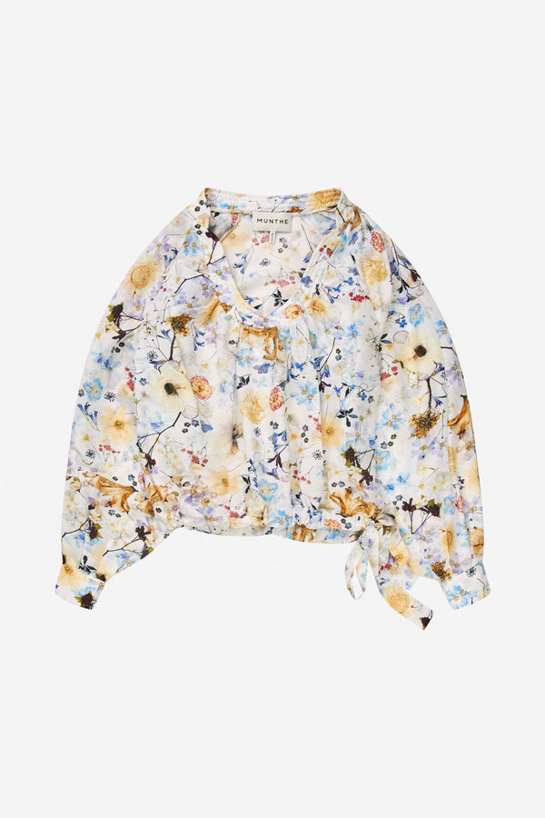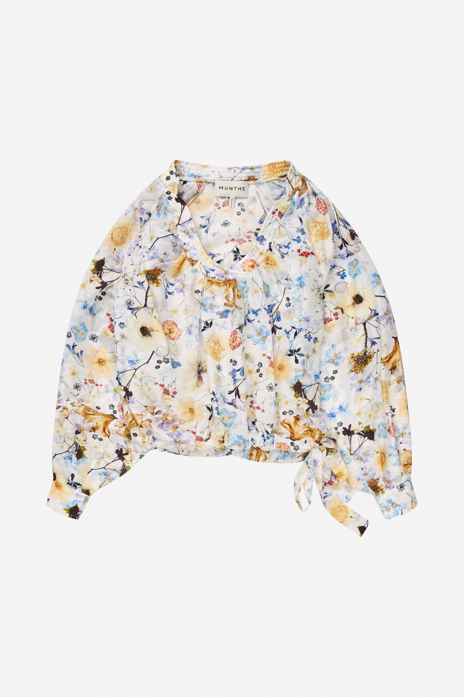 Bluse med et elegant print, lavet af kronblade fra blomster Naja Munthe har plantet i sin egen have. Blusen har en smuk detaljeret halsudskæring, med en elegant binde detaljer ved bunden og er designet i en blød silkeblanding.