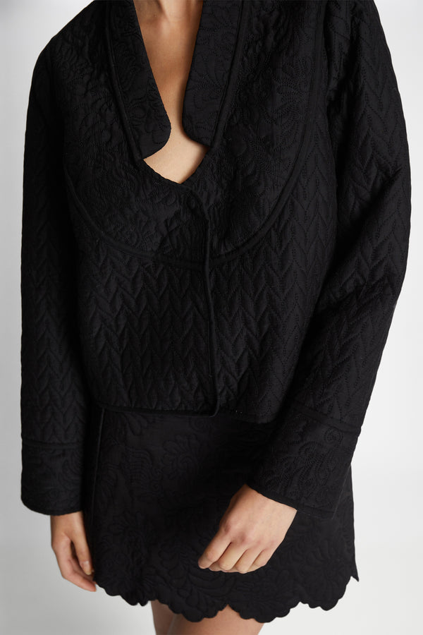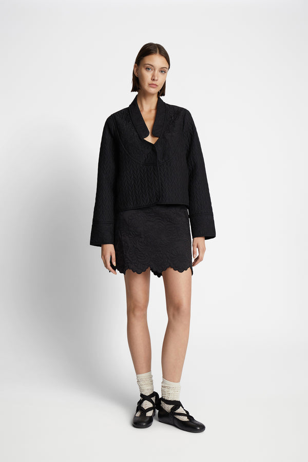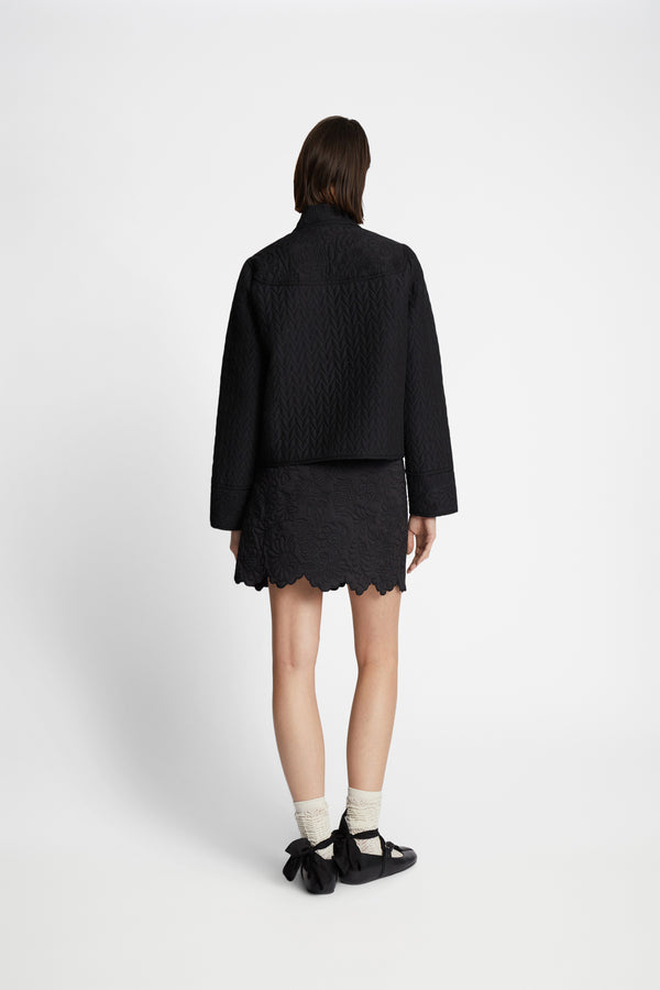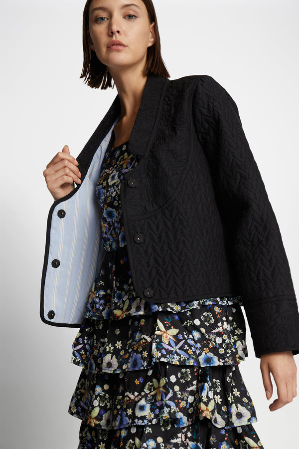 Quiltet jakke med en elegant kombination af to smukke mønstre. Jakken har skjulte knapper, side lommer og kan styles med Munthe Matter eller Solina bæltet, som sælges separat.