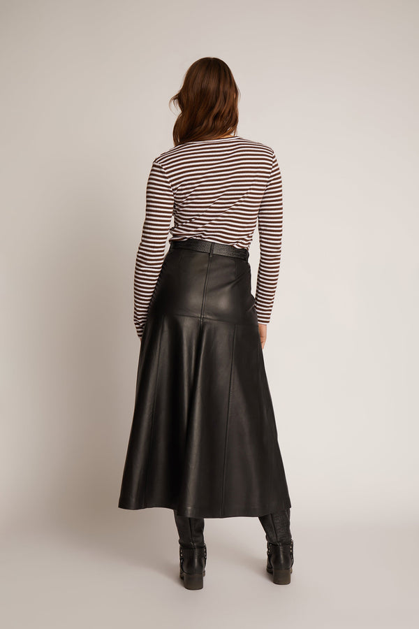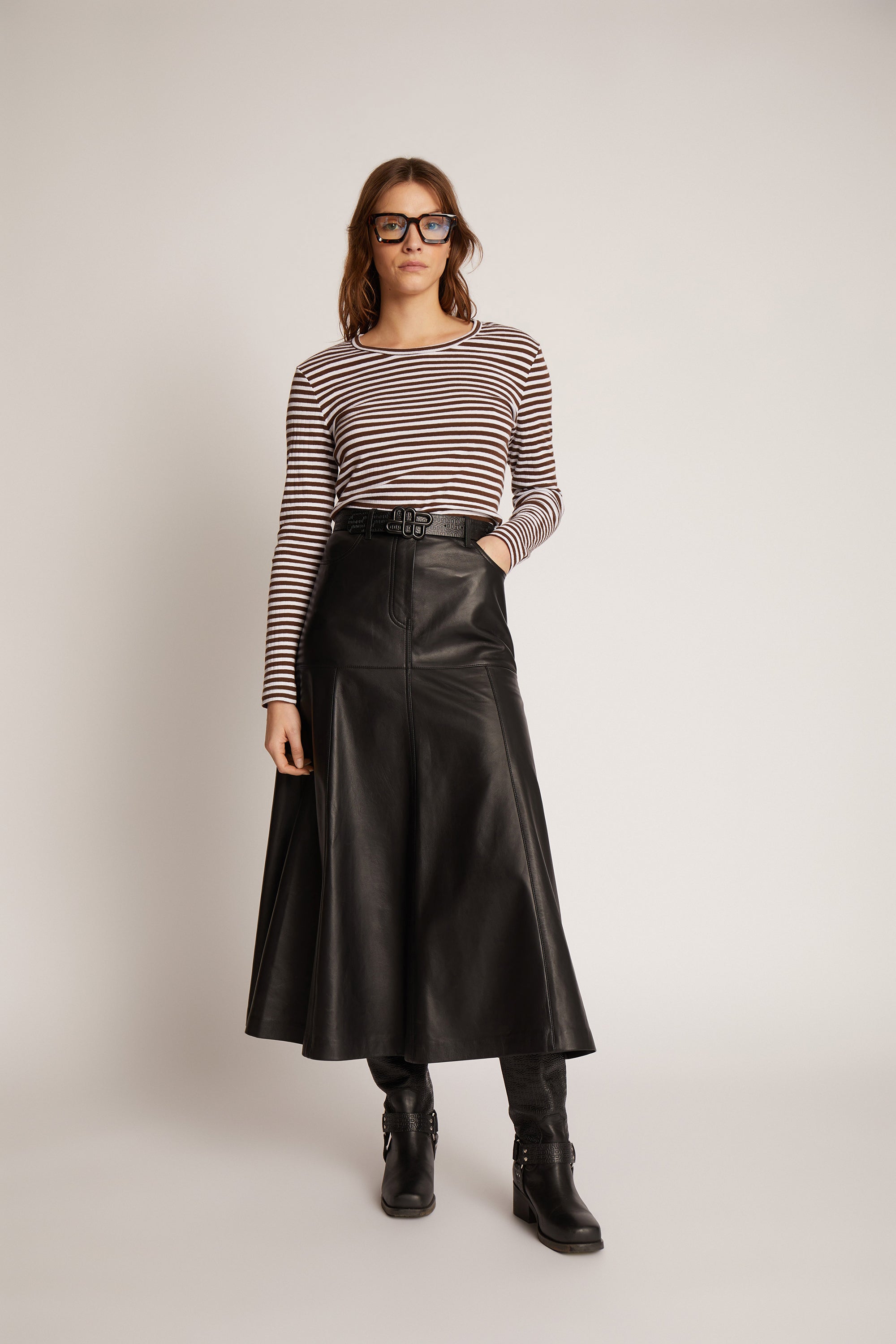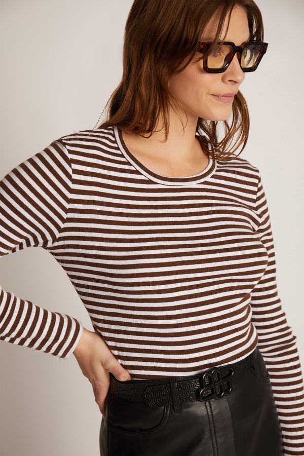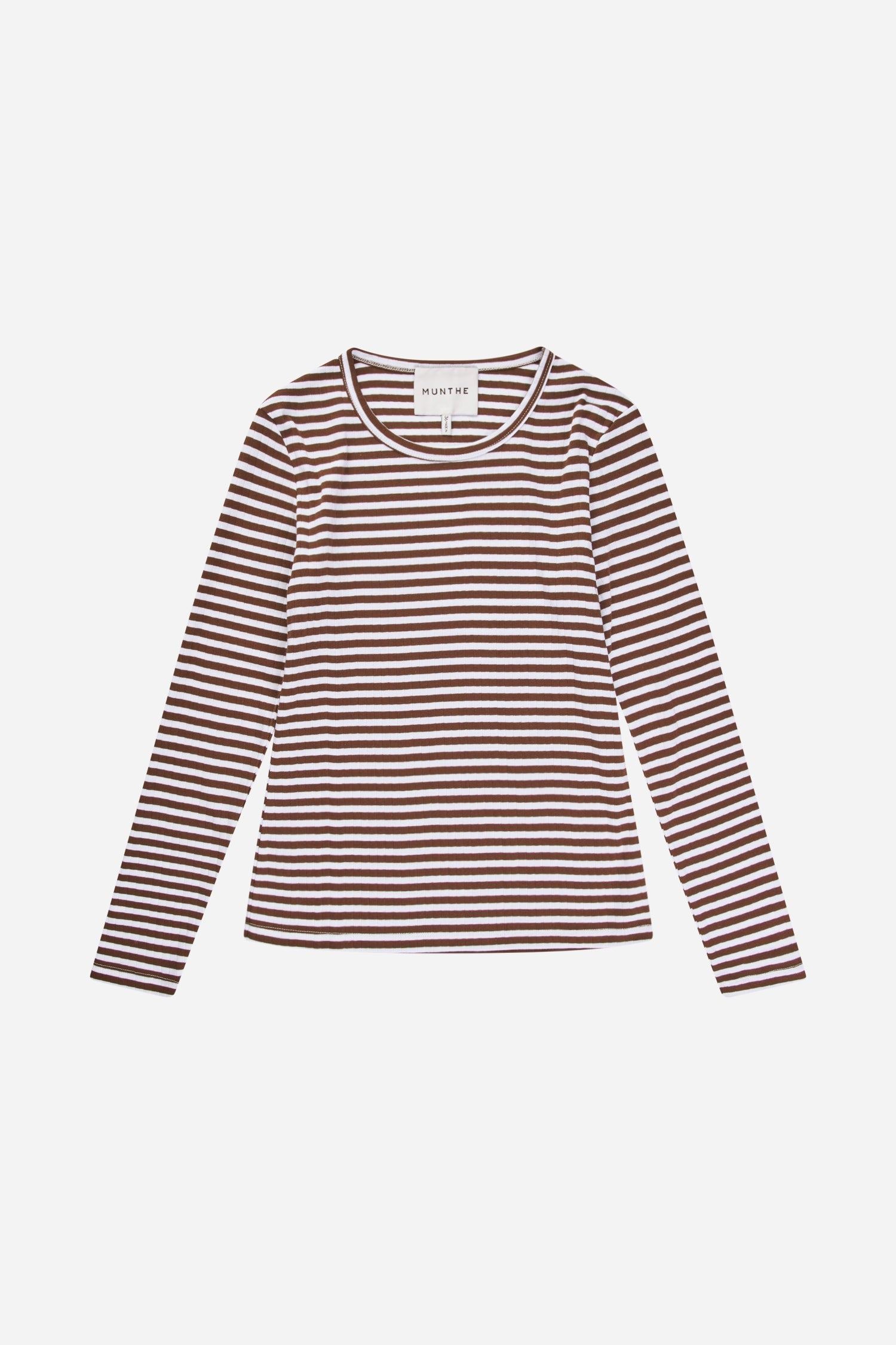 Blød stribet bluse i 100% økologisk bomuld. Blusen er designet i en tætsiddende pasform, med en rund hals, lange ærmer og en lav skuldersøm.
