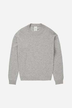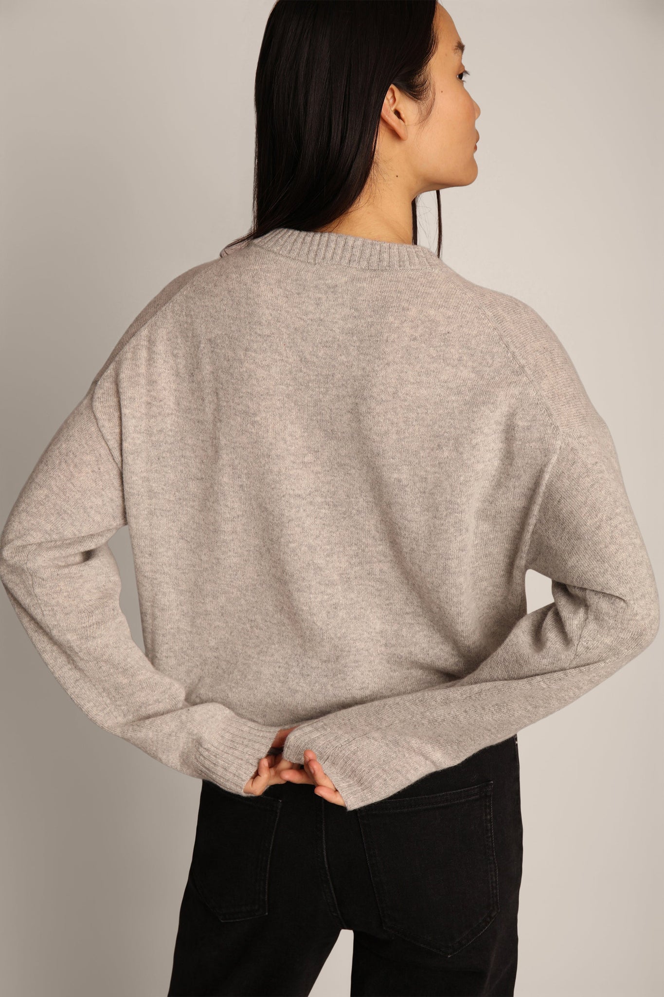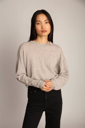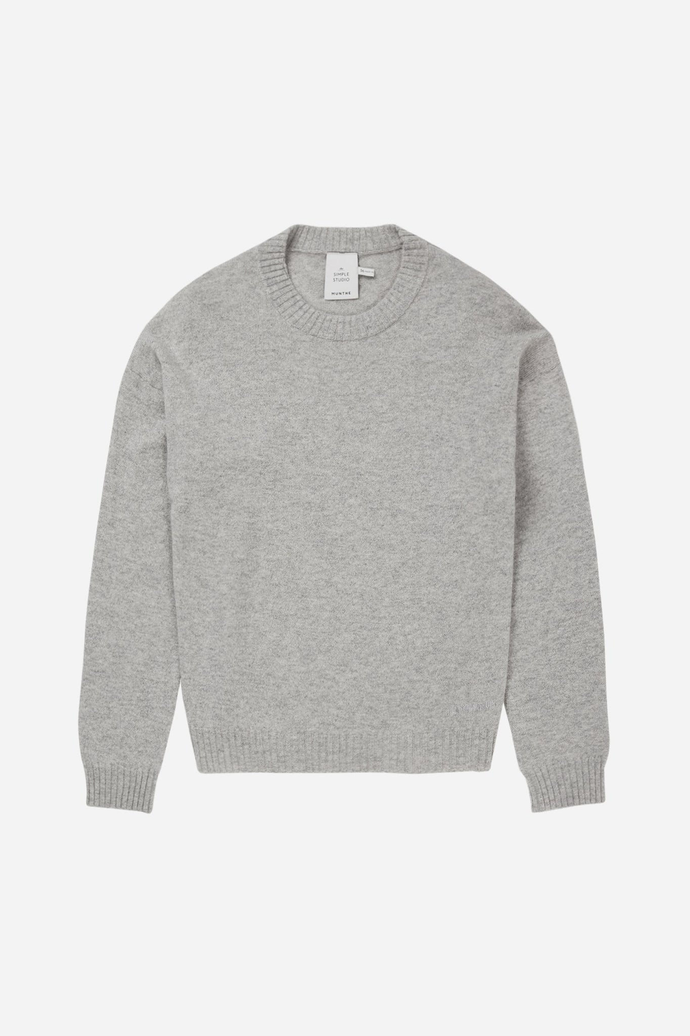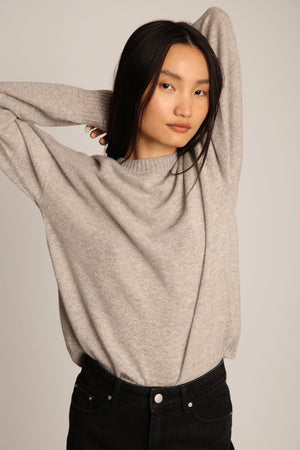 Blød klassisk strik lavet af 100% kashmir. Denne strik har lange ærmer, en rund halsudskæring og en elegant rib langs kanterne. Modellen er 177 cm høj og har en str. 36 på.