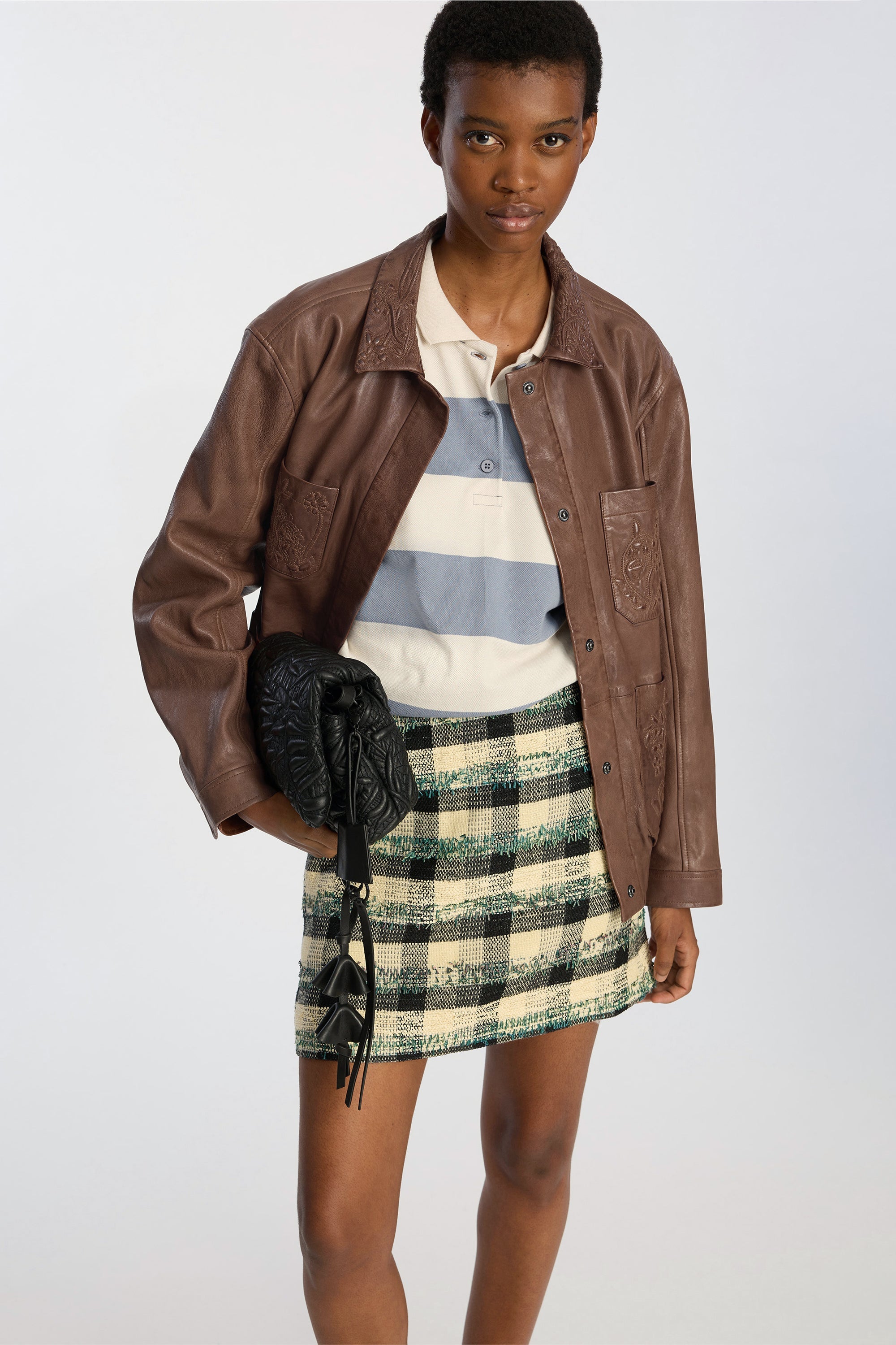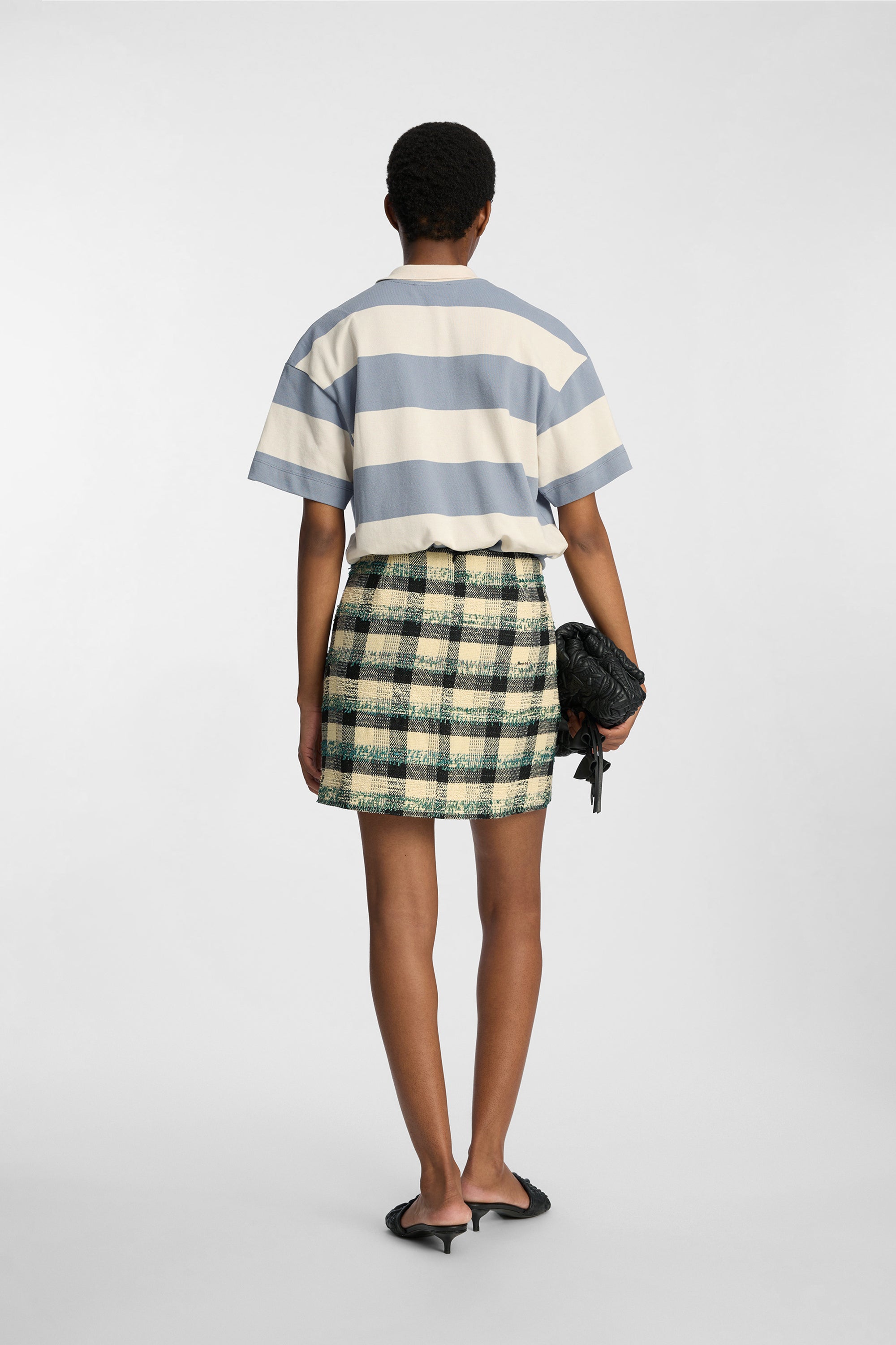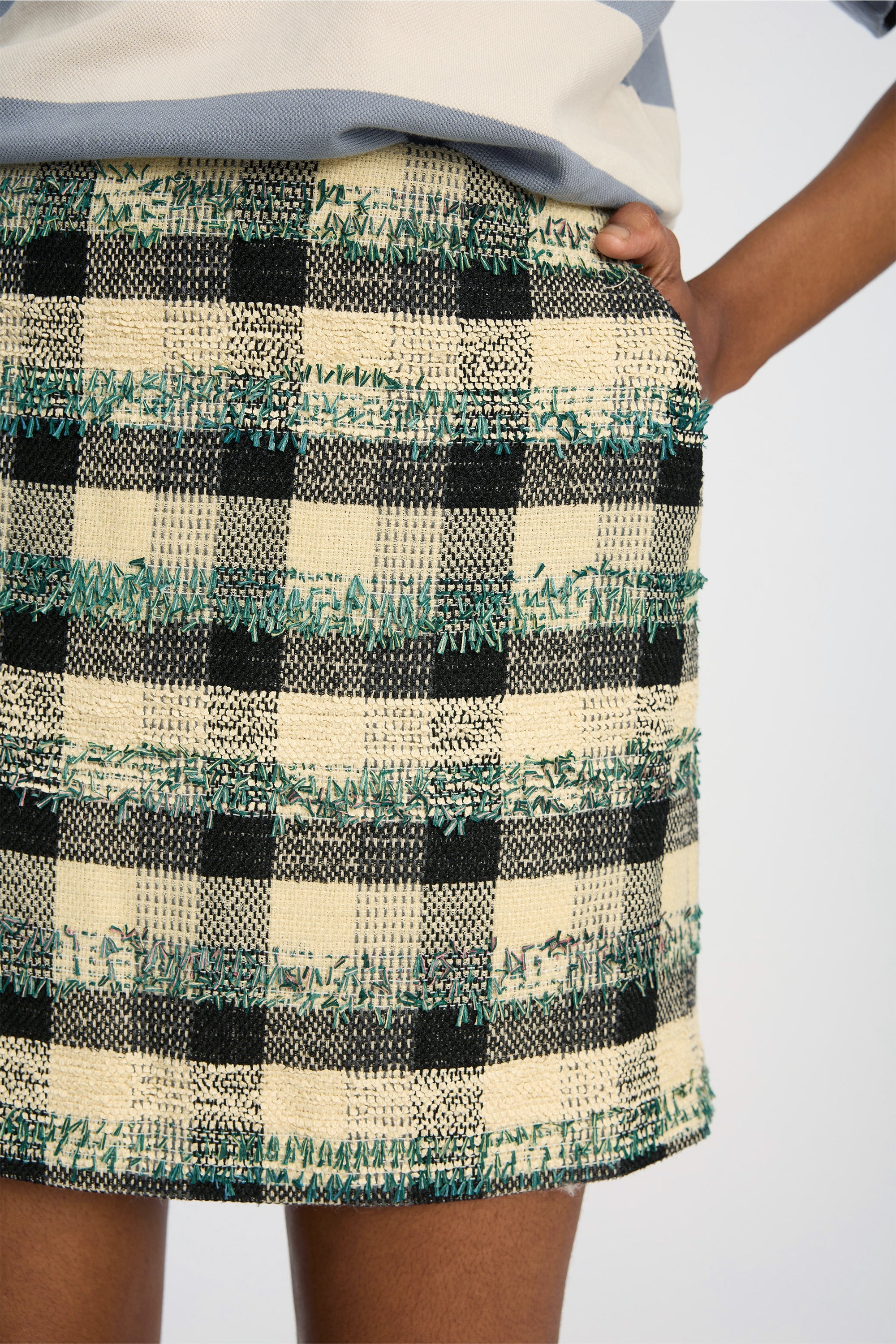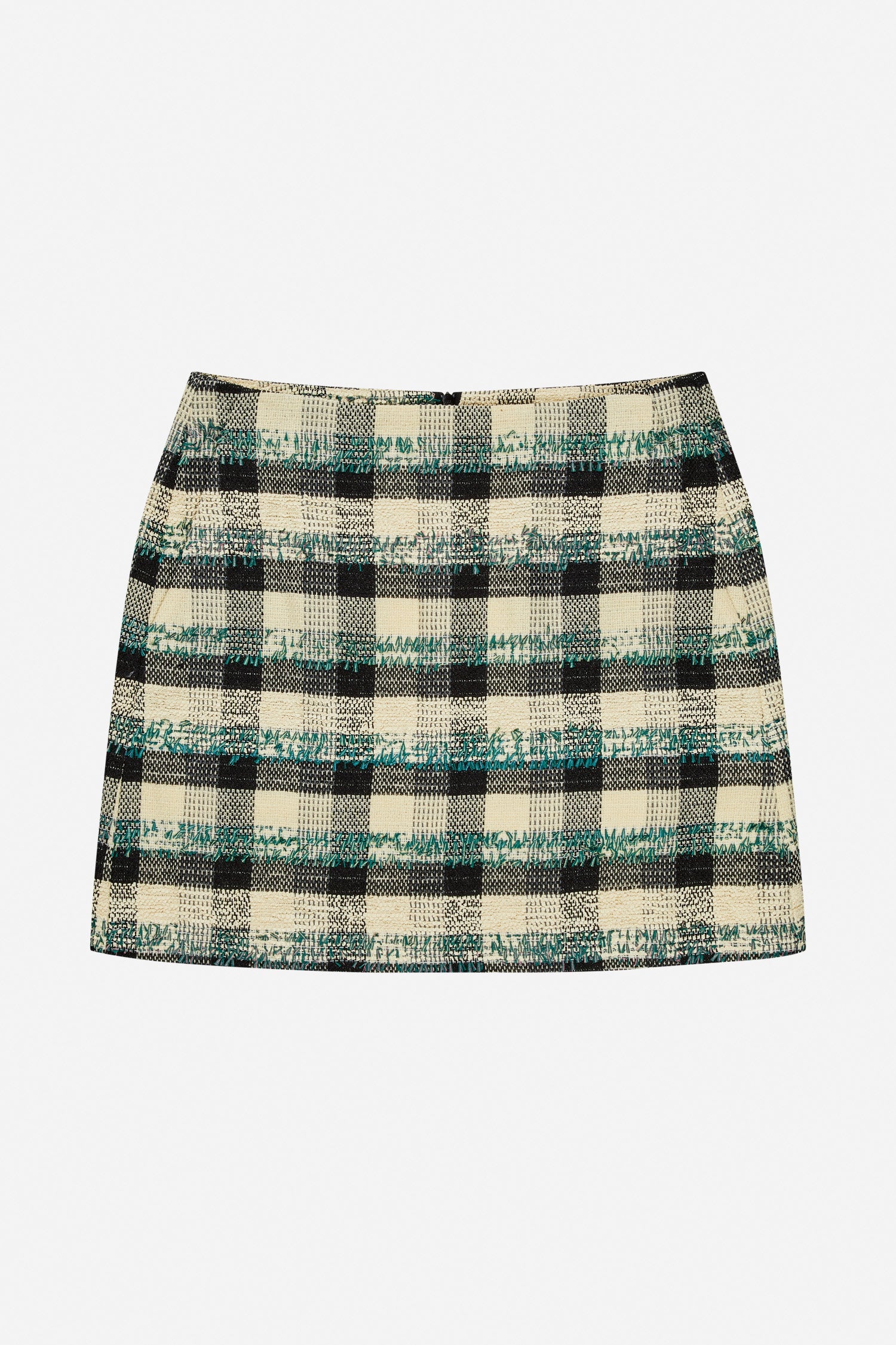 Denne nederdel har en kort, lige pasform og et flerfarvet ternet mønster. Modellen er fremstillet i et struktureret vævet materiale med 14% uld.