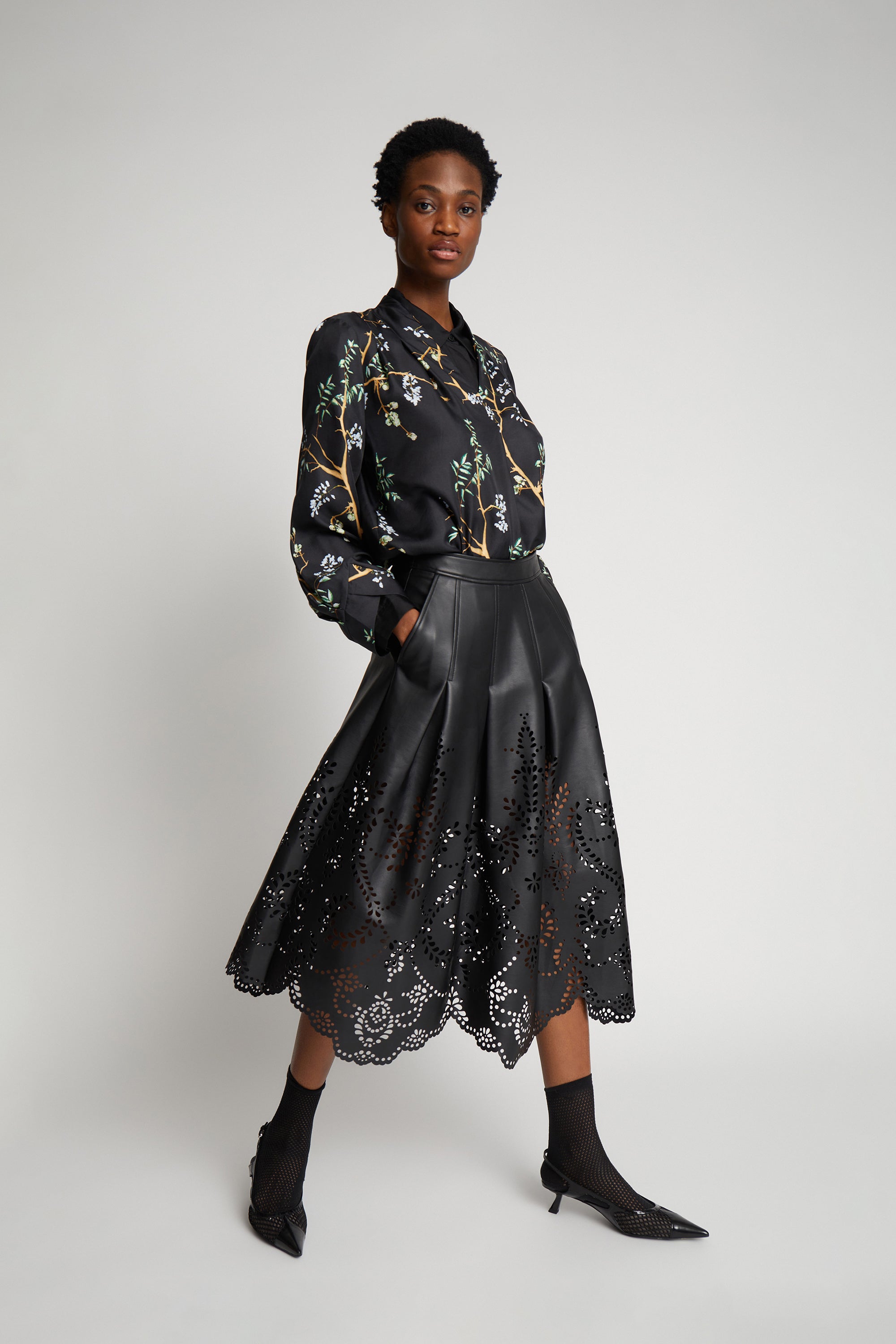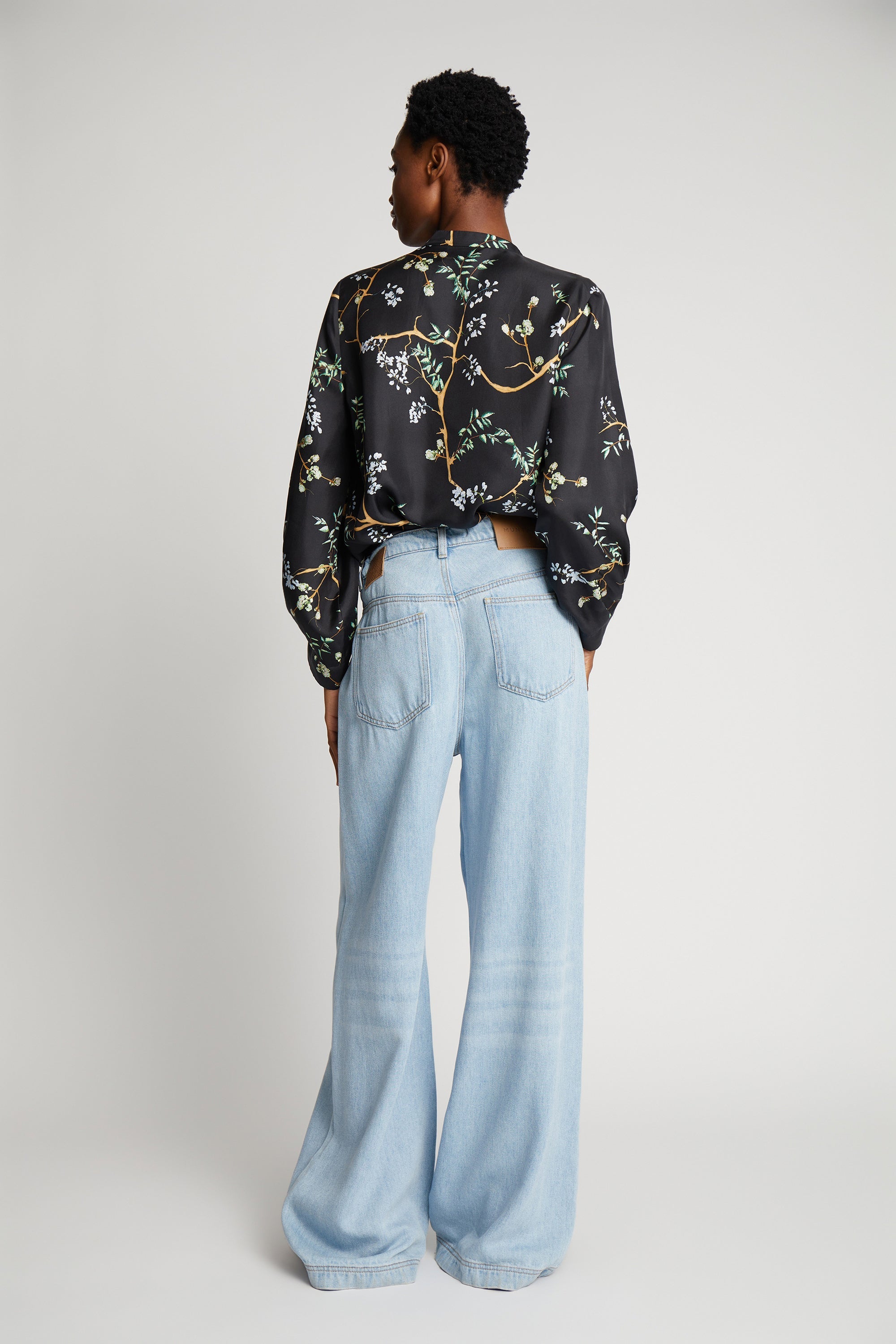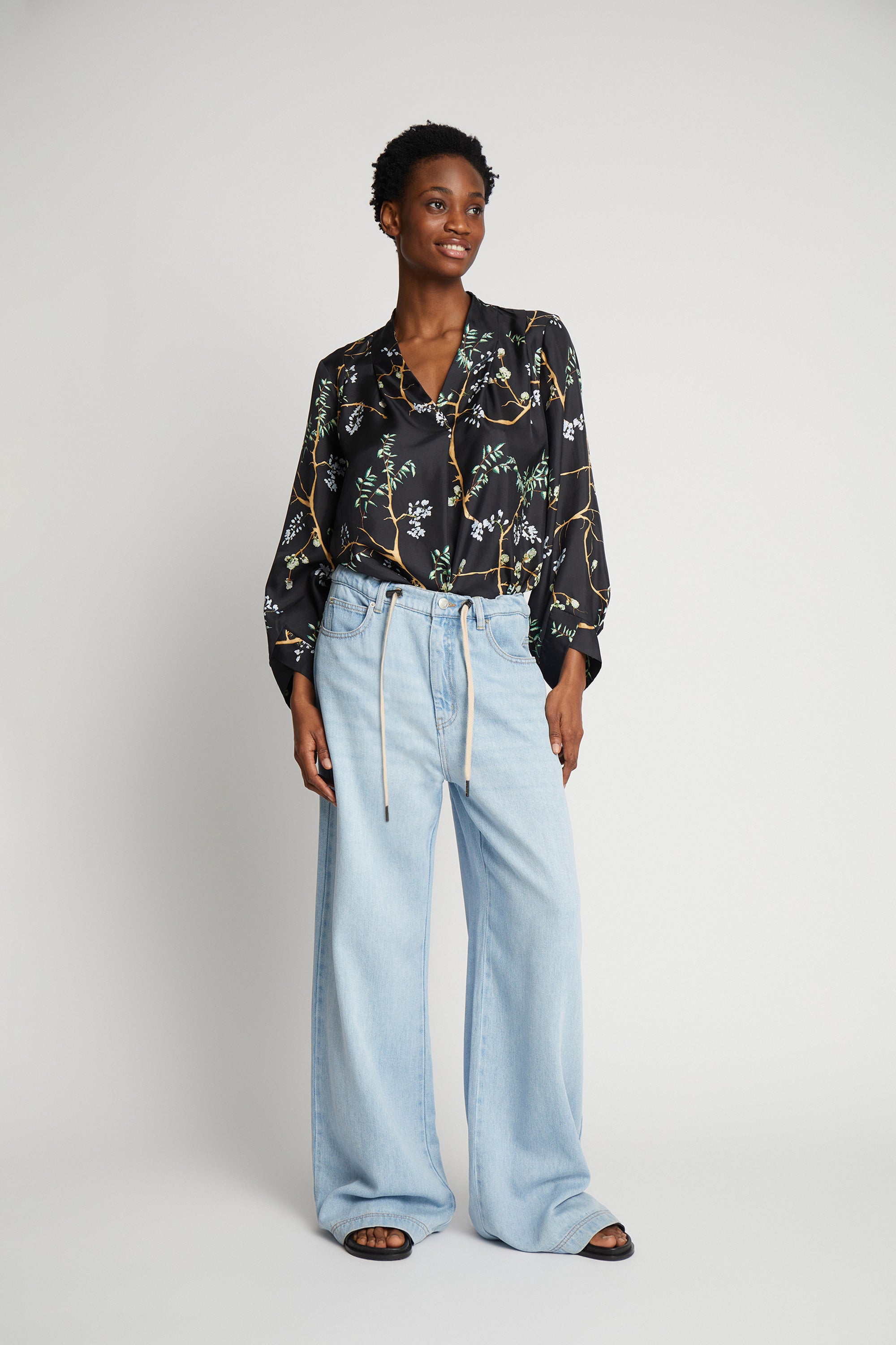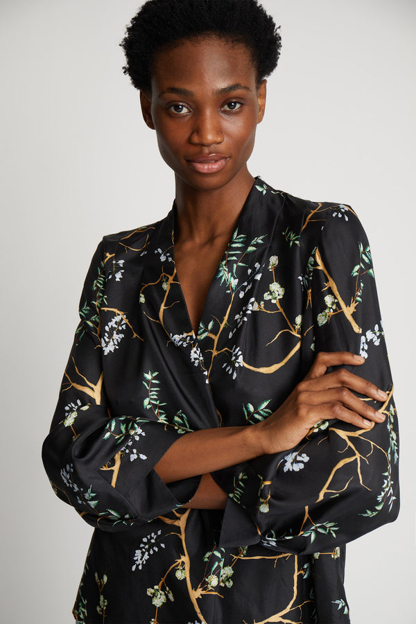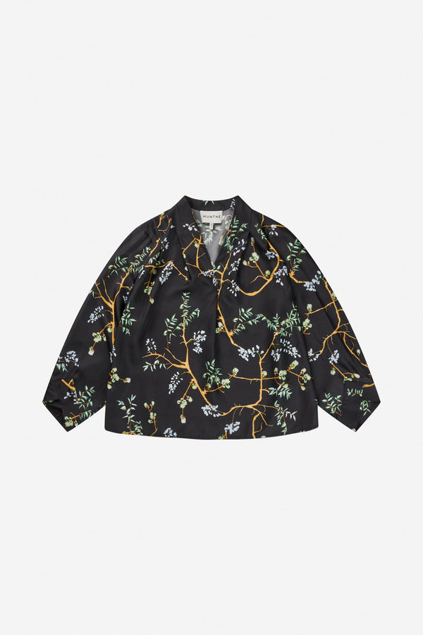 Bluse i 100% silke med et smukt all-over print. Blusen er designet med en dyb v-hals og en almindelig pasform.