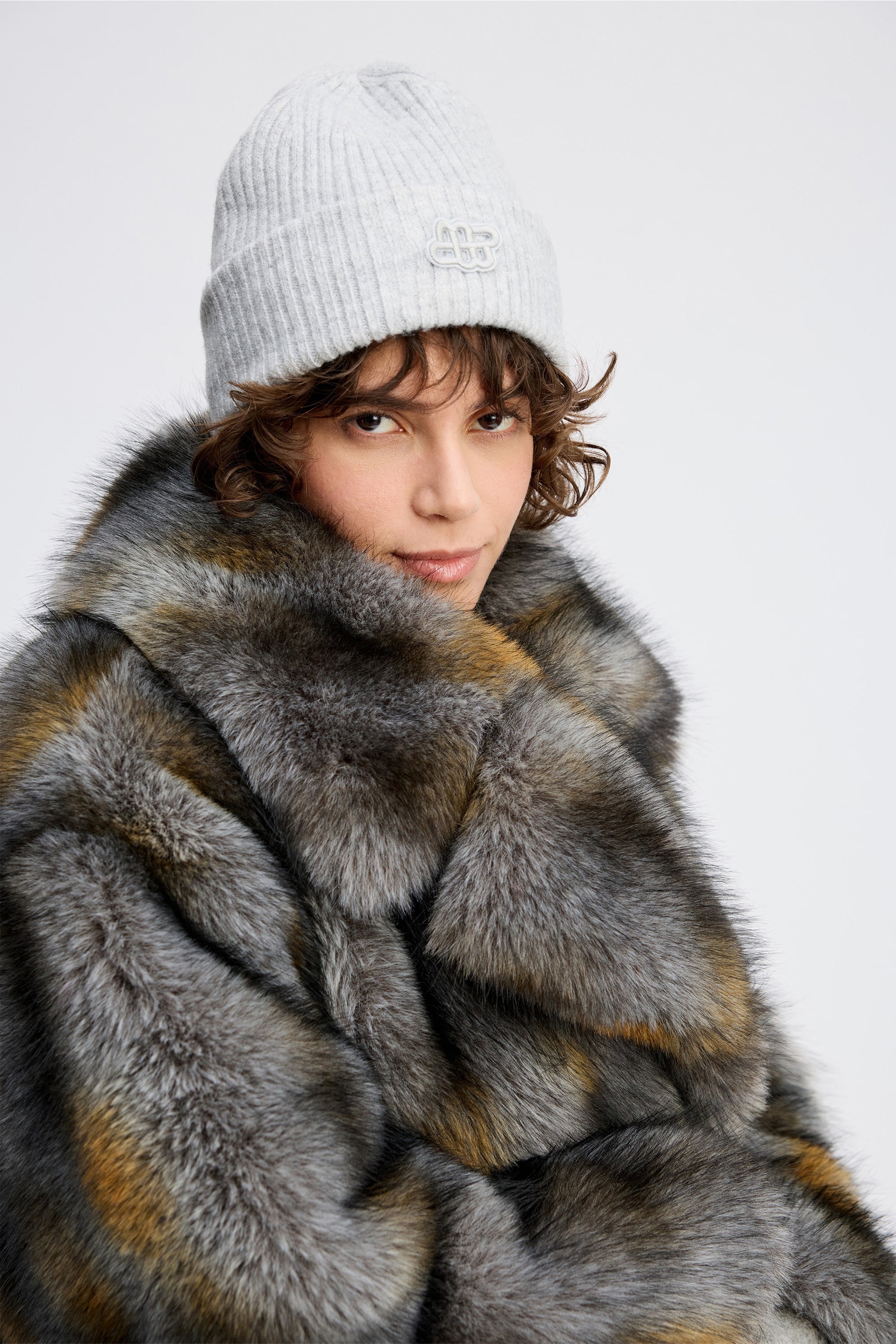 Blød og varm ribstrikket hue med opsmøg og tone-i-tone broderet logo.