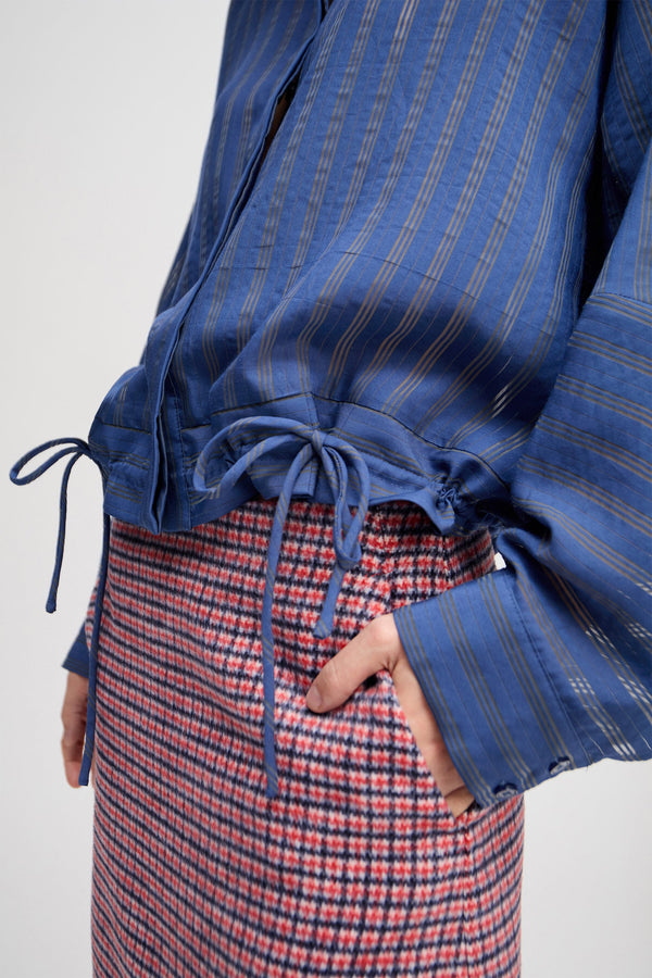 Skjorte med fine, semitransparente striber og smukke bindebånds detaljer nederst, samt på ærmerne. Skjorten er designet med løse ærmer og kan styles både åben og lukket.