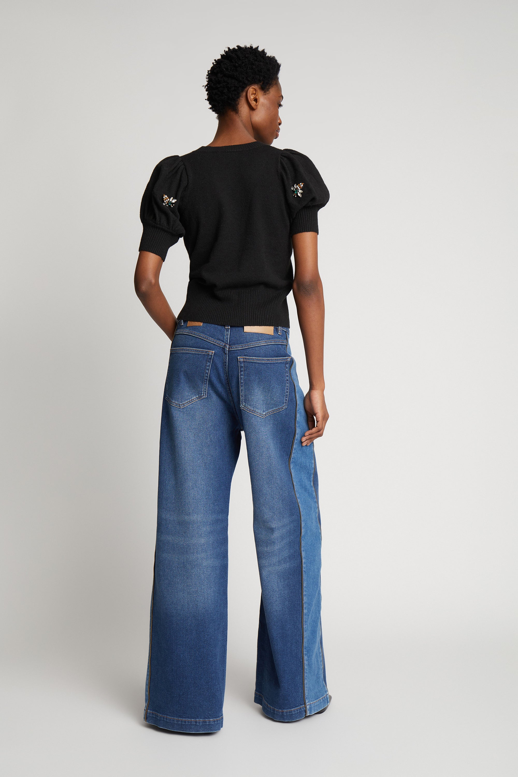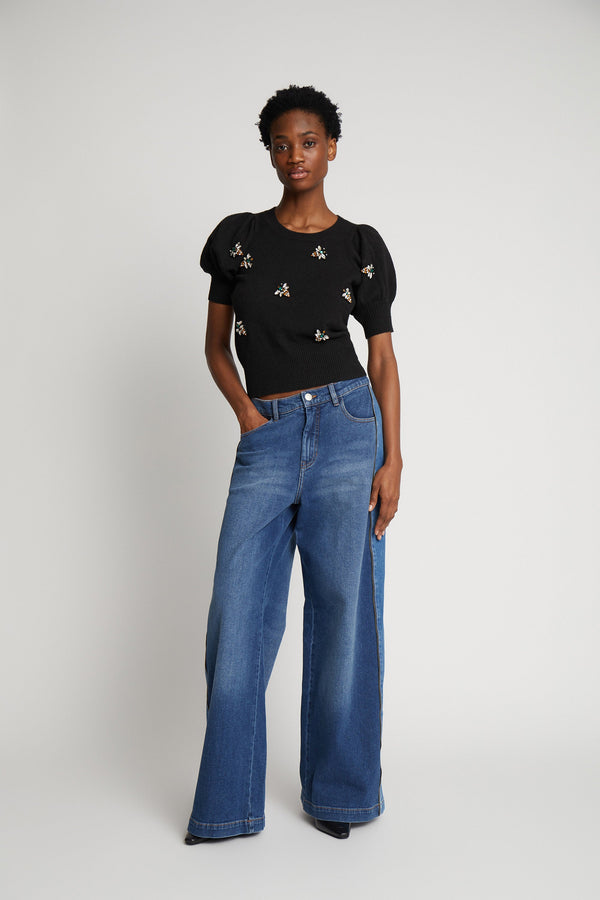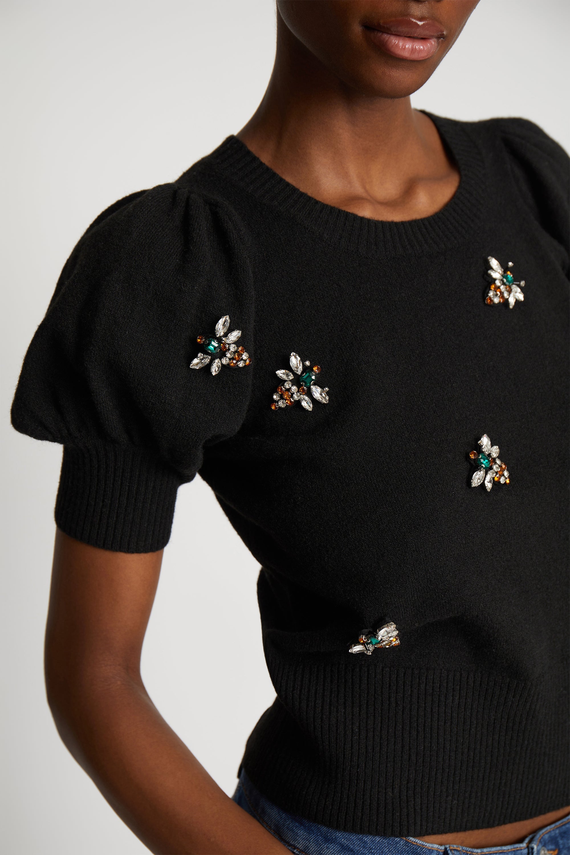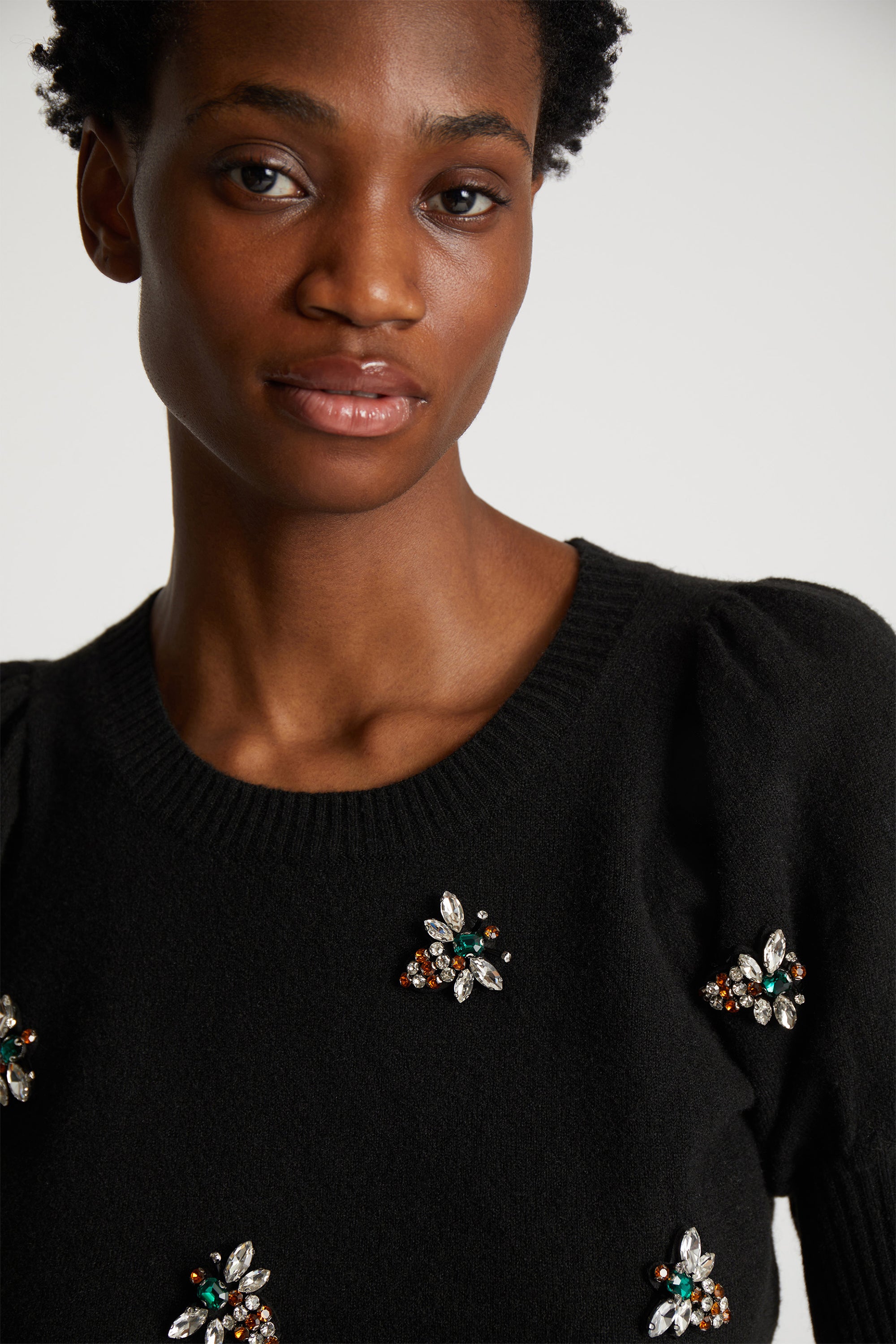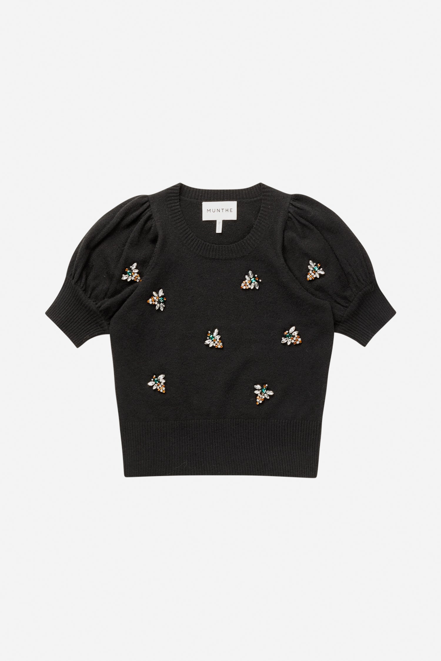 Strik med smukke bi-brocher elegant placeret over hele strikken. Denne strik har korte feminine pufærmer og en bred rib for enden af ærmerne og forneden.