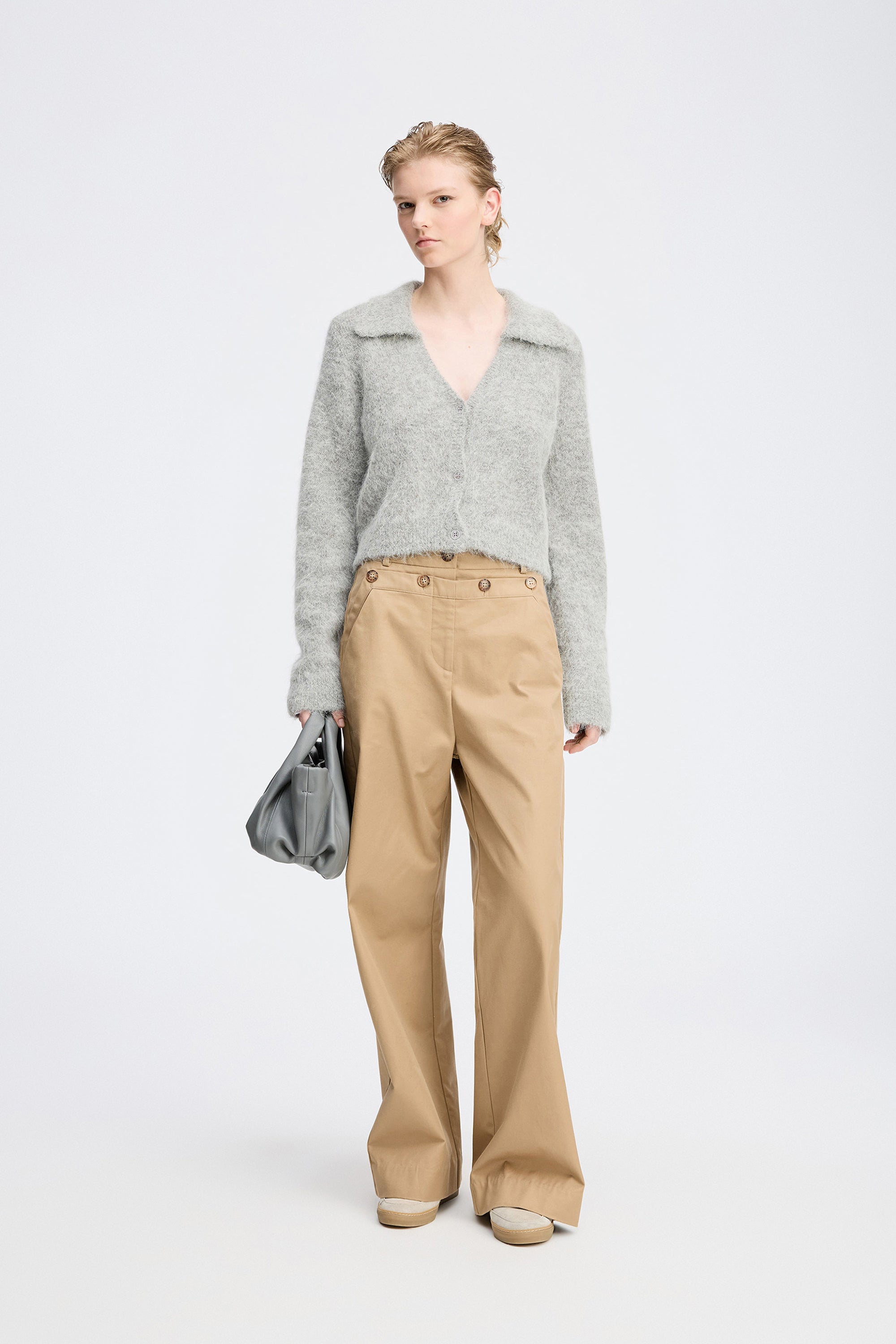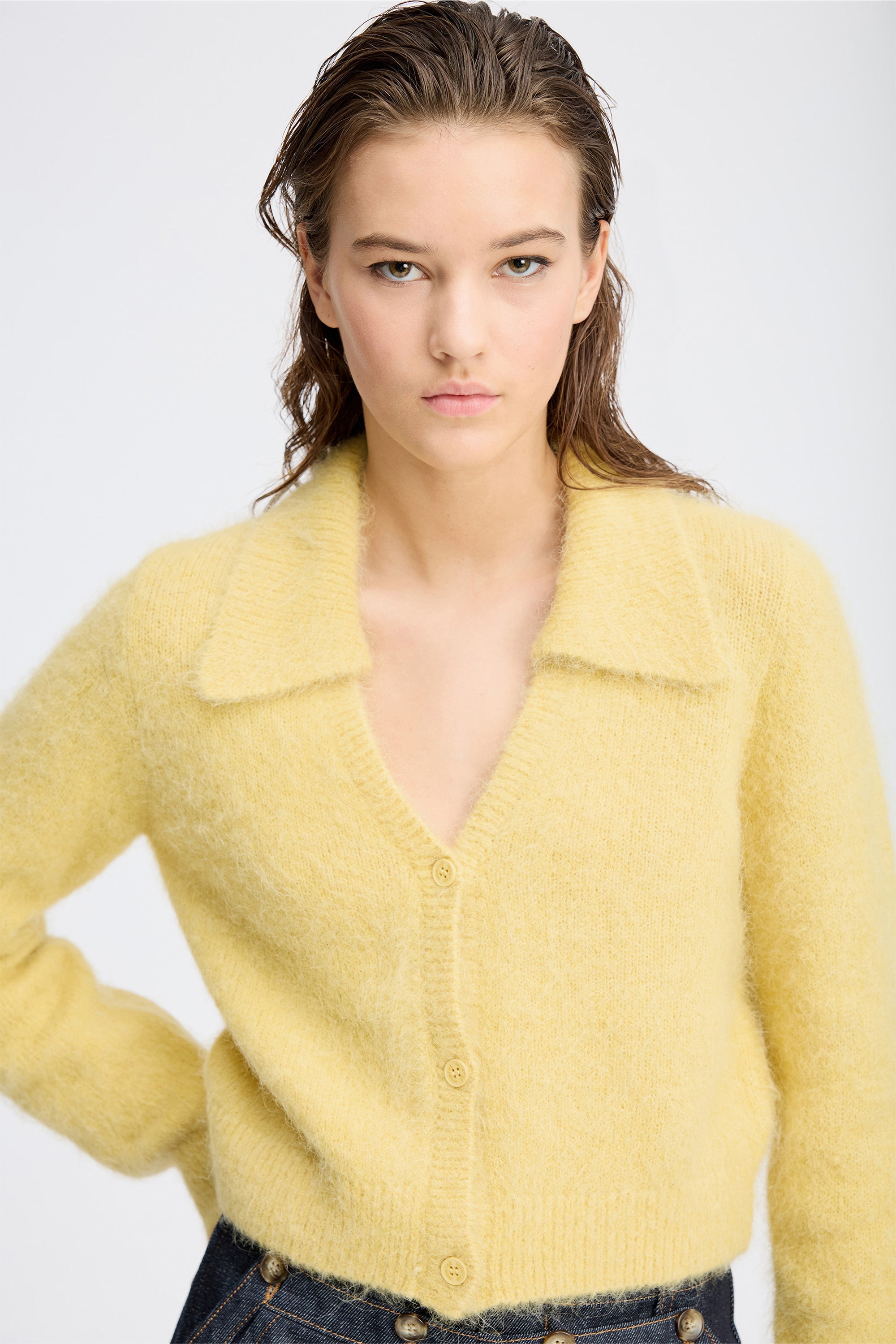 En blød strik cardigan med en elegant lille puf ved skuldrene. Denne cardigan har lange ærmer og en knaplukning.