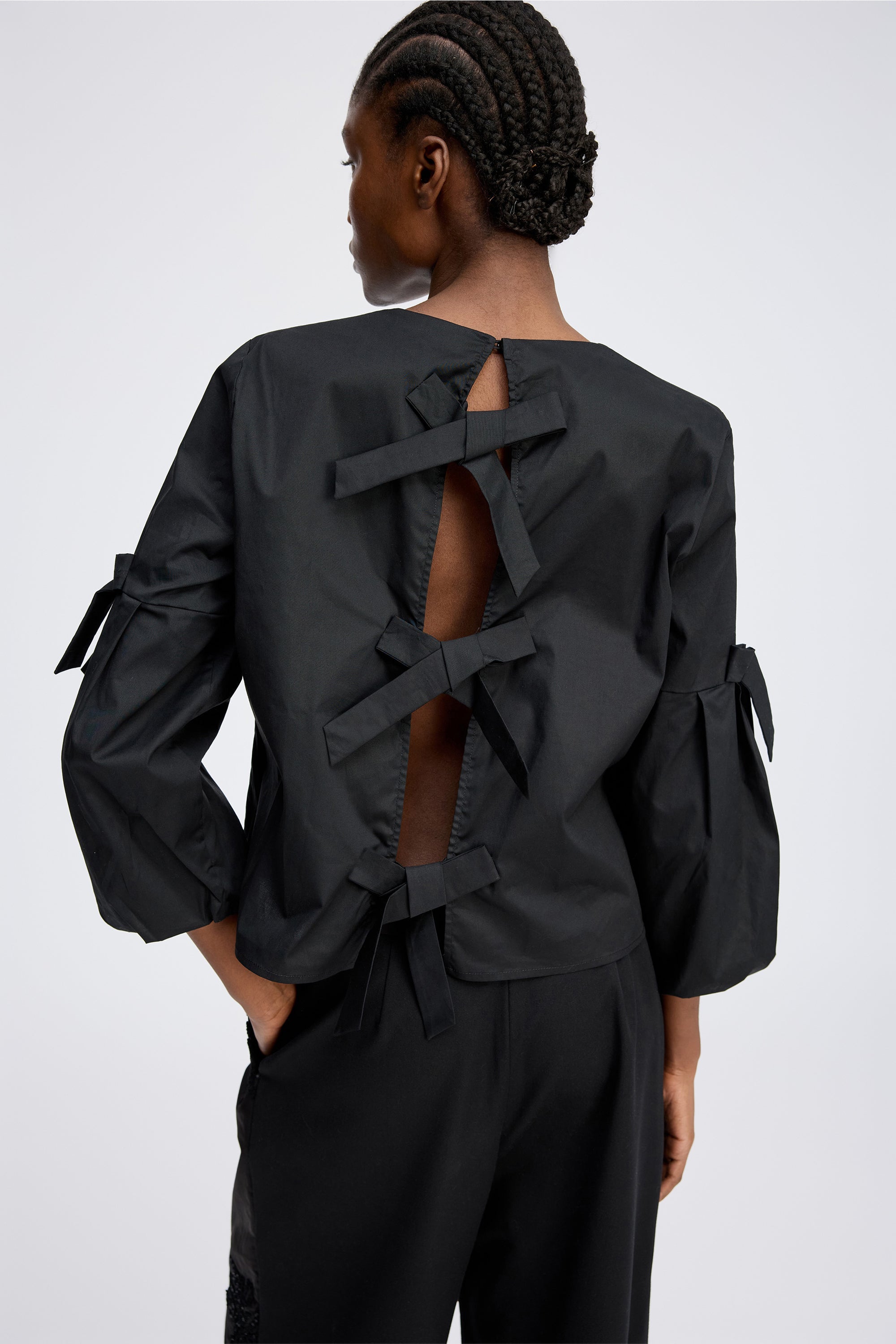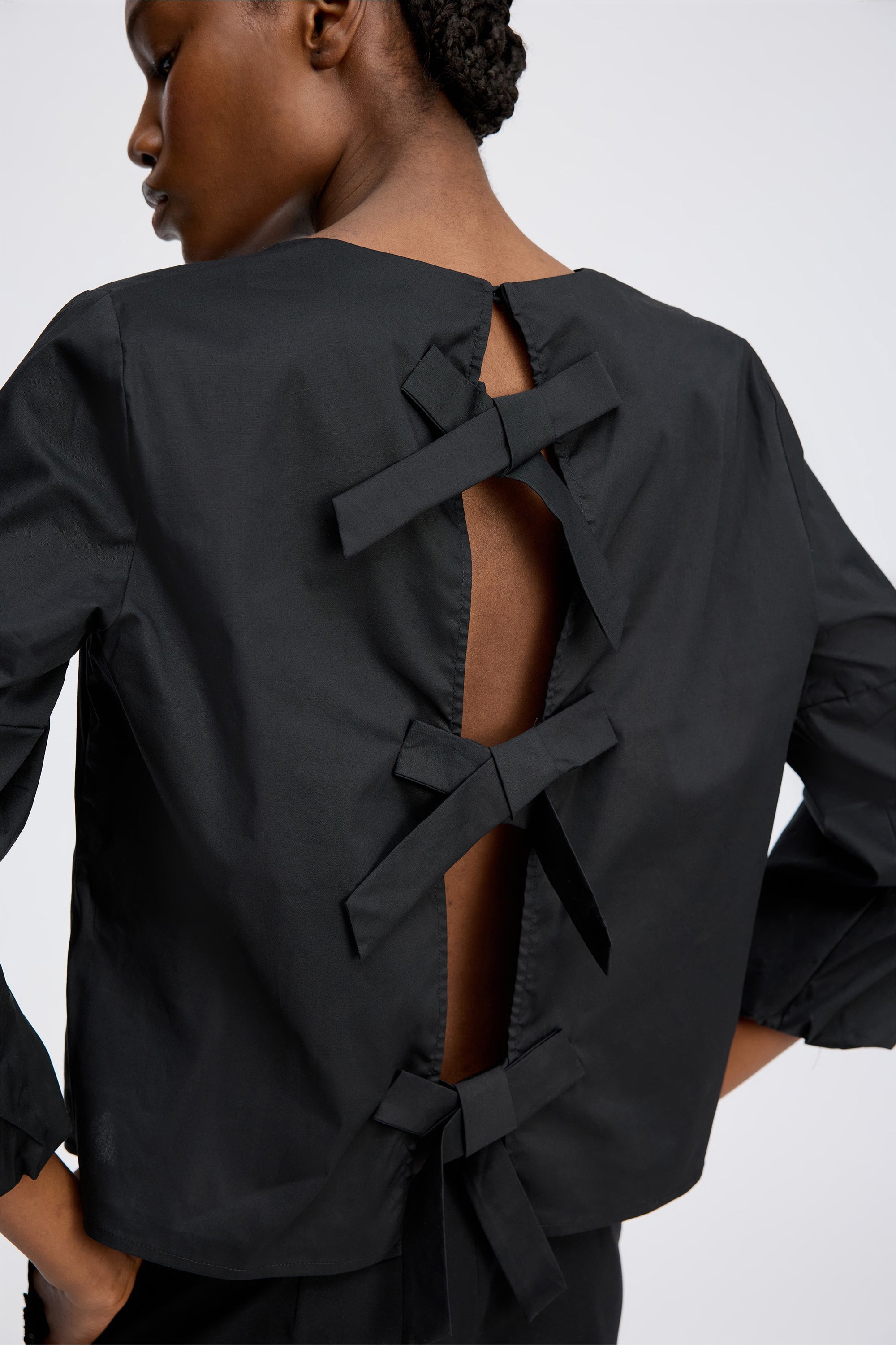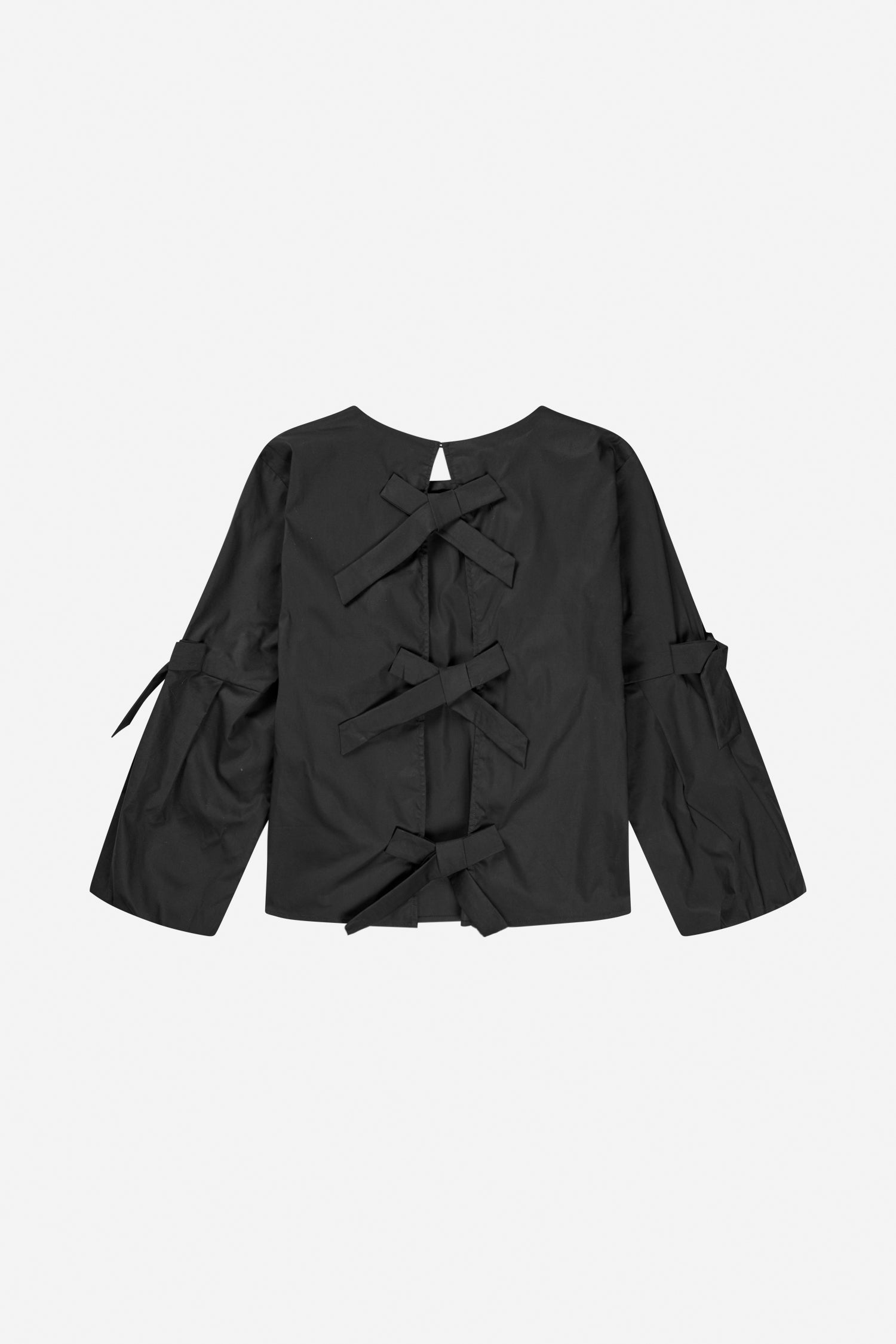 Elegant bluse med fine sløjfedetaljer på ærmer og ryg. Blusen har en smuk rynkedetalje ved hals og ærmer og er designet med åben ryg, som samles ved hjælp af tre fine sløjfer.
