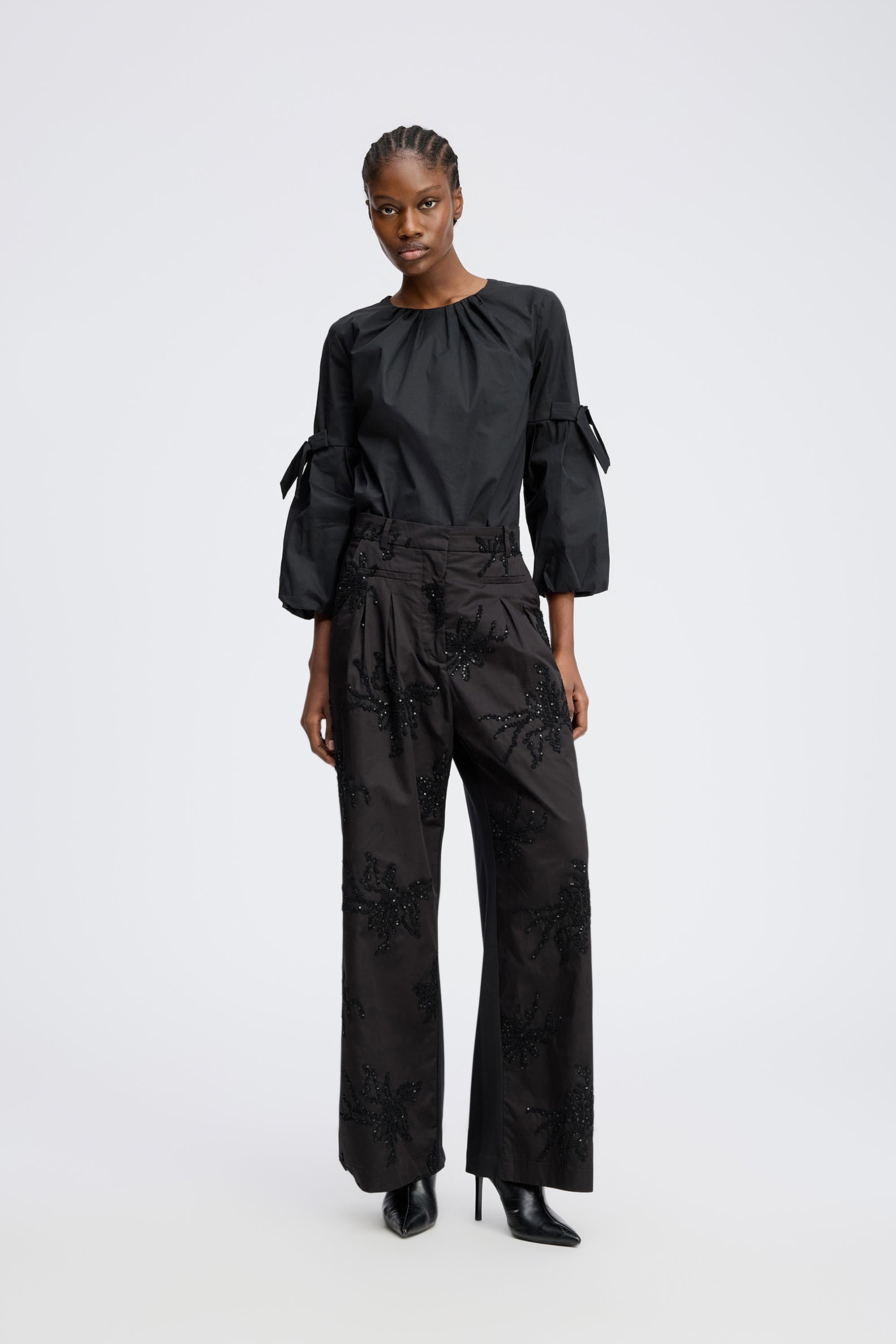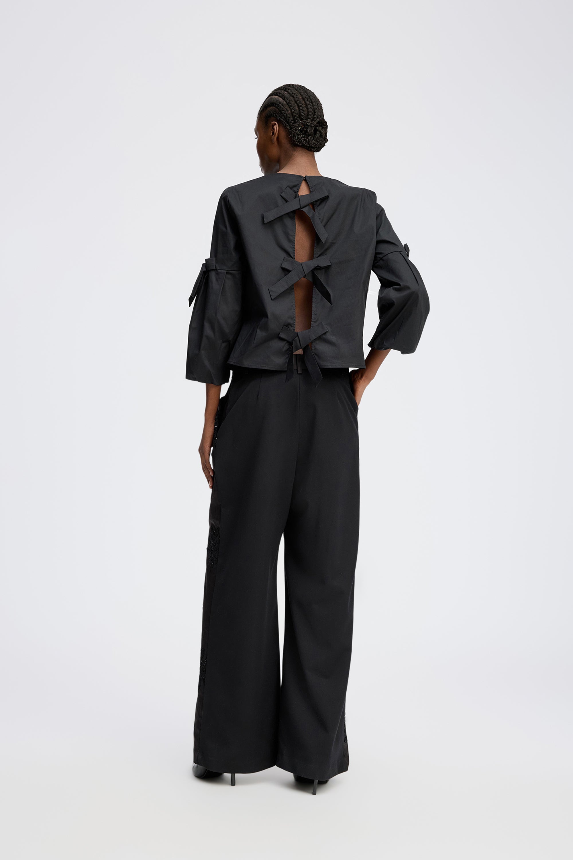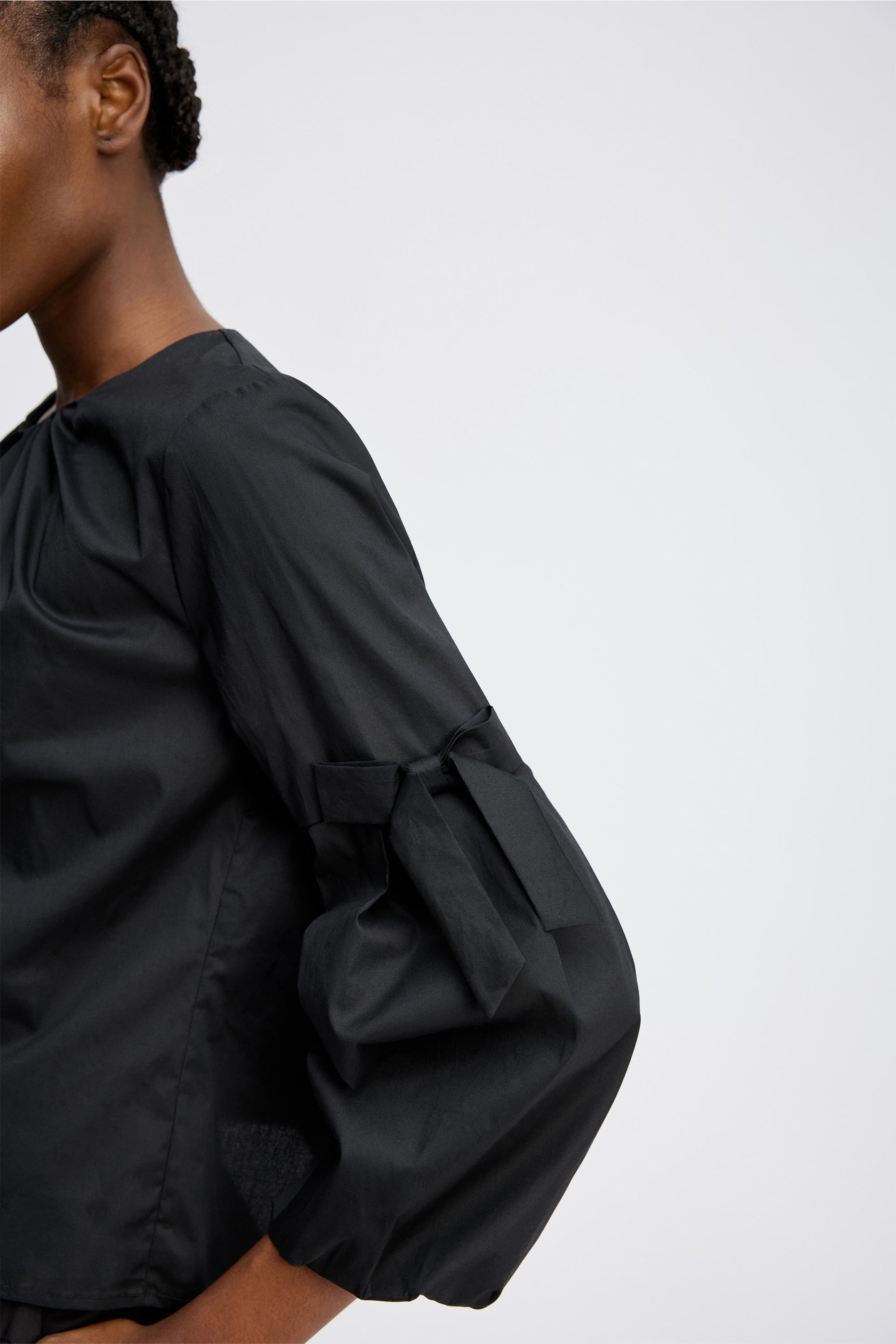 Elegant bluse med fine sløjfedetaljer på ærmer og ryg. Blusen har en smuk rynkedetalje ved hals og ærmer og er designet med åben ryg, som samles ved hjælp af tre fine sløjfer.