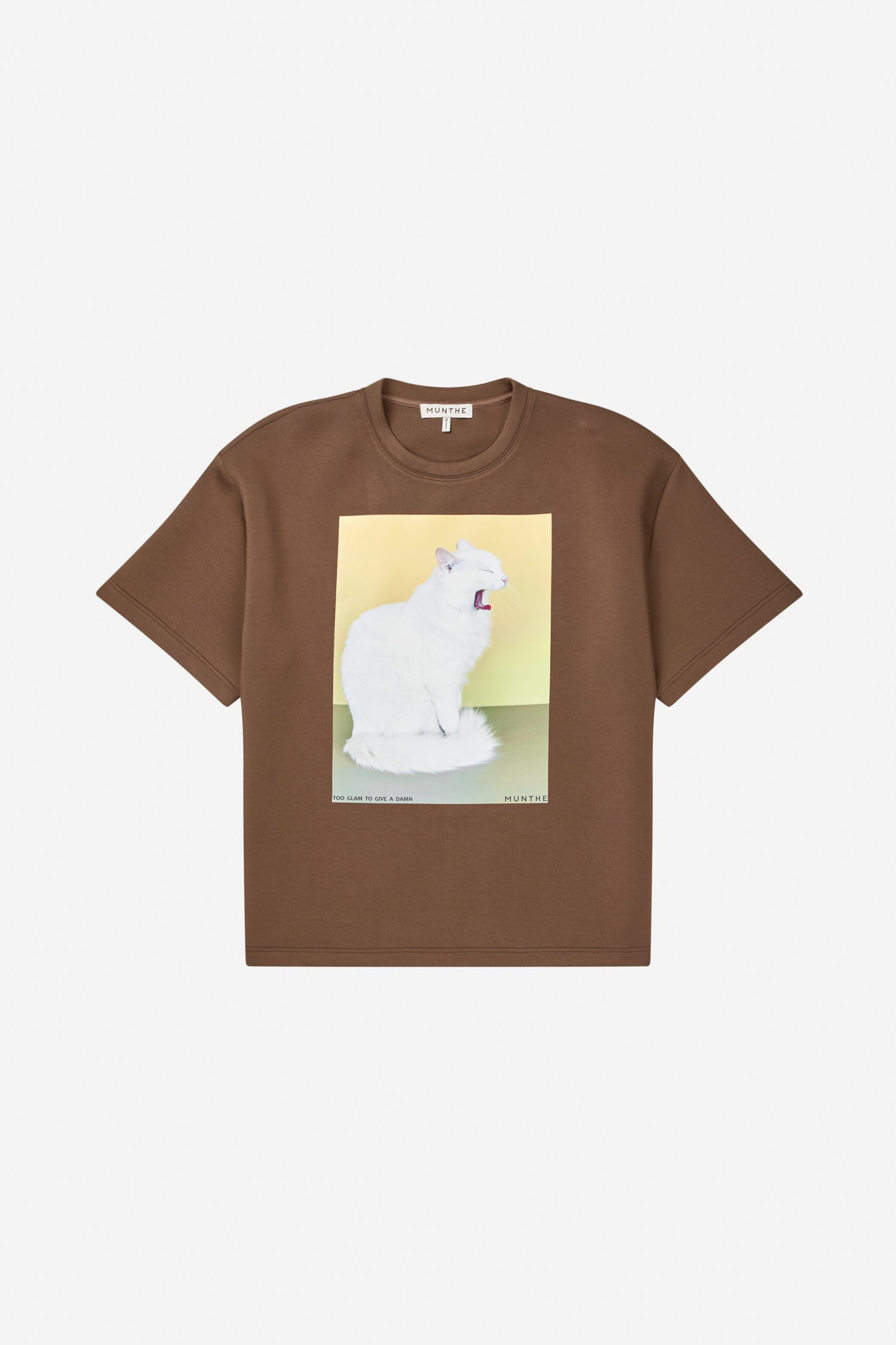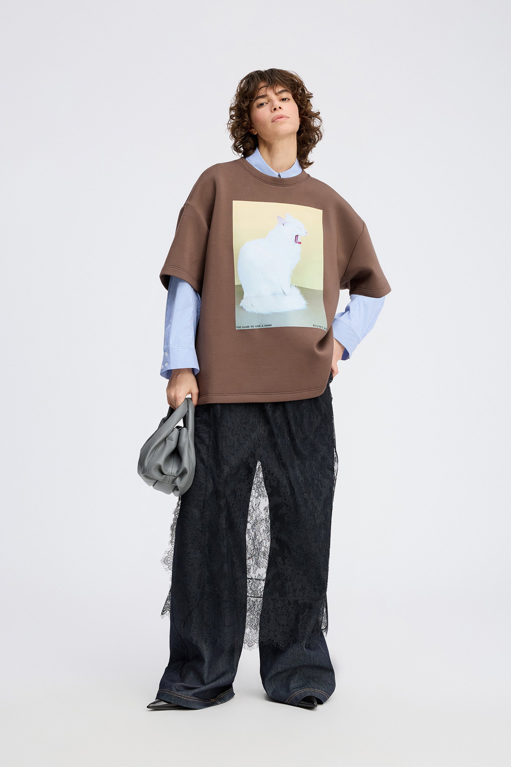 Neopren bluse med et elegant katteprint. Denne bluse er oversize, har korte ærmer og en rund halsudskæring.