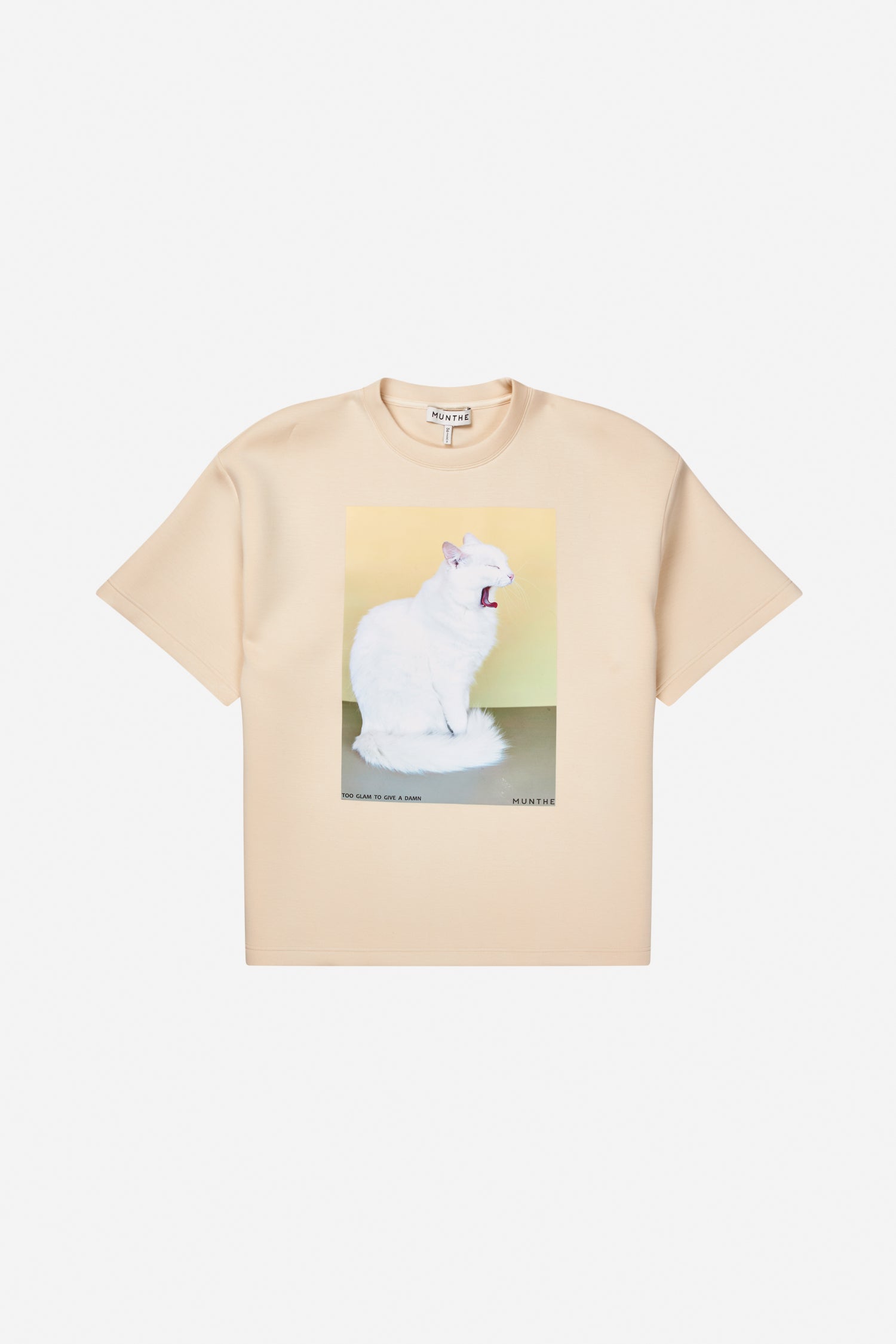 Neopren bluse med et elegant katteprint. Denne bluse er oversize, har korte ærmer og en rund halsudskæring.