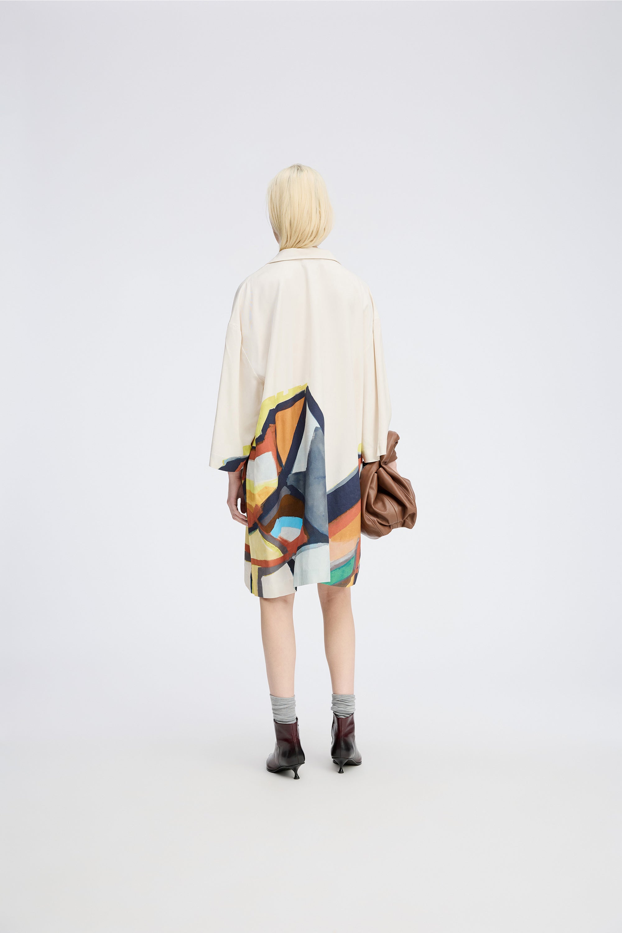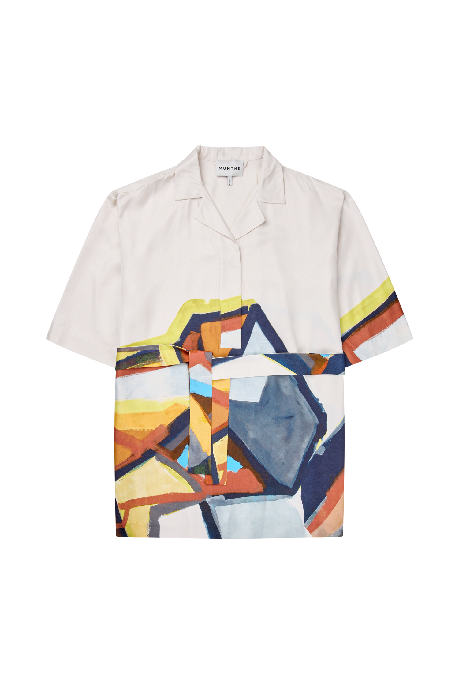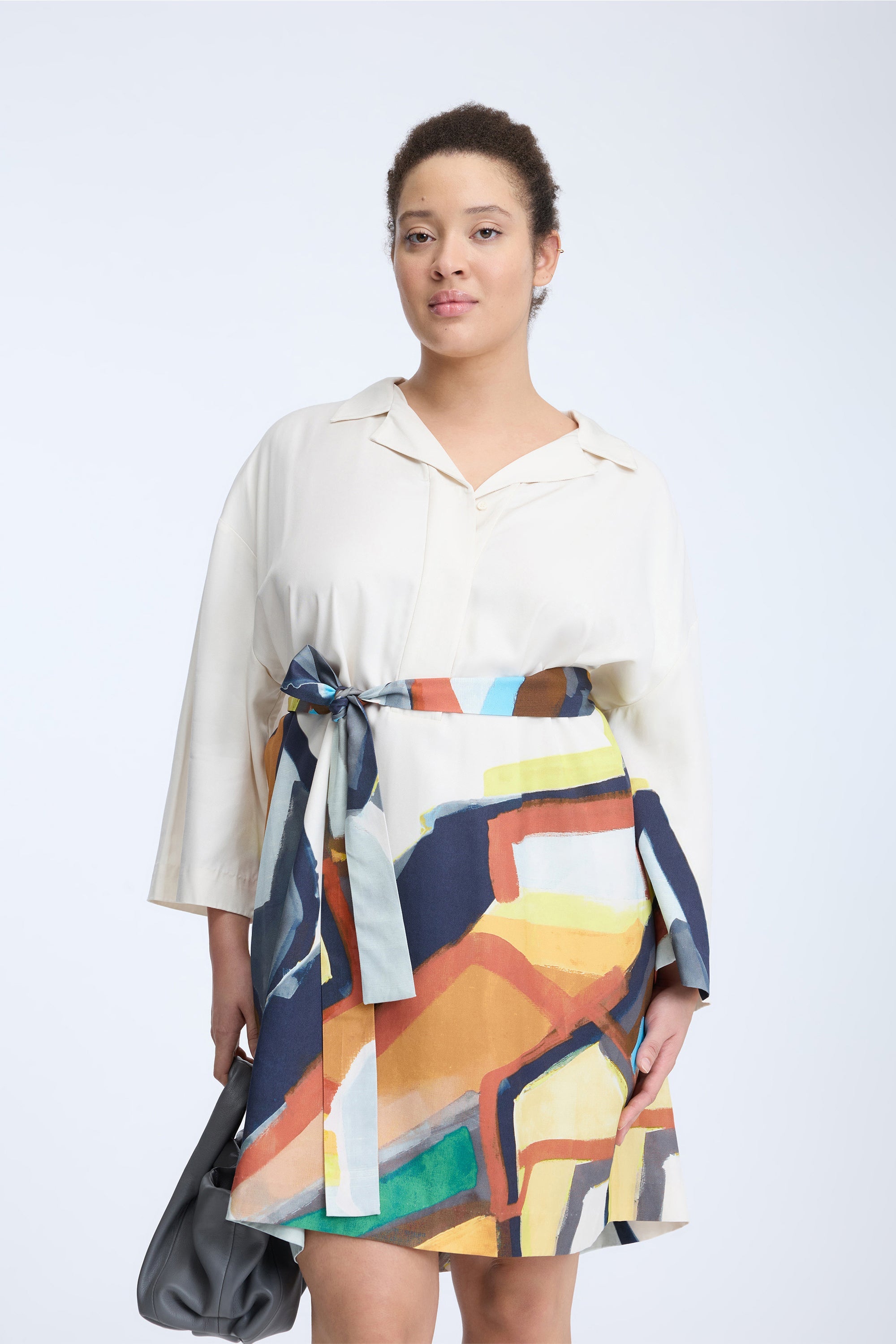 Kortærmet skjorte med smukt, farverigt kunstprint. Designet med åben krave og afslappet pasform – kan styles med eller uden det aftagelige bindebælte for et personligt udtryk.