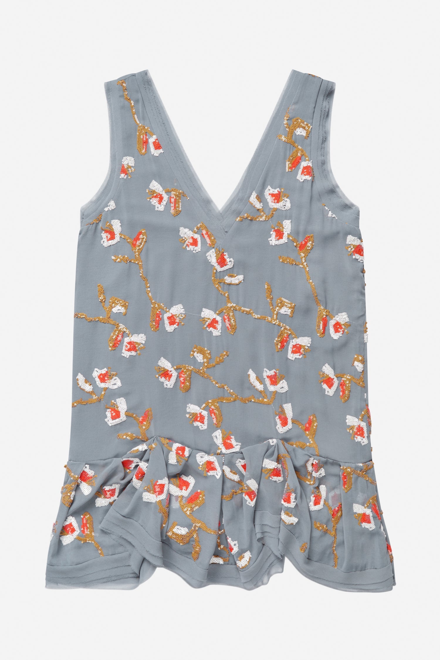 Minikjole i blød, lysgrå chiffon, pyntet med pailletter i et elegant blomstermønster. Kjolen har dyb V-udskæring, let A-formet pasform og asymmetrisk flæsekant forneden.