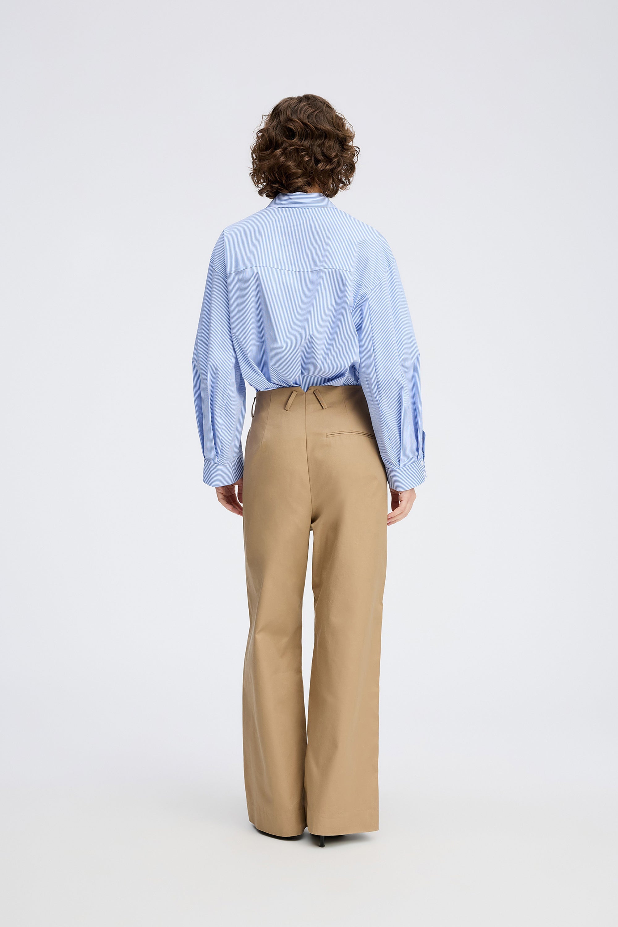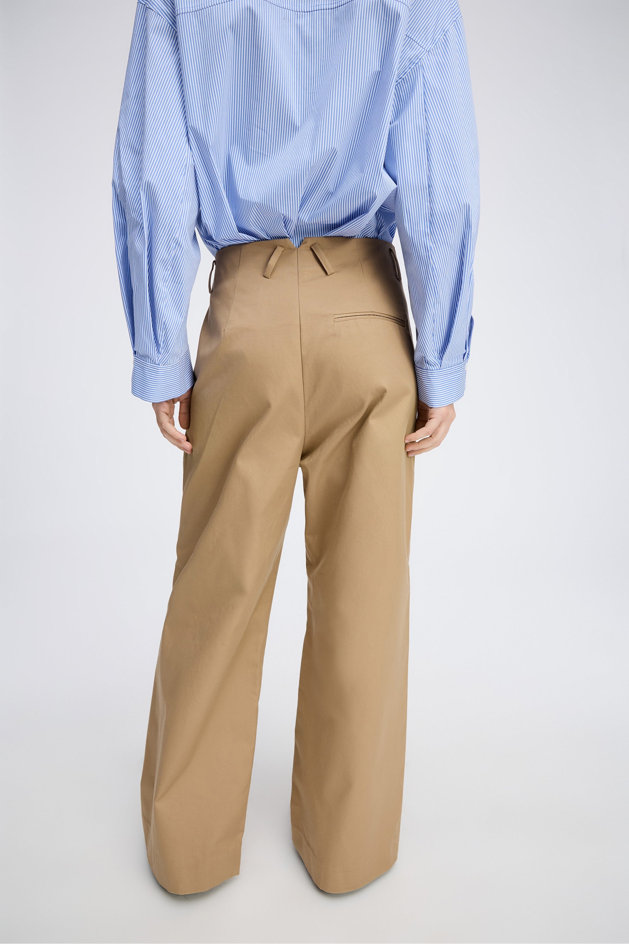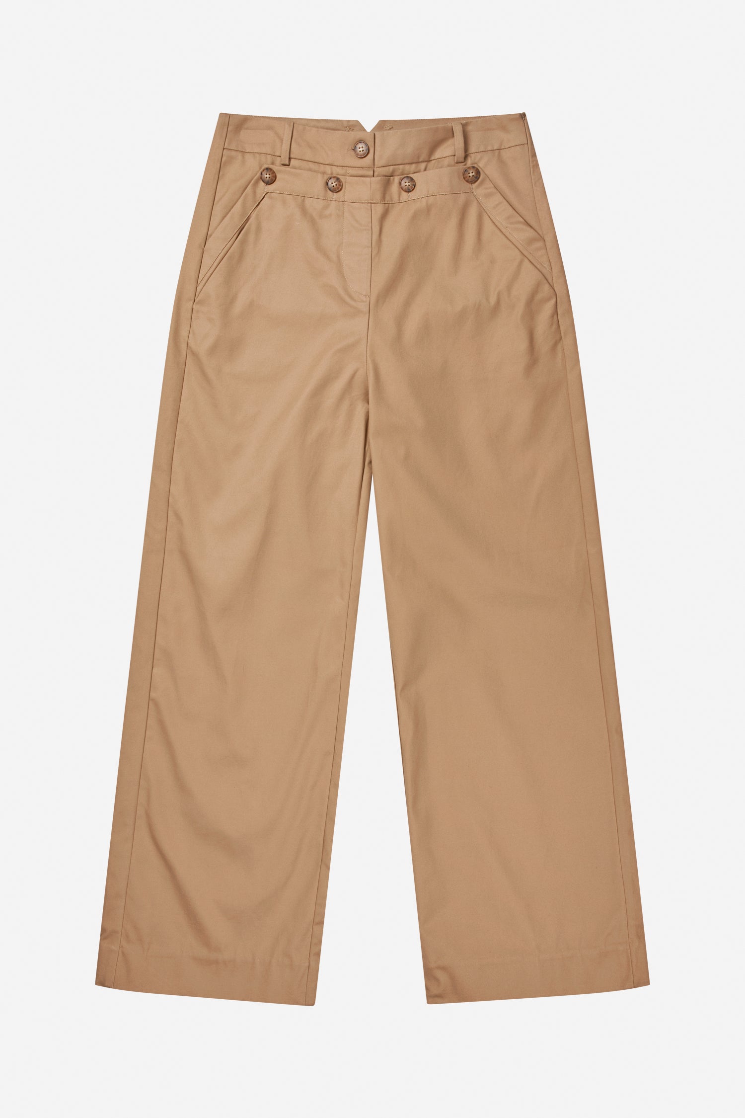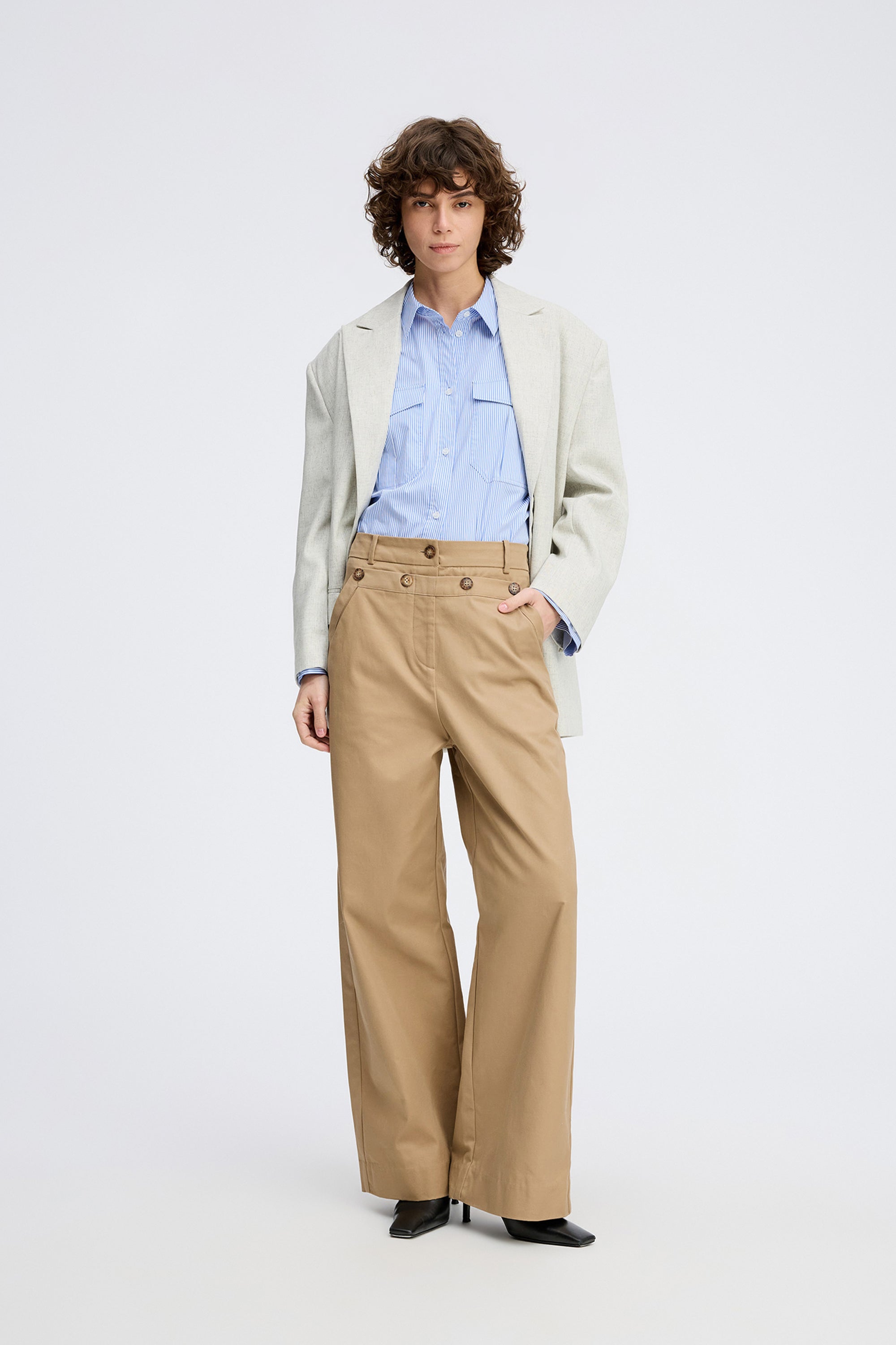 Stilfulde bukser i klassisk camel farve med brede ben. Designet med høj talje og unikke knapdetaljer foran, der giver et moderne twist til et tidløst look.