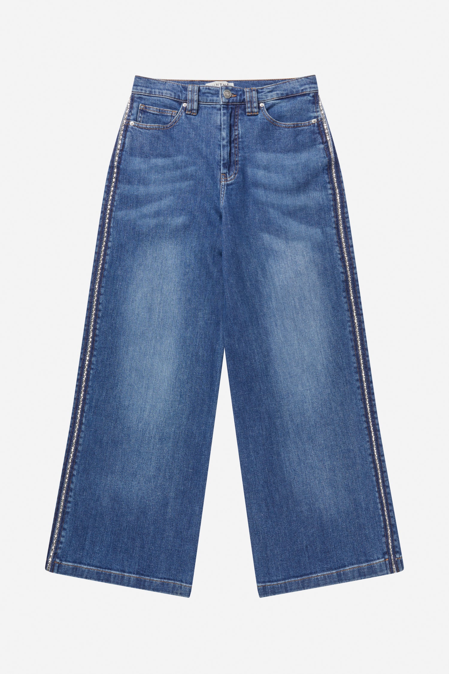 Elegante brede jeans med en smuk simili kontrastsyning langs sidesømmen. Disse jeans har en broderet MUNTHE-emblem detalje på baglommen, bæltestropper og lukkes med lynlås og knap.