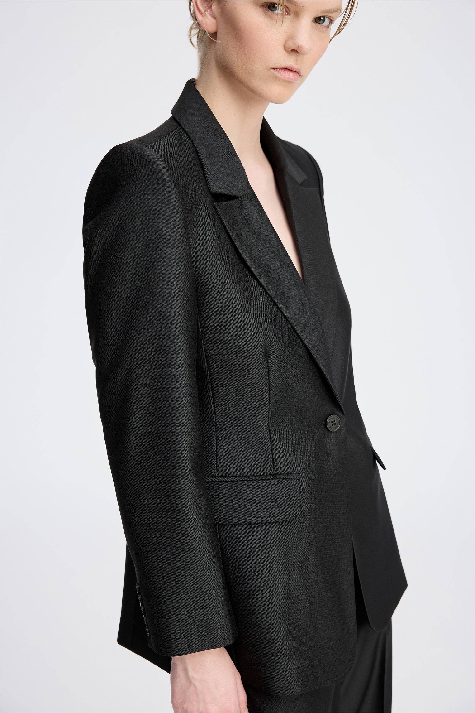 Elegant blazer i smukt glat vævet materiale. Designet med klassisk revers, enkel knaplukning og klaplommer foran. Den let figursyede pasform giver et sofistikeret og tidløst udtryk.