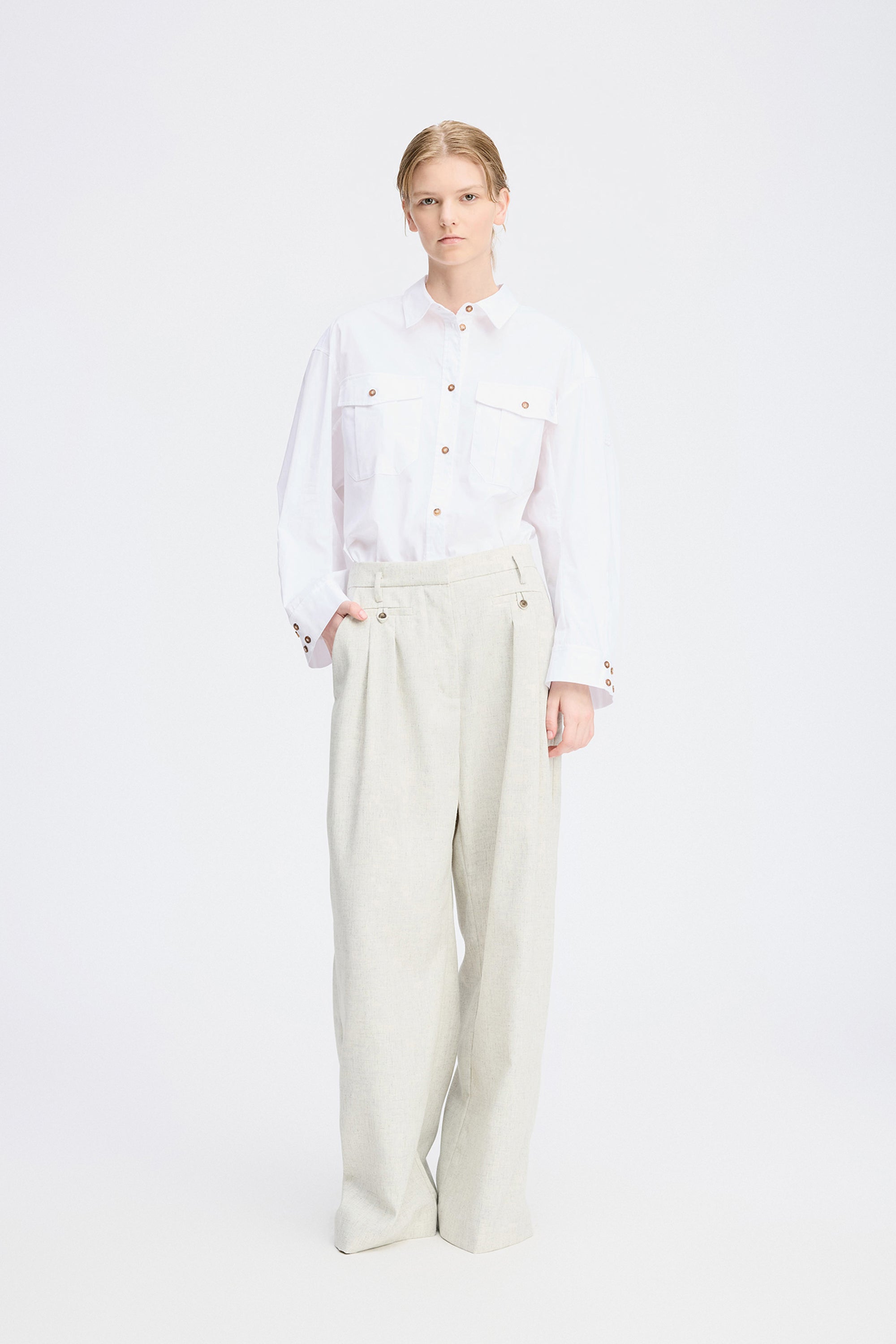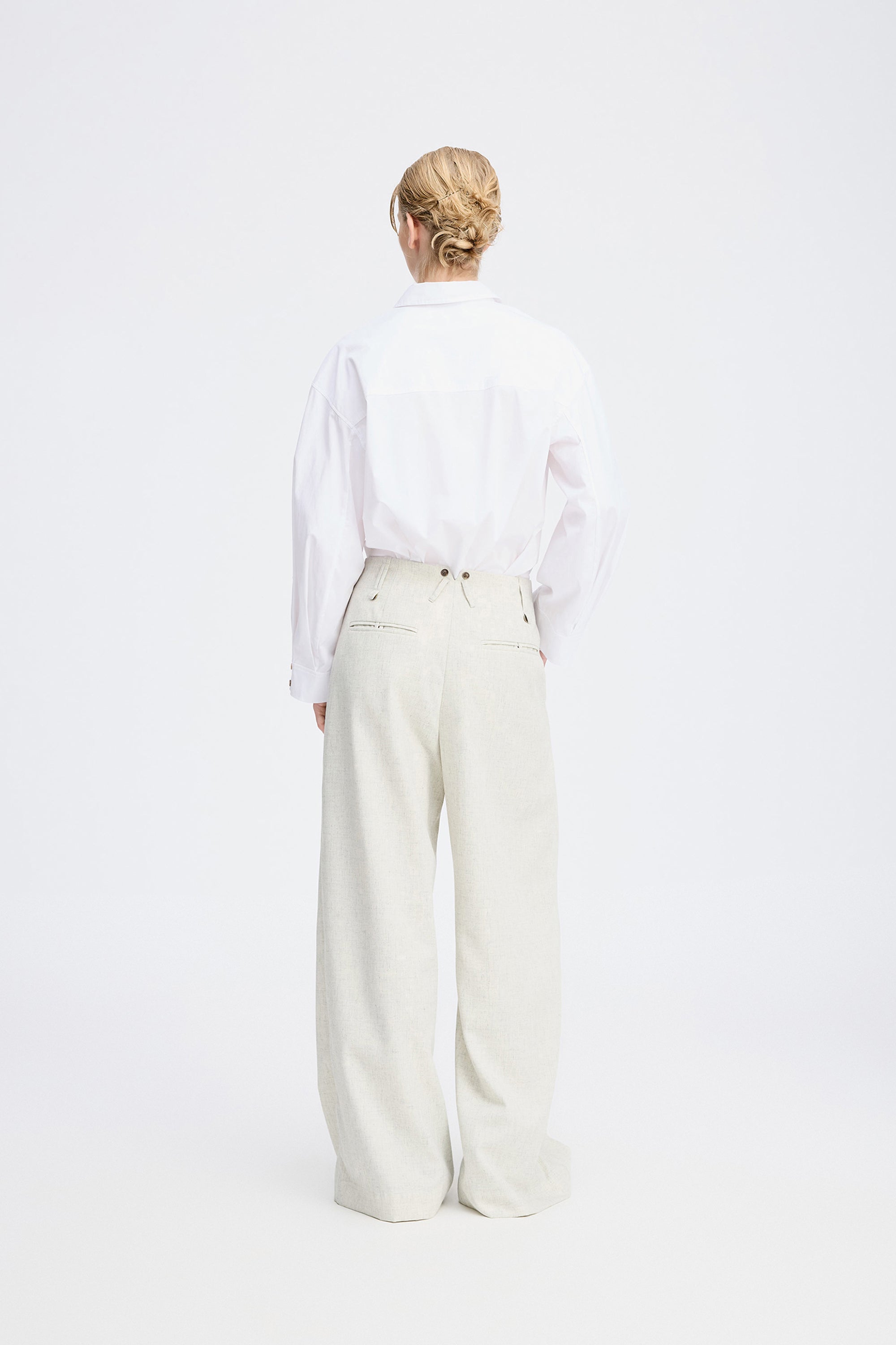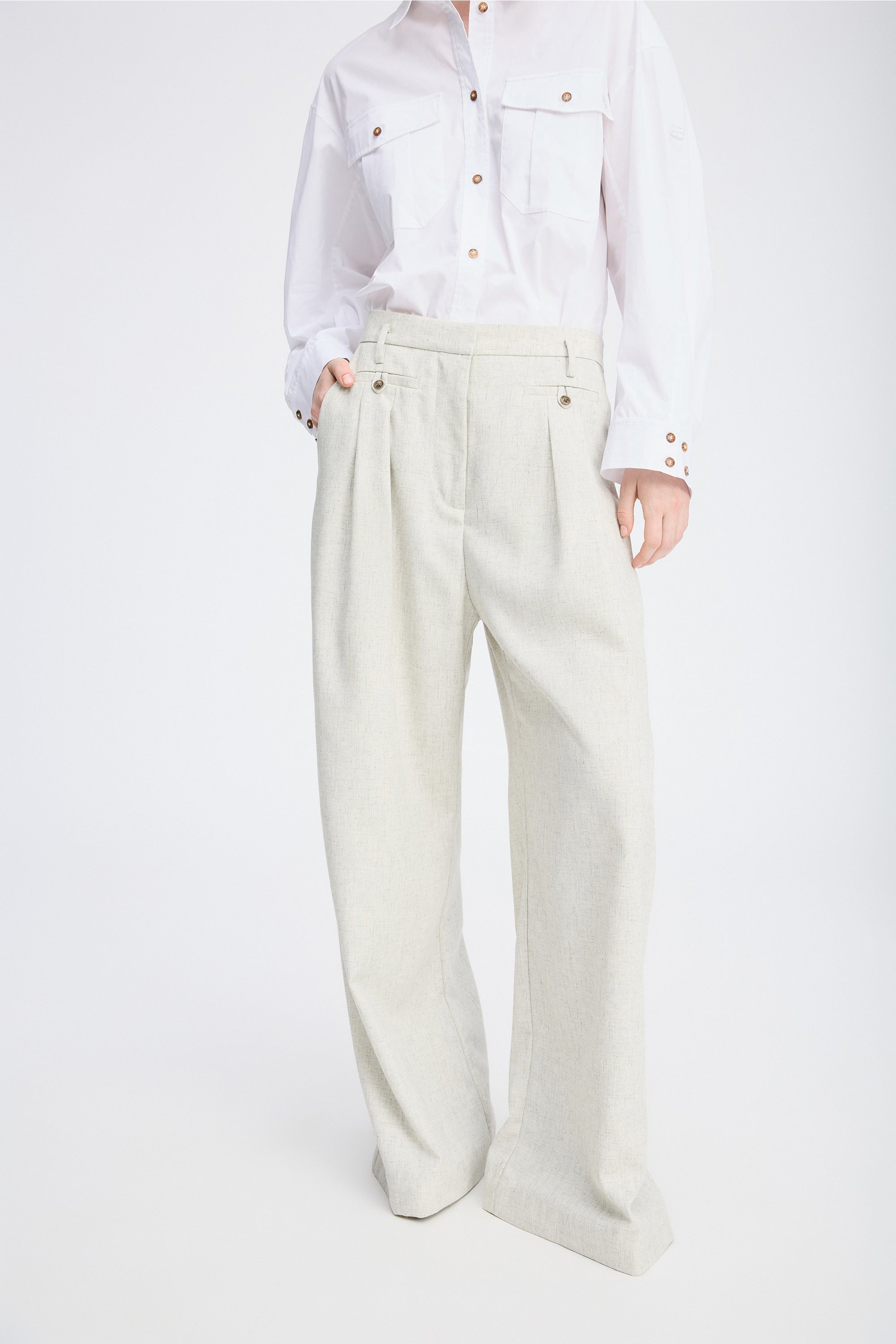 Elegante, lyse bukser i en strukturvævet kvalitet med brede ben. Designet med høj talje, pressefolder, skrålommer og paspolerede baglommer med knap.