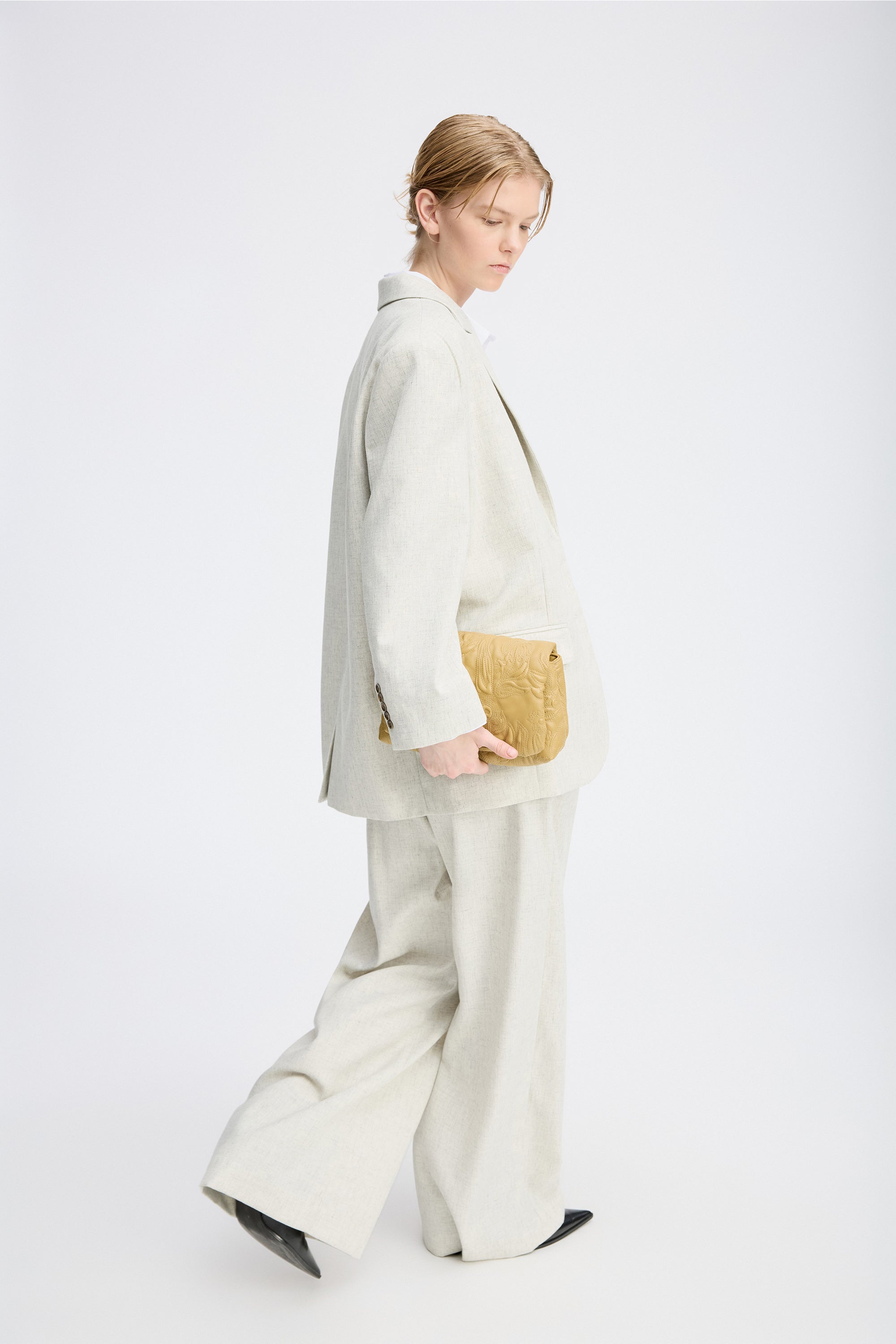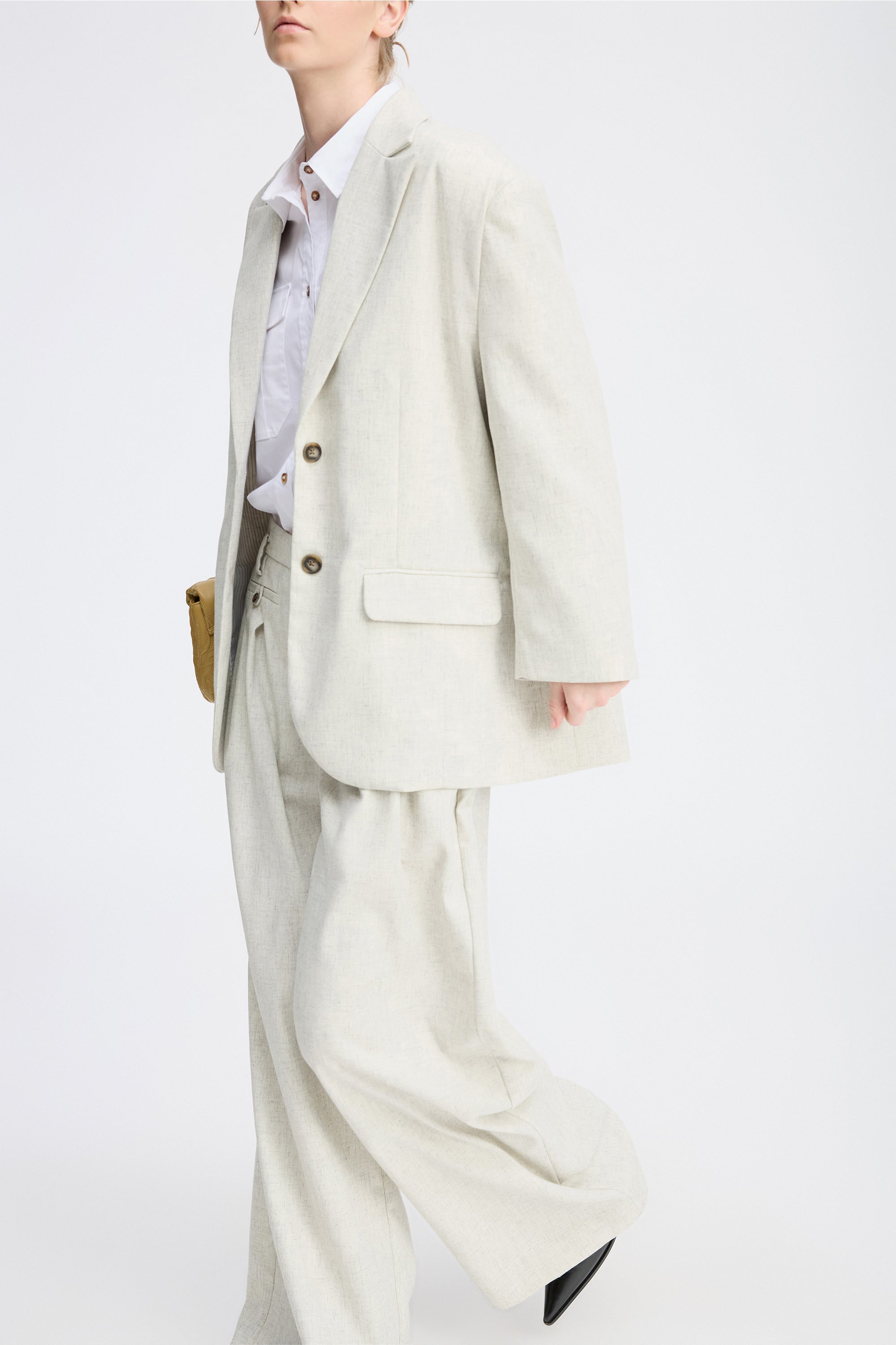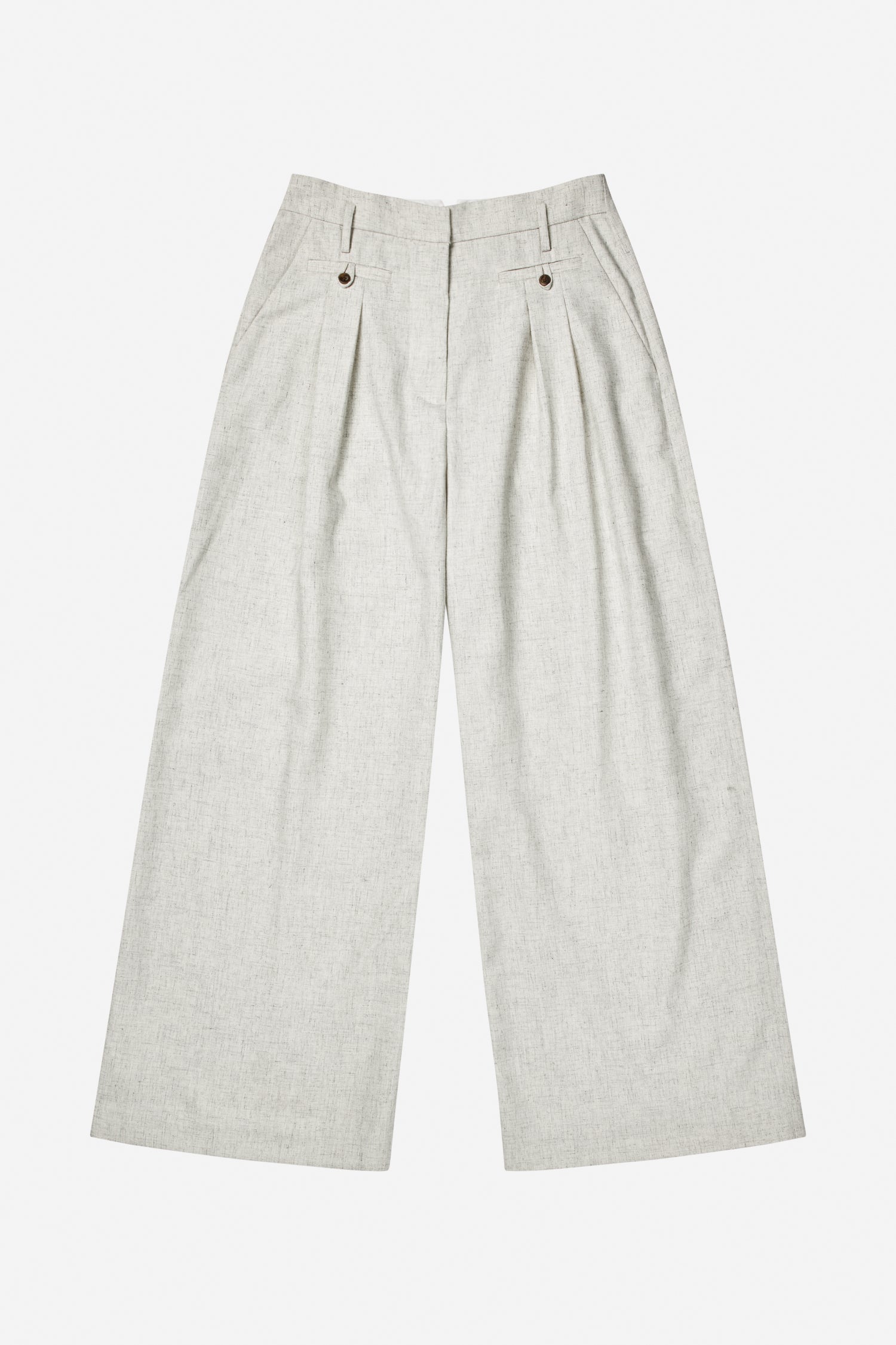 Elegante, lyse bukser i en strukturvævet kvalitet med brede ben. Designet med høj talje, pressefolder, skrålommer og paspolerede baglommer med knap.