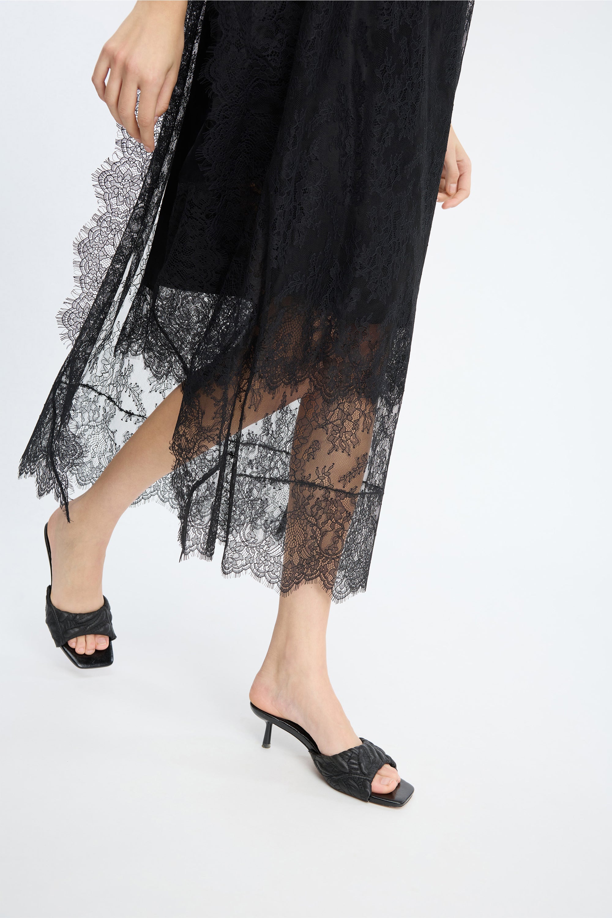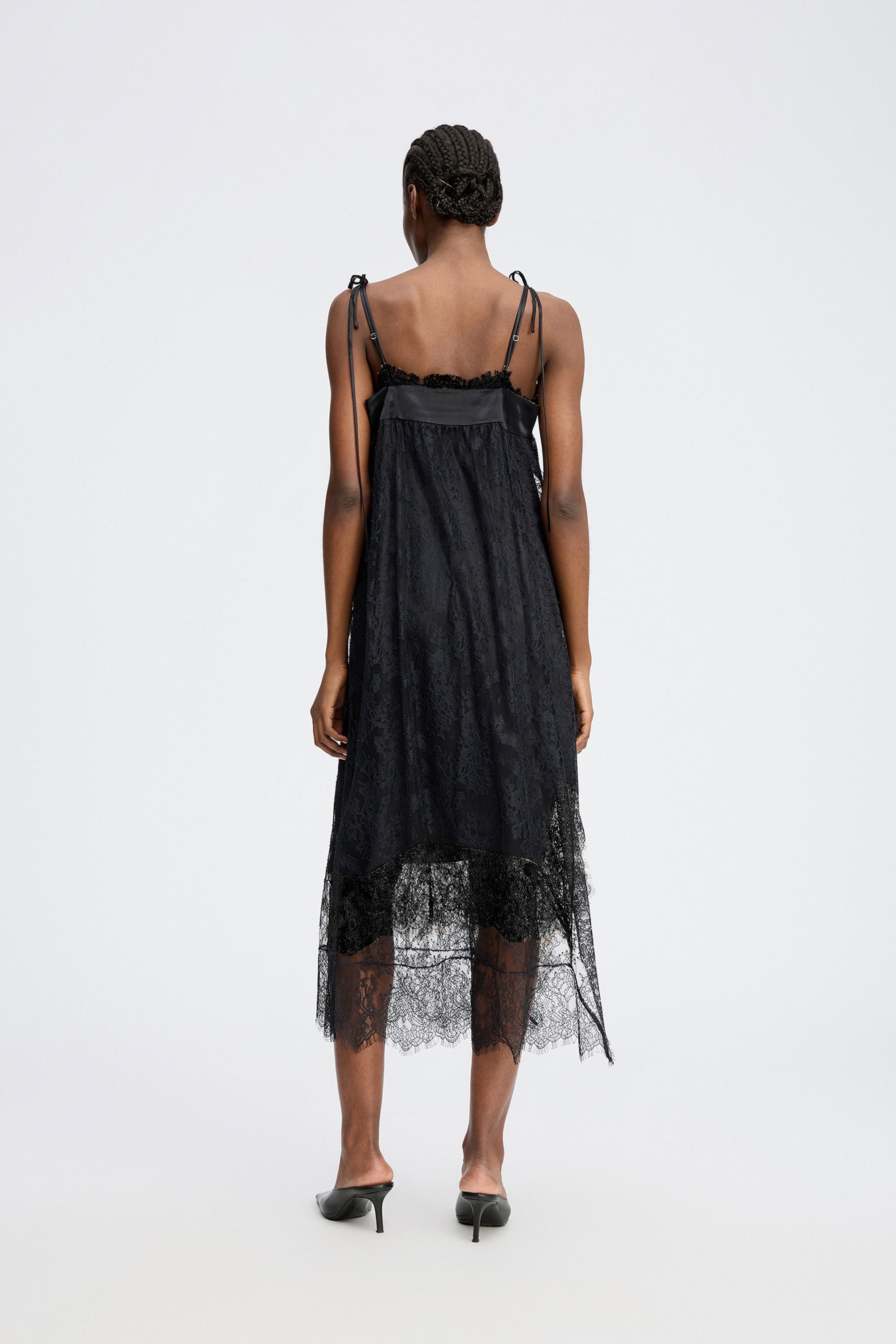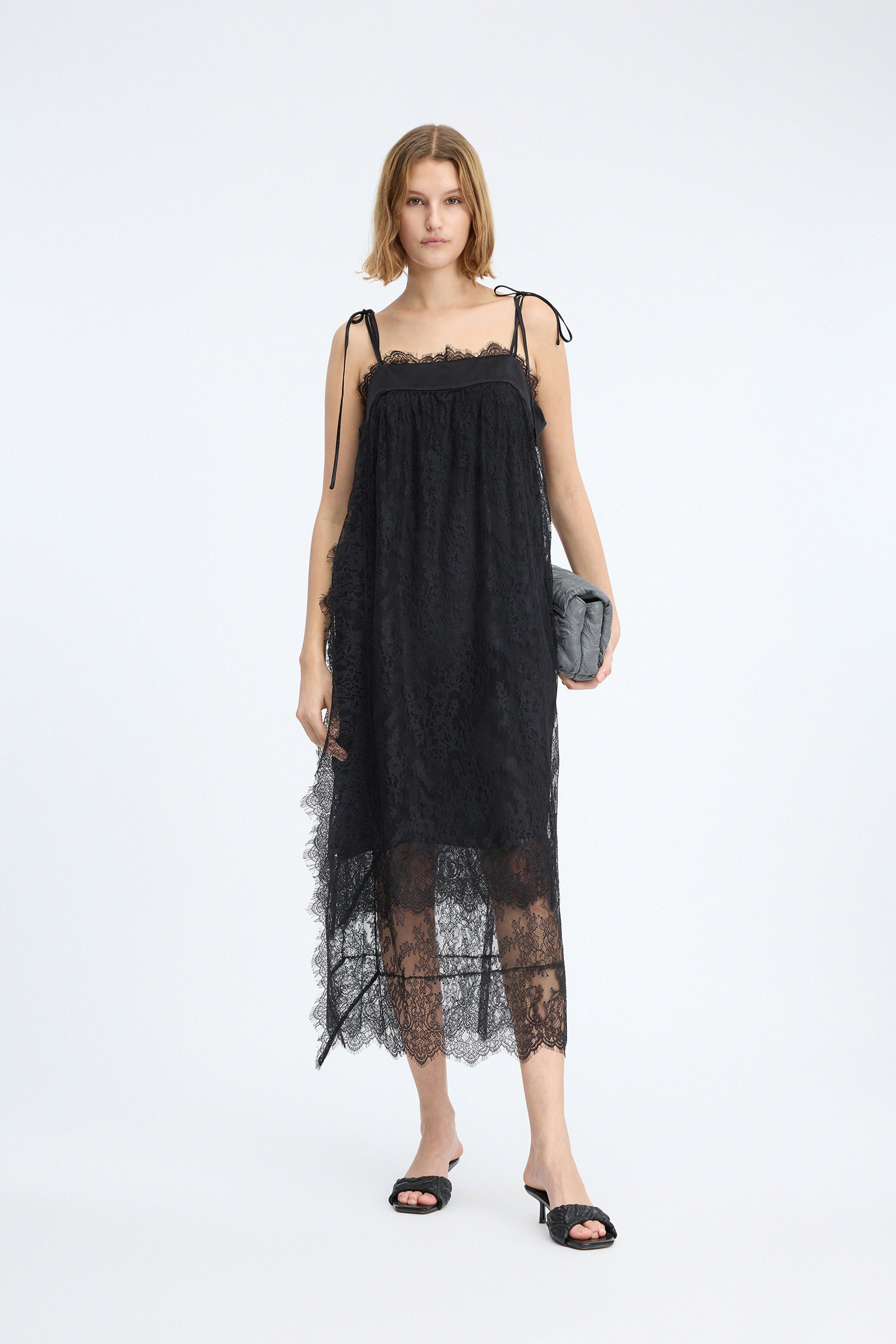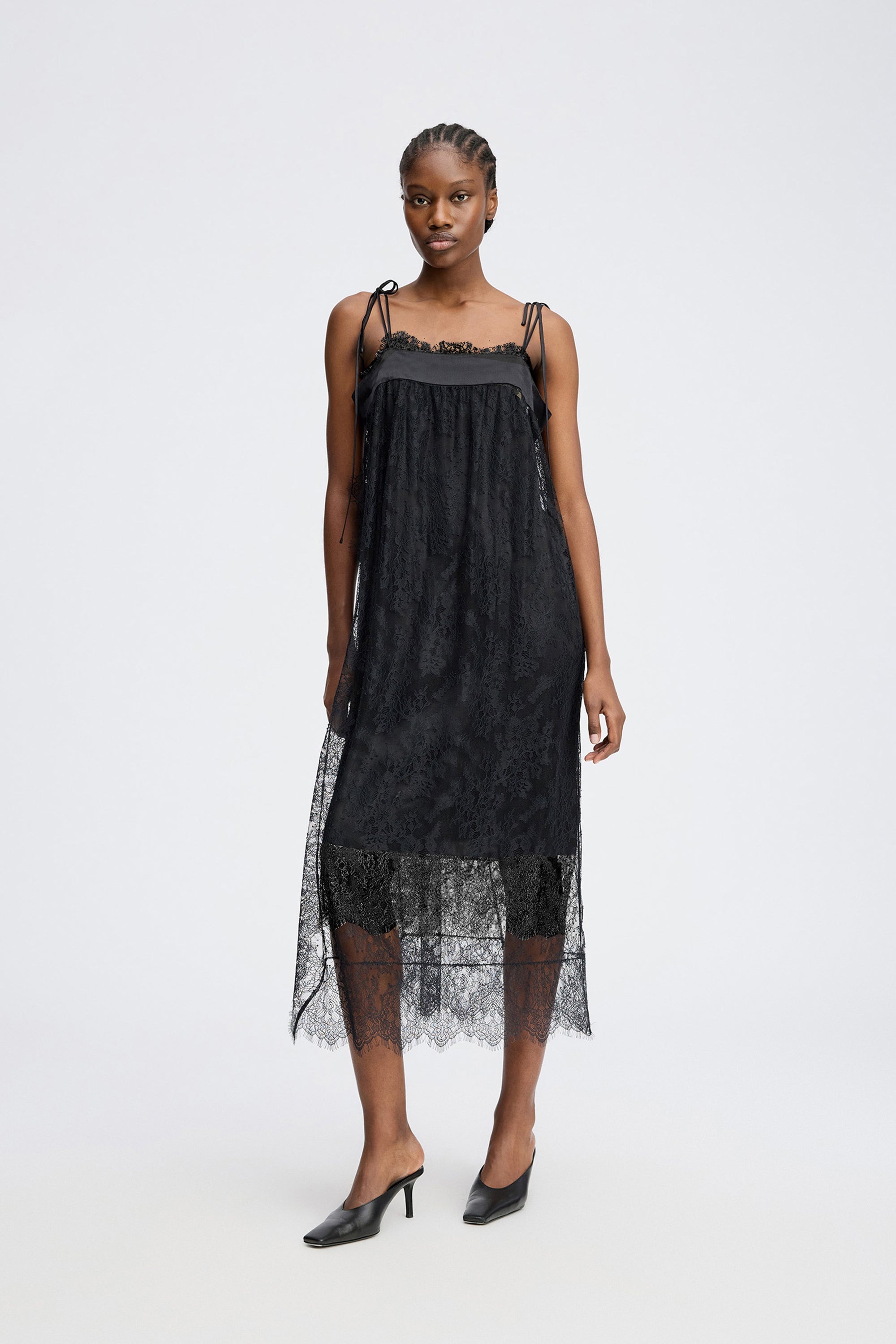 Smuk blondekjole med et elegant bånd i udskæringen og fine bindebånd på skuldrene. Kjolen er designet med en med asymmetrisk blonde kant. Denne alsidige kjole kan styles med og uden underkjole.