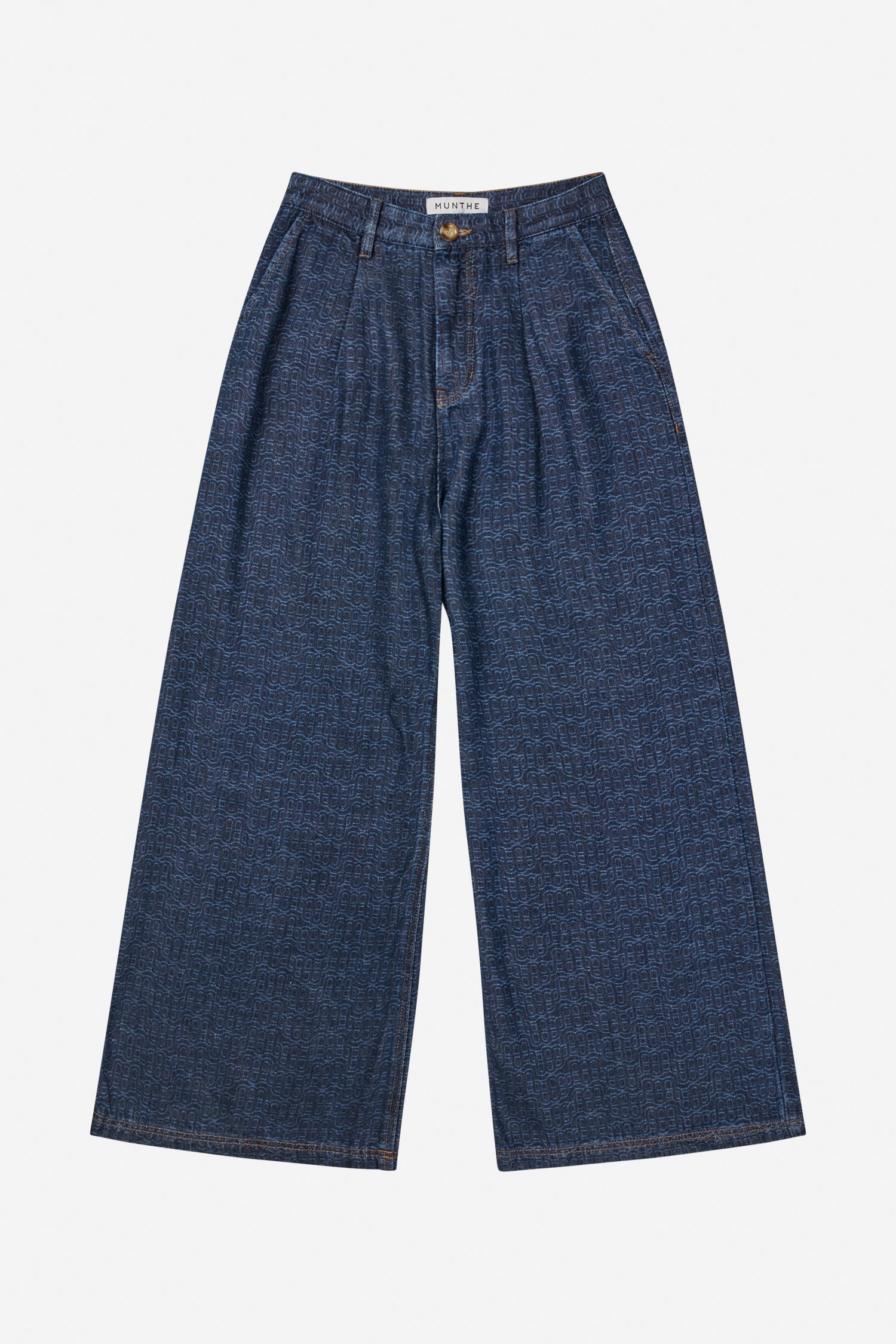 Jeans i blød denim med et diskret, indvævet MUNTHE-emblem i matchende blå nuancer. Bukserne er designet med brede ben, høj talje, skrålommer og klassisk lukning med knap og lynlås.