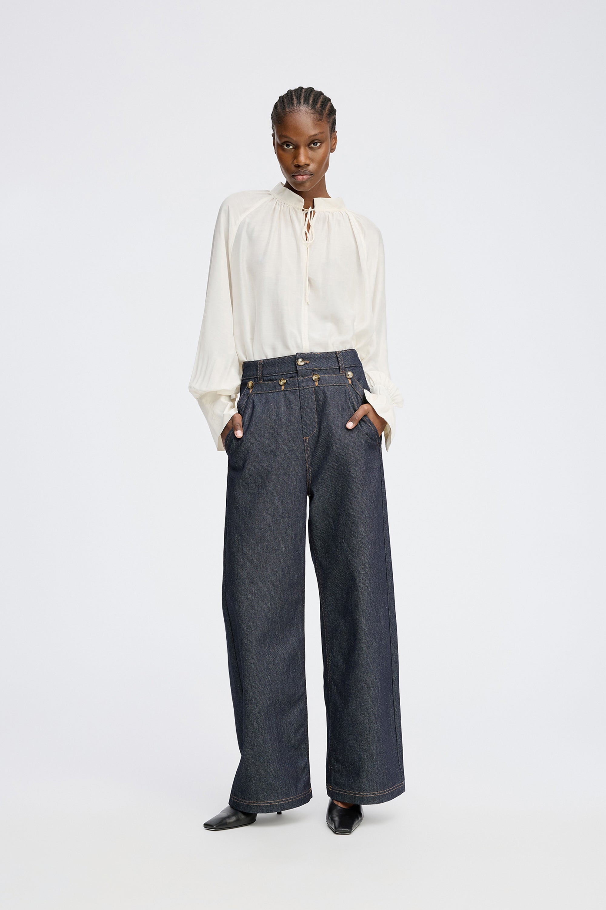 Elegant bluse, designet i let og luftig kvalitet. Blusen har lange ærmer med brede manchetter, en løs pasform samt bindebånd i halsen.